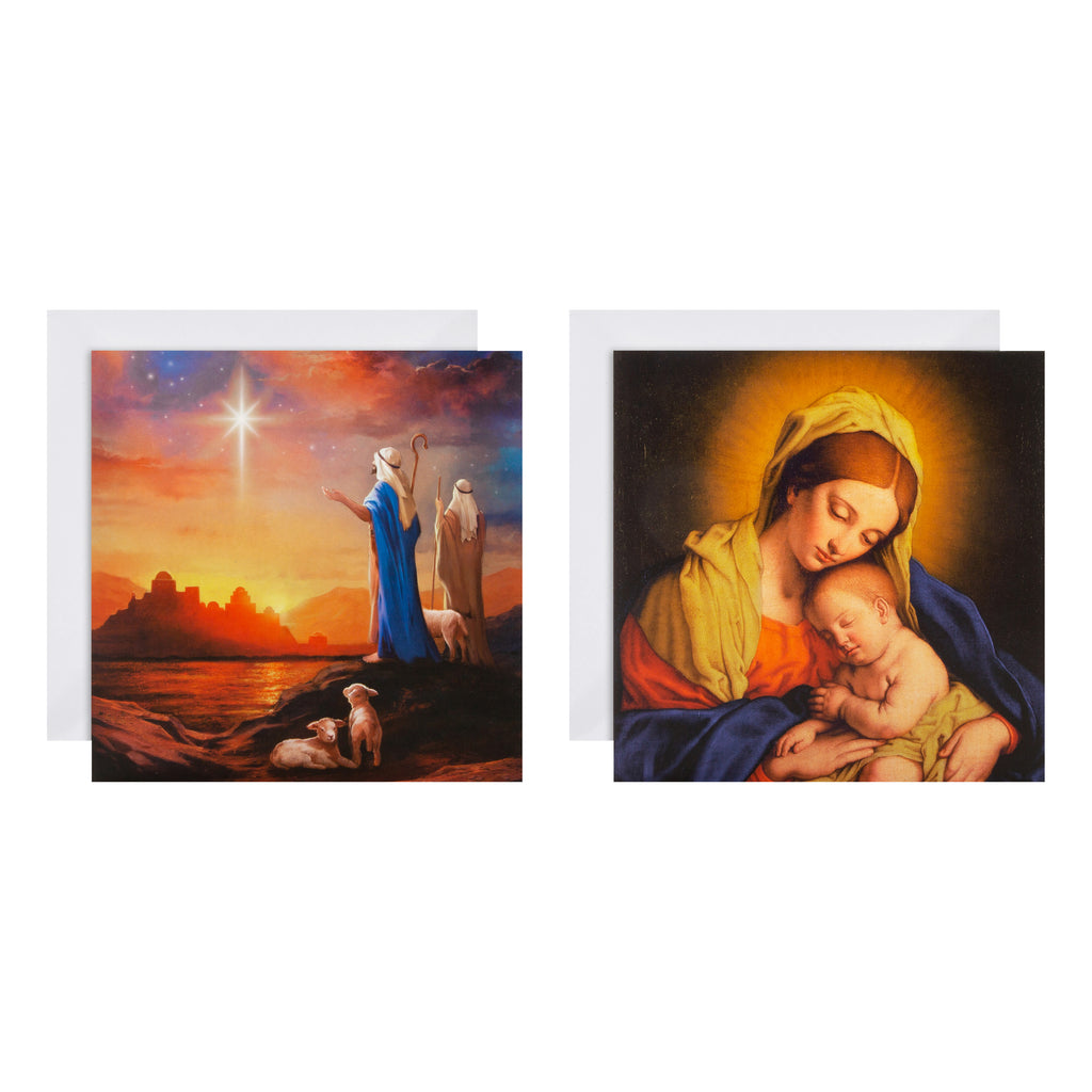 Printed on high-quality board, these cards feature 2 religious designs of the nativity shepherds and Madonna and child, a gloss finish and come complete with co-ordinating white, Hallmark branded envelopes.
