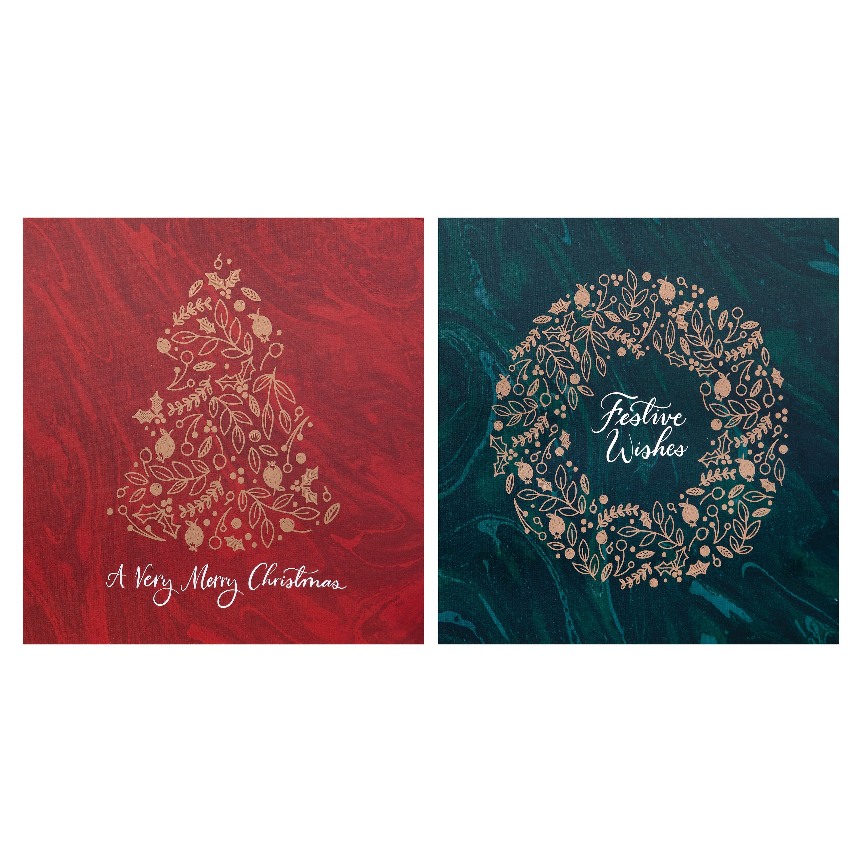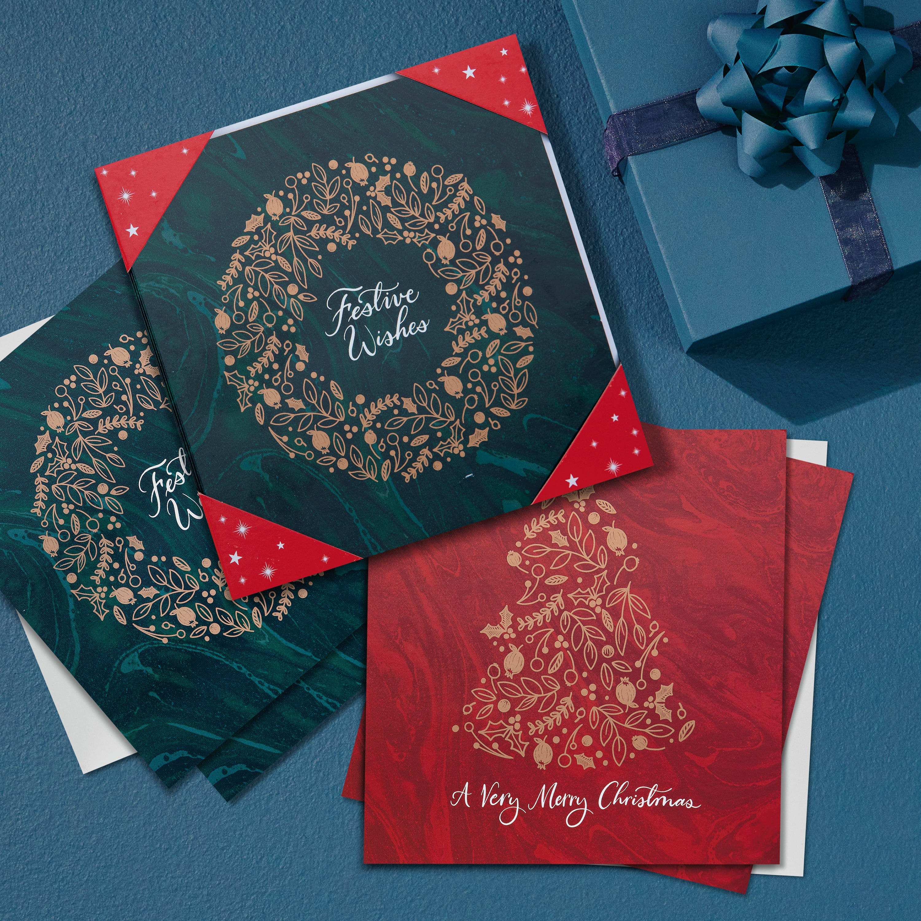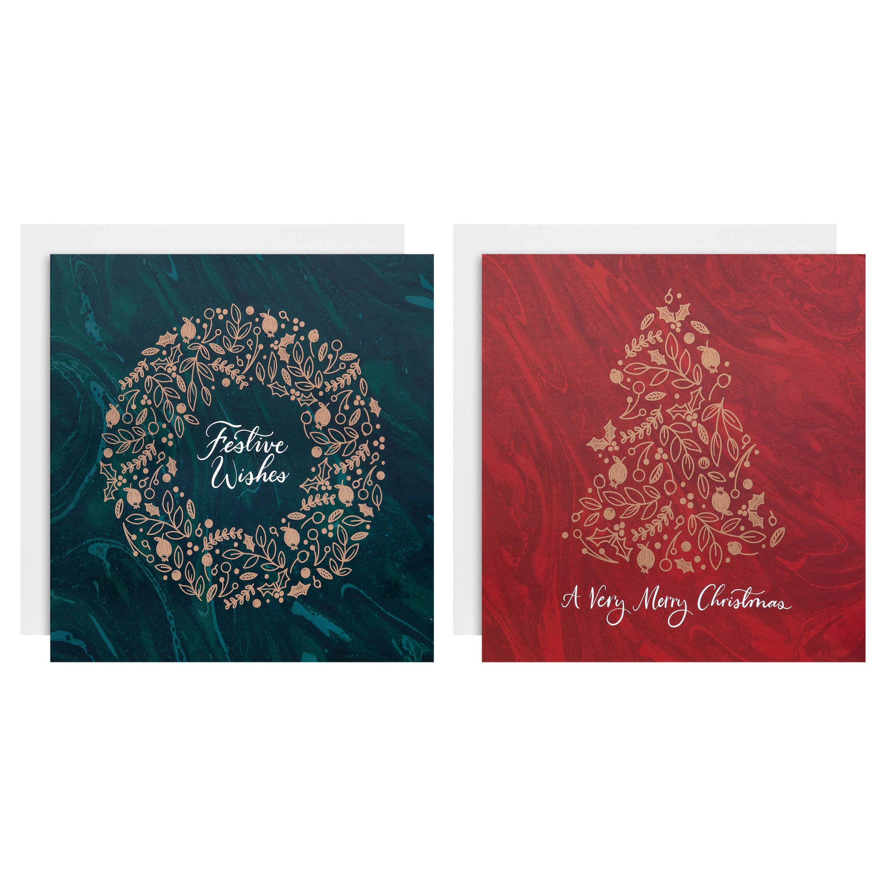 Printed on high quality board, this pack of 10 Christmas cards features metallic gold foil details, and comes in 2 elegant festive designs. The first design features a green background with a gold-foiled festive wreath and the message, 'Festive Wishes' in the centre, and the second design features a red background with a gold-foiled Christmas Tree and the message 'A Very Merry Christmas'. Each card comes complete with a Hallmark branded, white envelope.