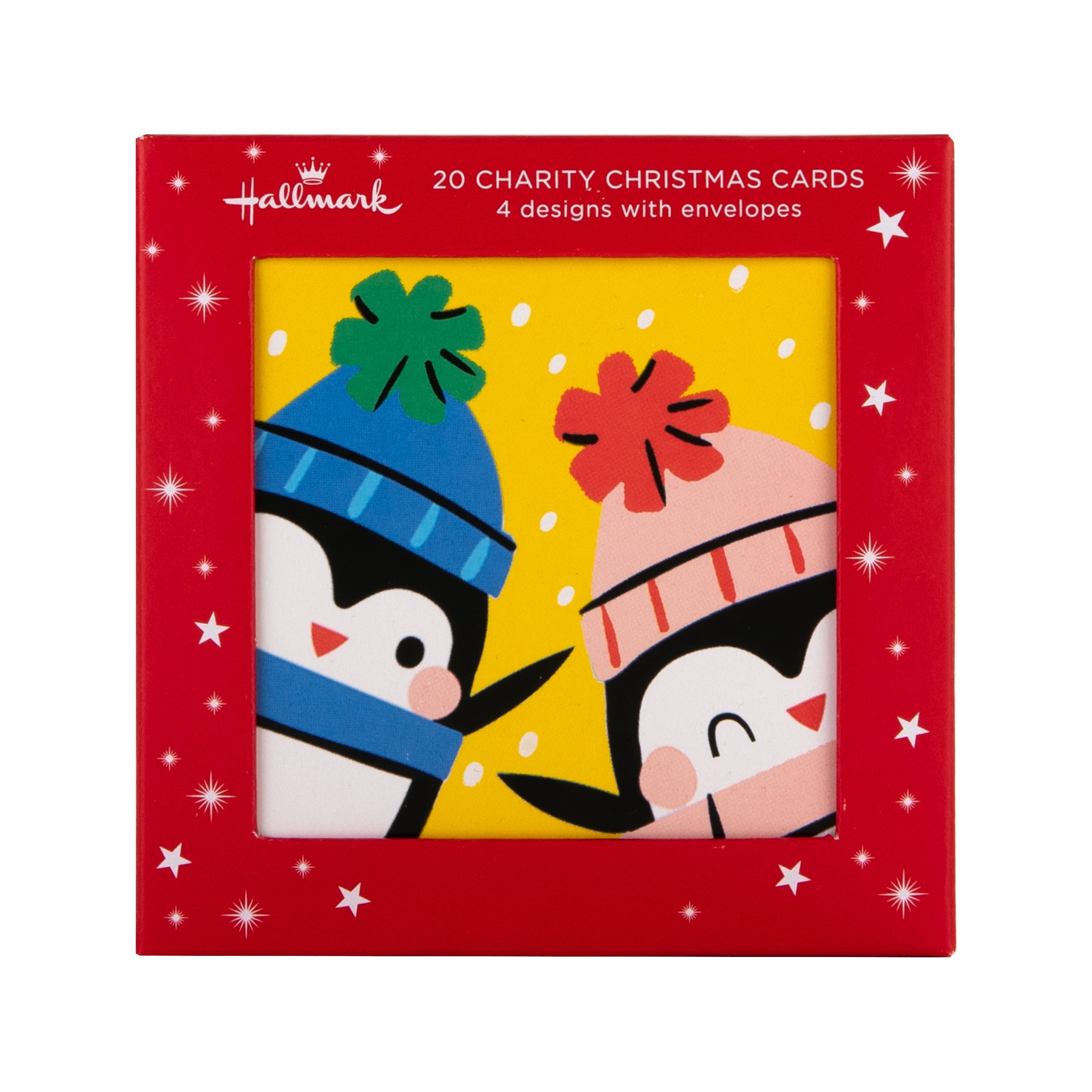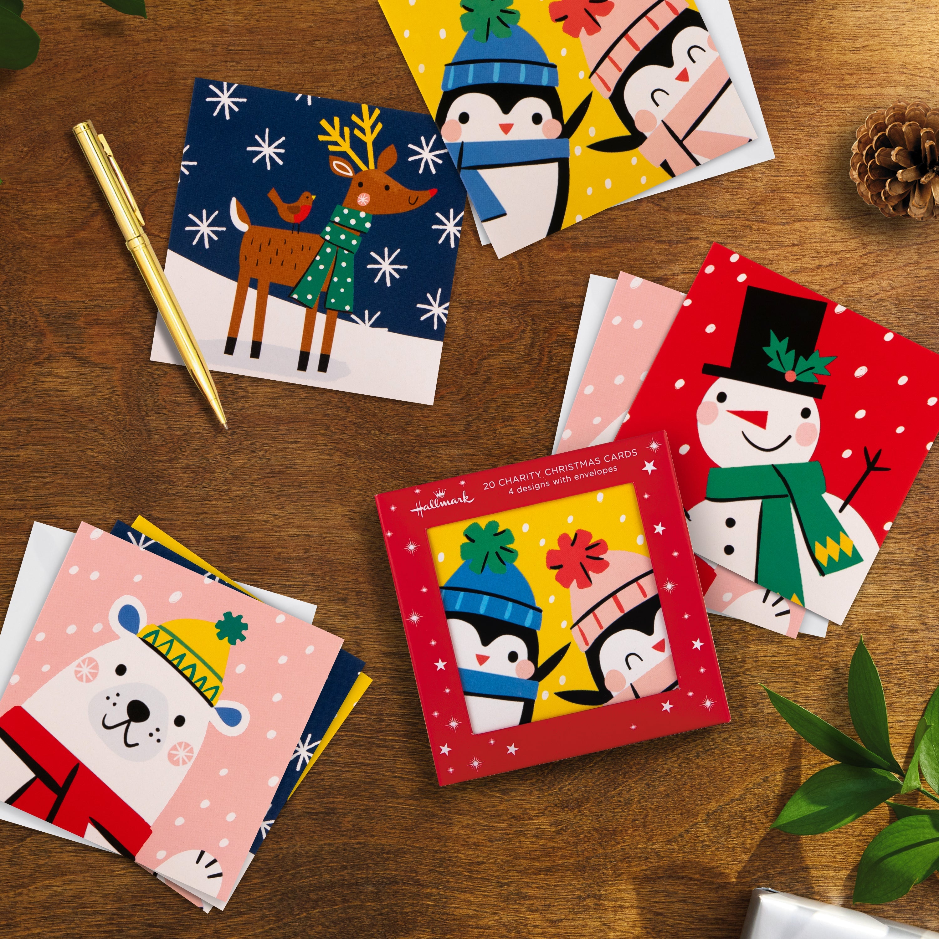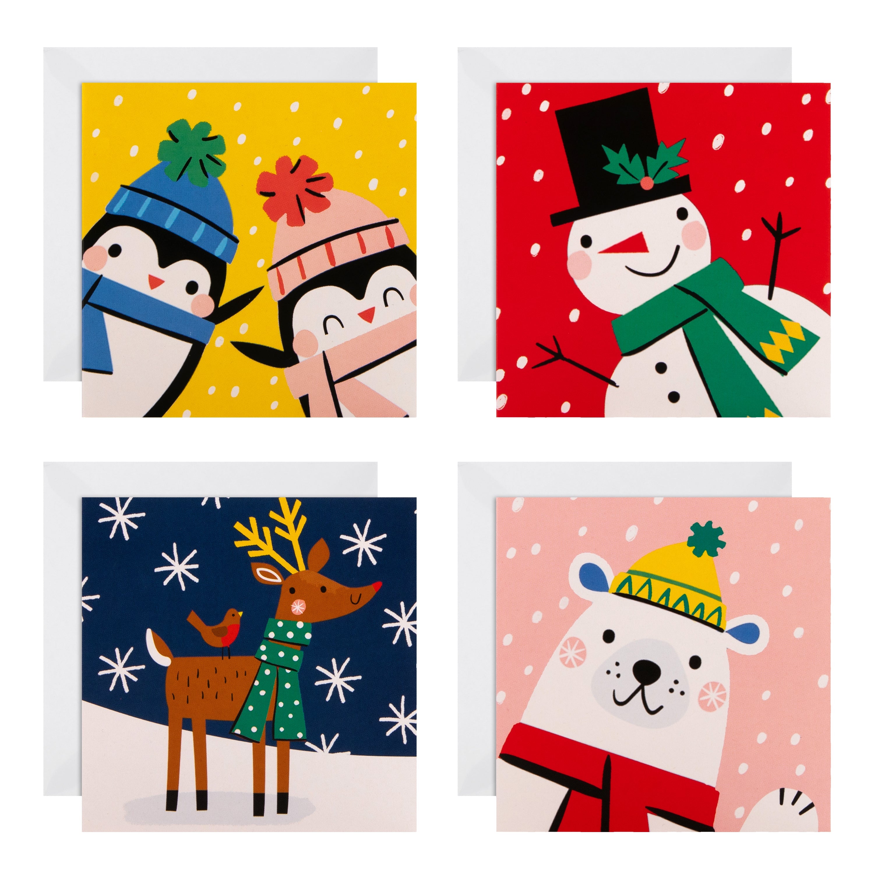 Printed on high quality board, this pack of 20 Christmas cards comes in 4 cute designs. Design 1 features a yellow background with cute penguin design, Design 2 features a red background with cute snowman design, Design 3 features a navy blue background with a cute reindeer design and Design 4 features a pink background with a cute polar bear design. Each card comes complete with a Hallmark branded, white envelope.