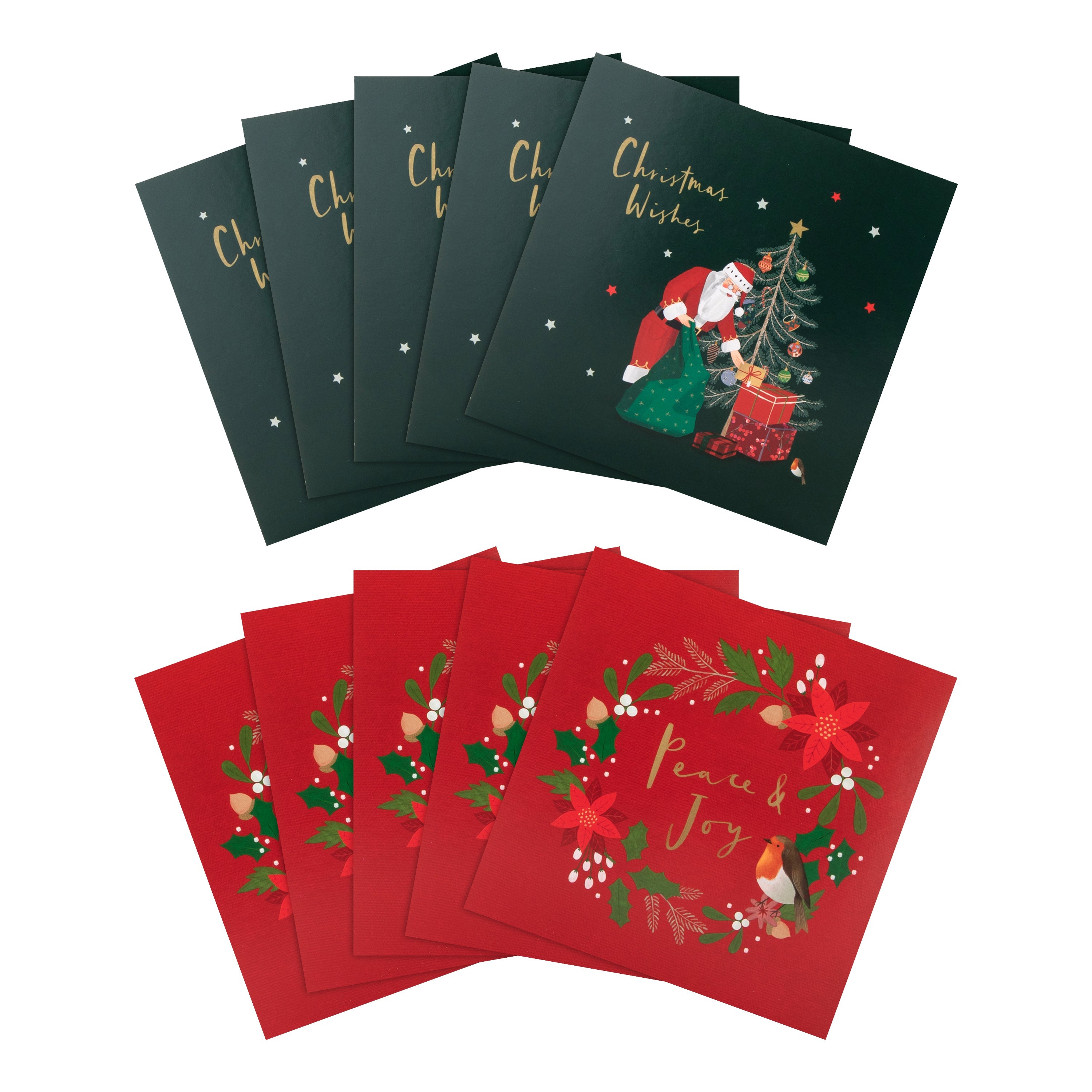 Printed on high-quality board, this pack of cards comes in 2 festive designs, 1 Santa design and 1 Wreath with a robin design, and comes complete with Hallmark branded, white envelopes.