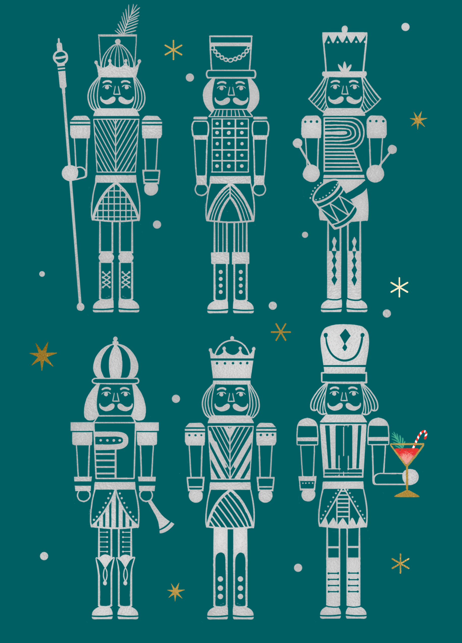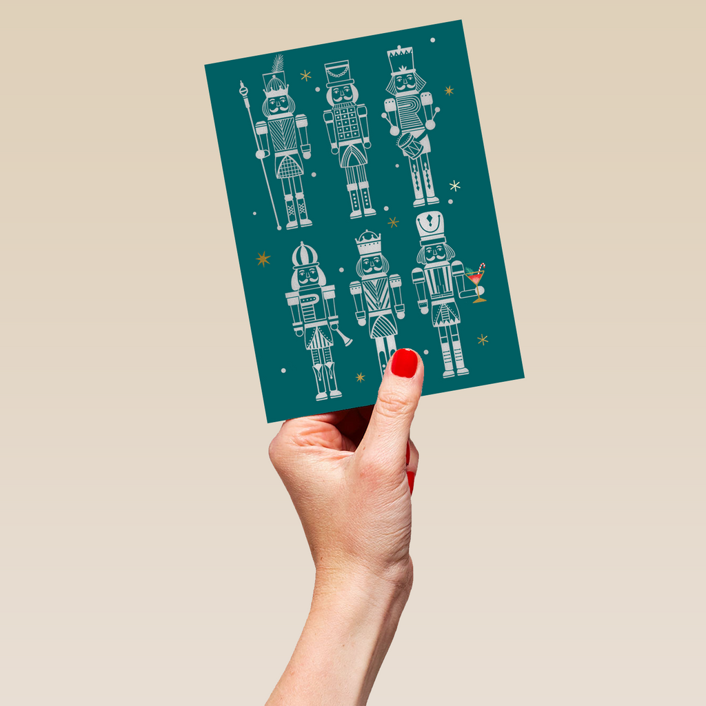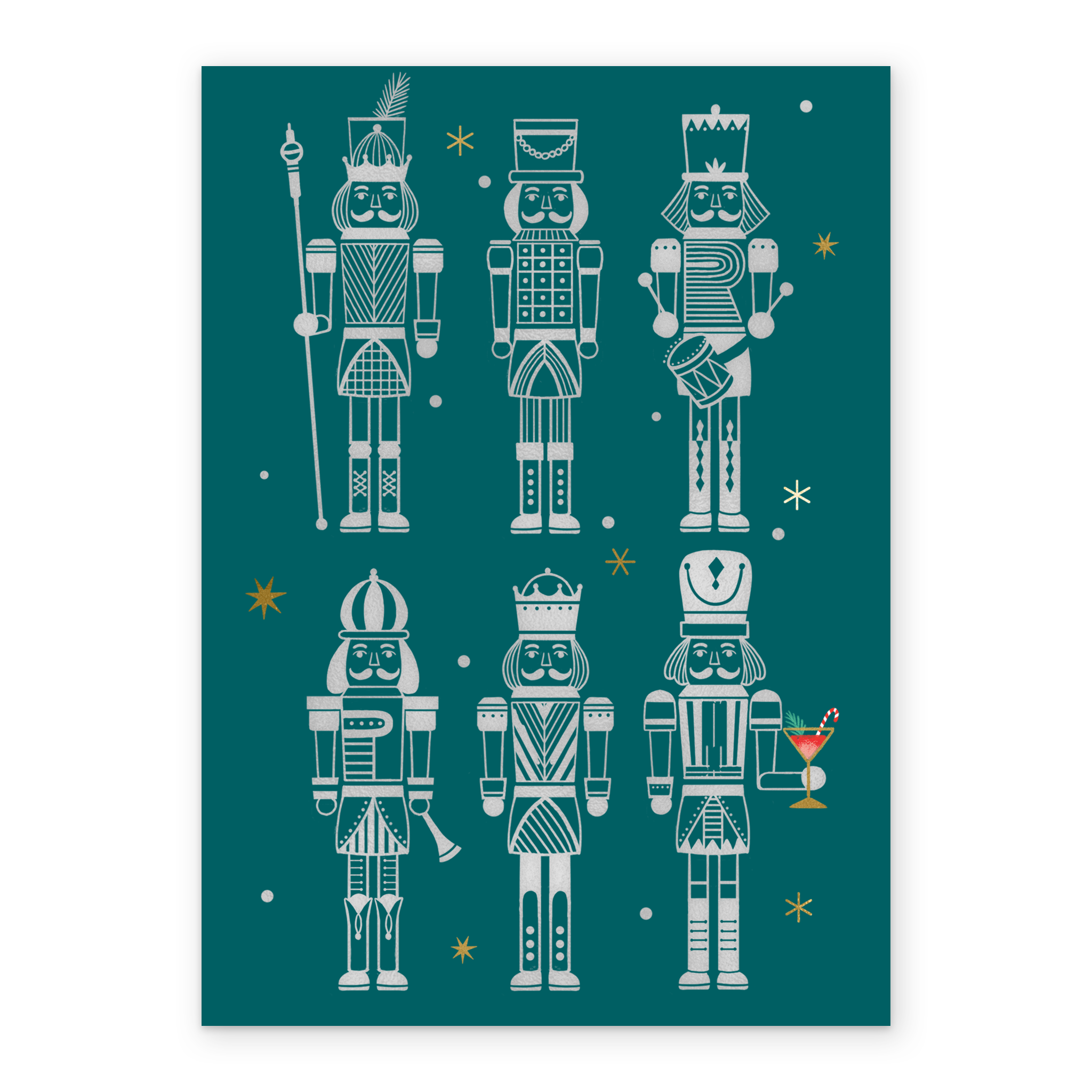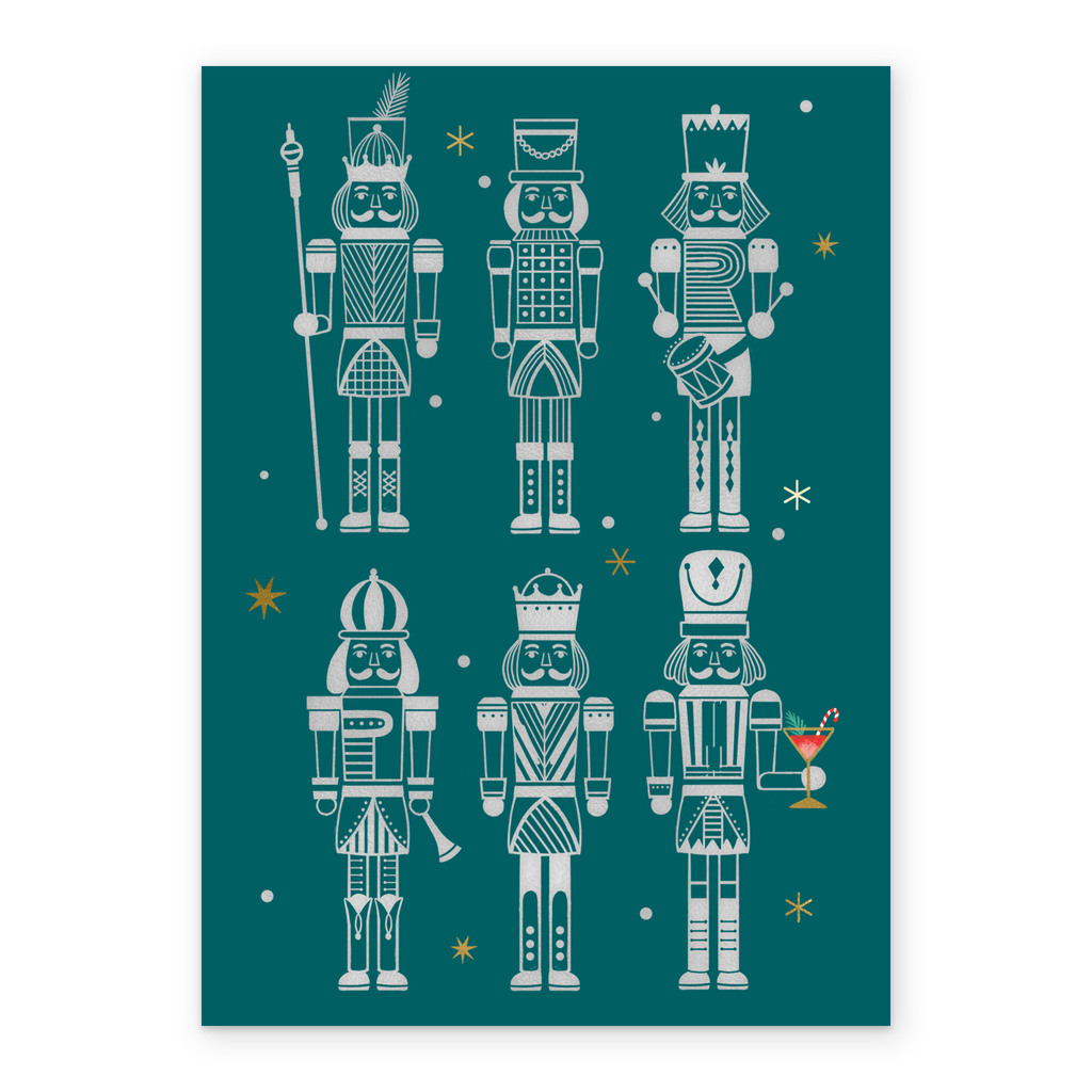 Printed on premium-quality board, this card features classic outline illustrations of Nutcrackers in their festive uniforms, and comes complete with a co-ordinating white envelope.