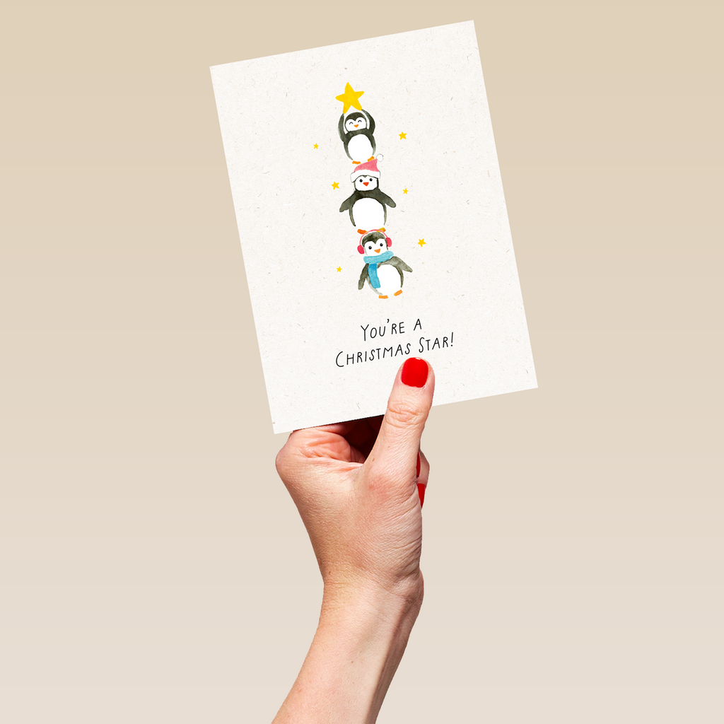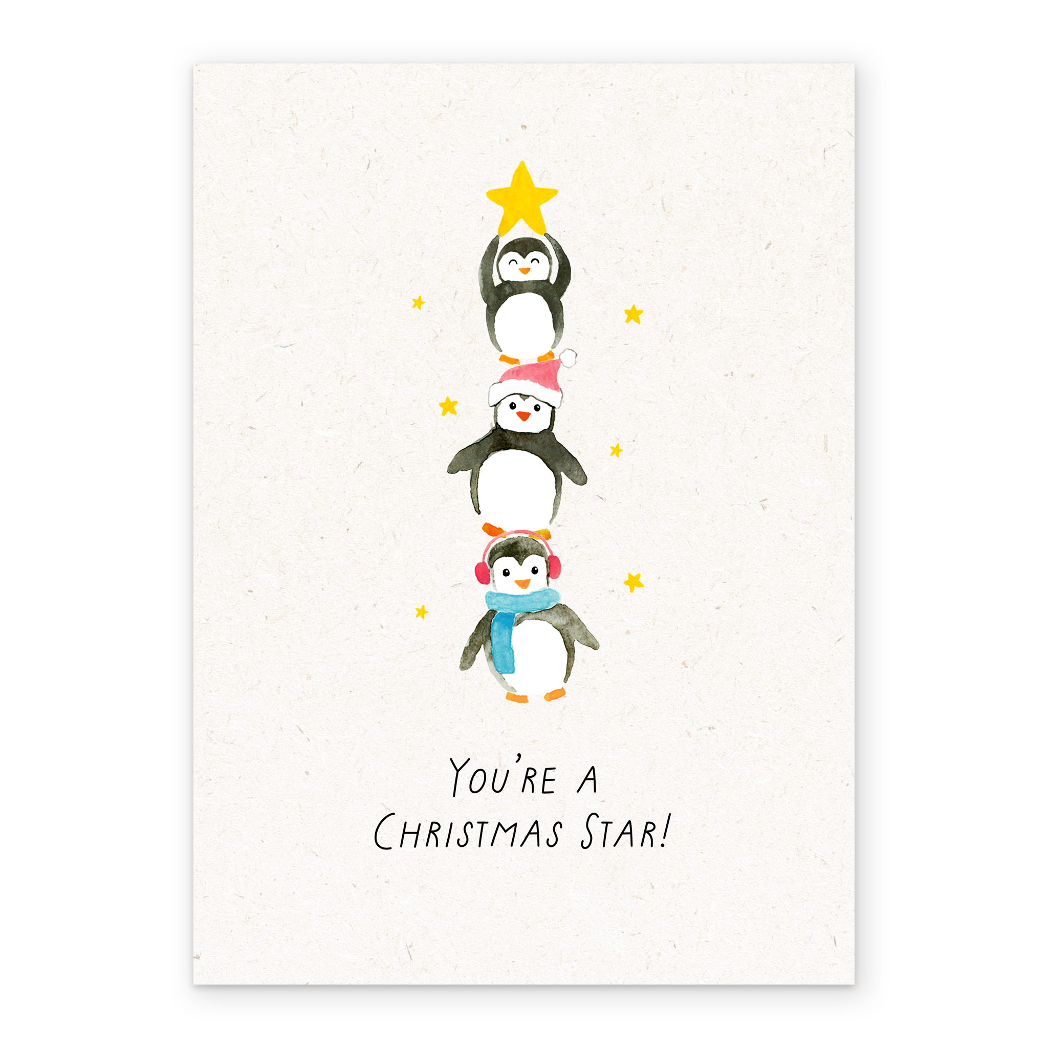 Printed on premium-quality board, this card features an illustration of cute penguins on each others shoulders, with the message 'You're a Christmas star!', and comes complete with a co-ordinating white envelope.