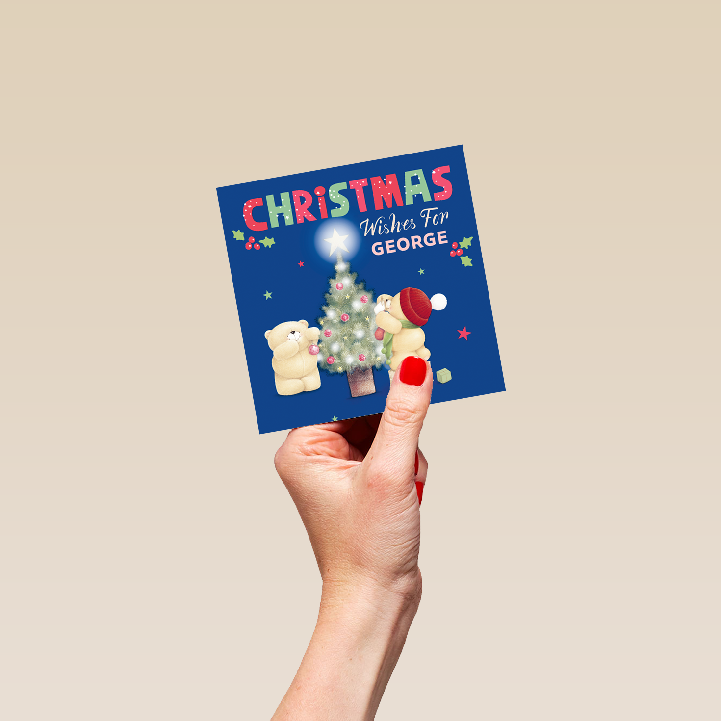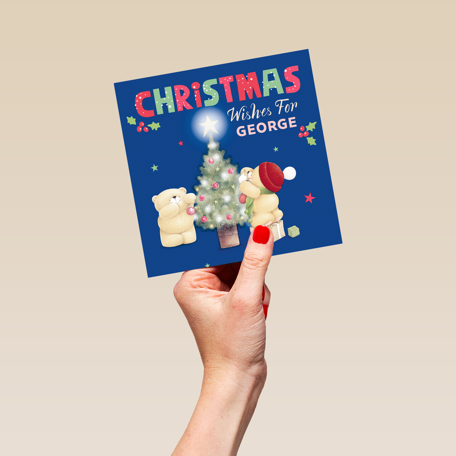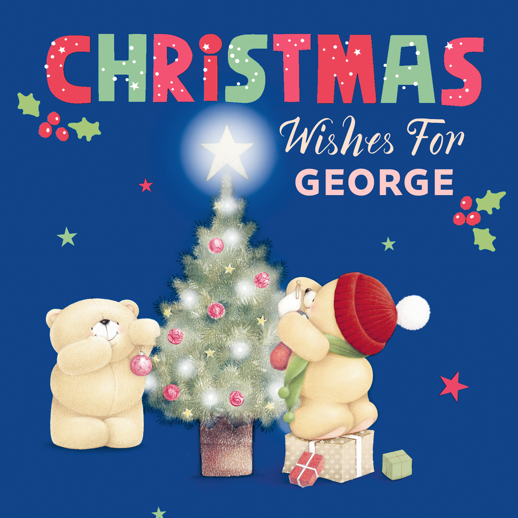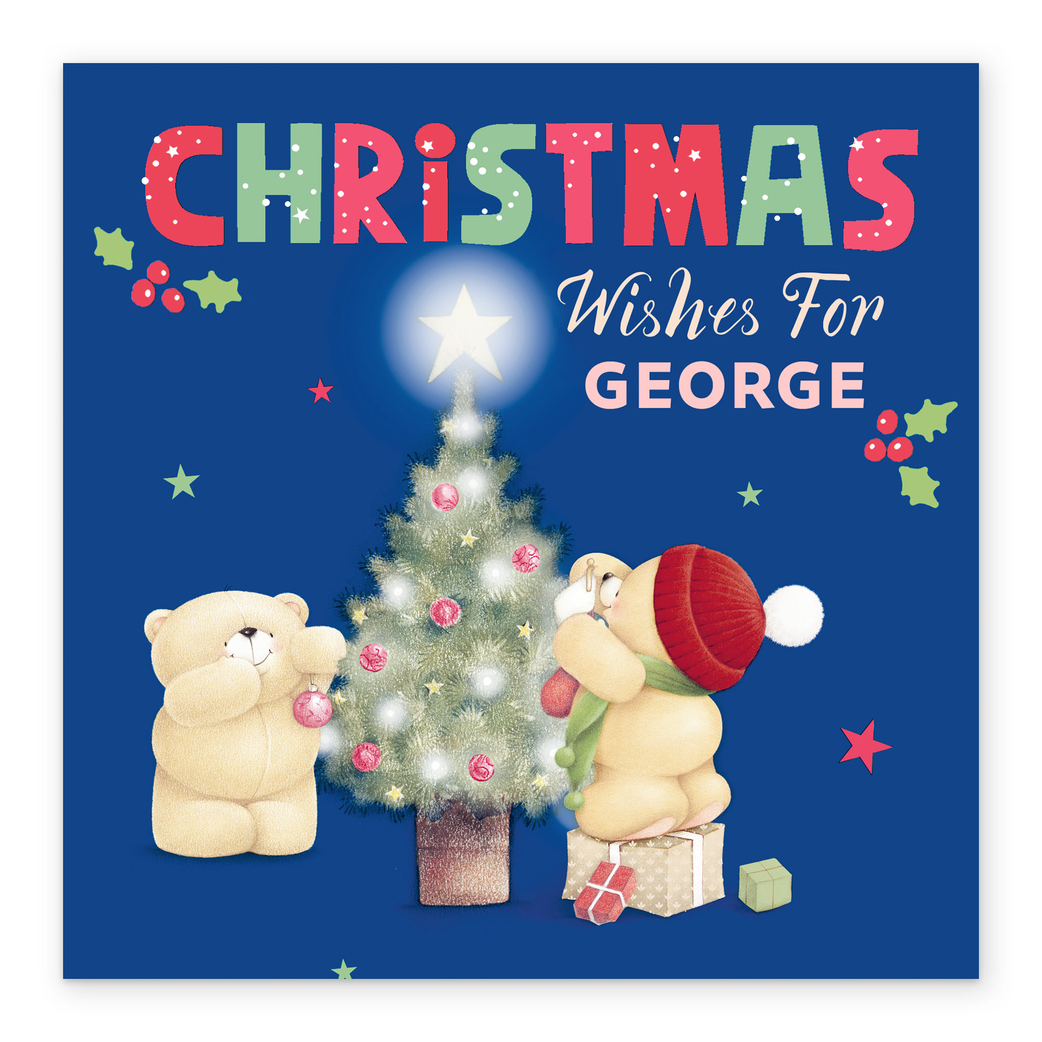 Printed on premium-quality board, this card features Hallmark's Forever Friends bears decorating a Christmas tree, with the message 'Christmas Wishes for [Name]', space to personalise a name, and comes complete with a co-ordinating white envelope.
