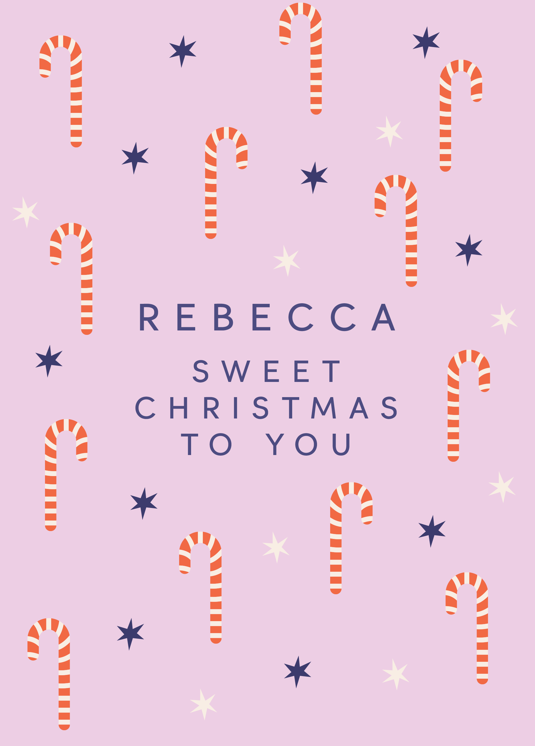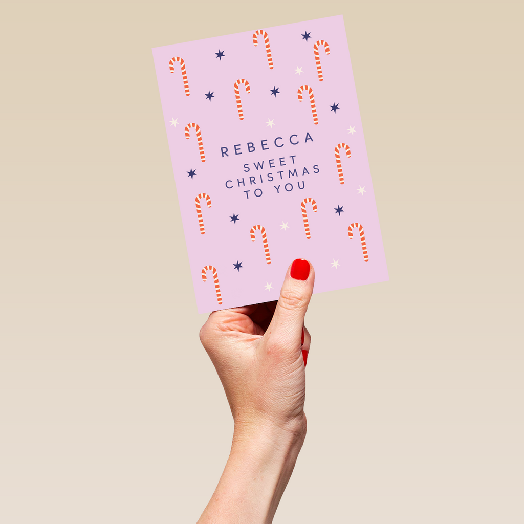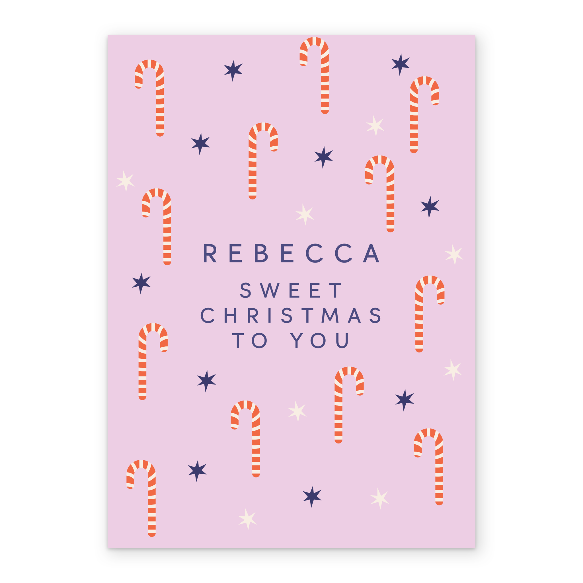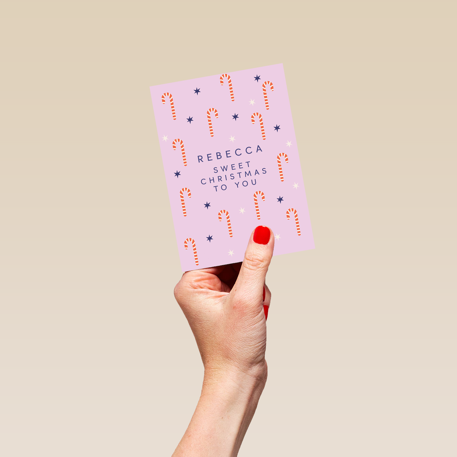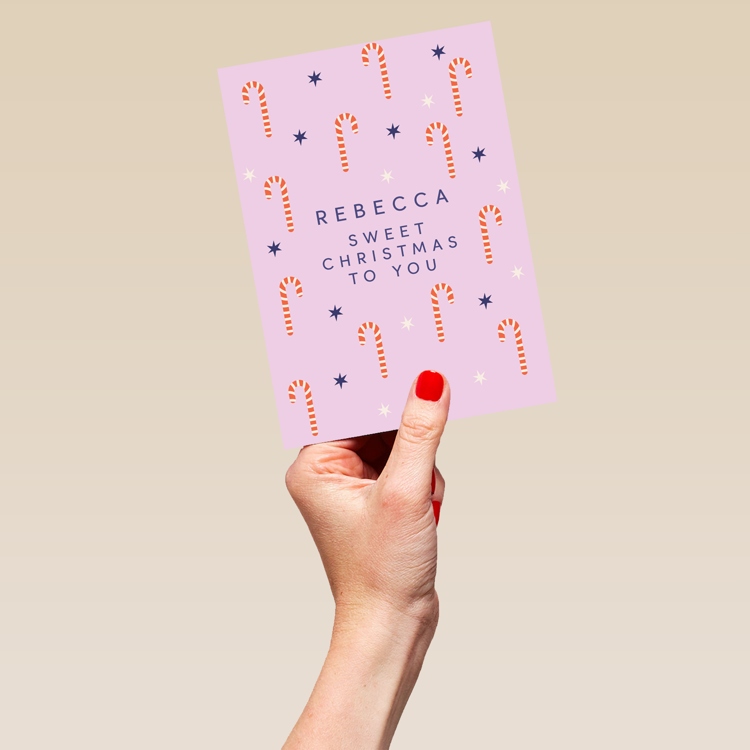 Printed on premium-quality board, this card features candy canes on a pink background, with the message 'Sweet Christmas to you', space to personalise a name, and comes complete with a co-ordinating white envelope.