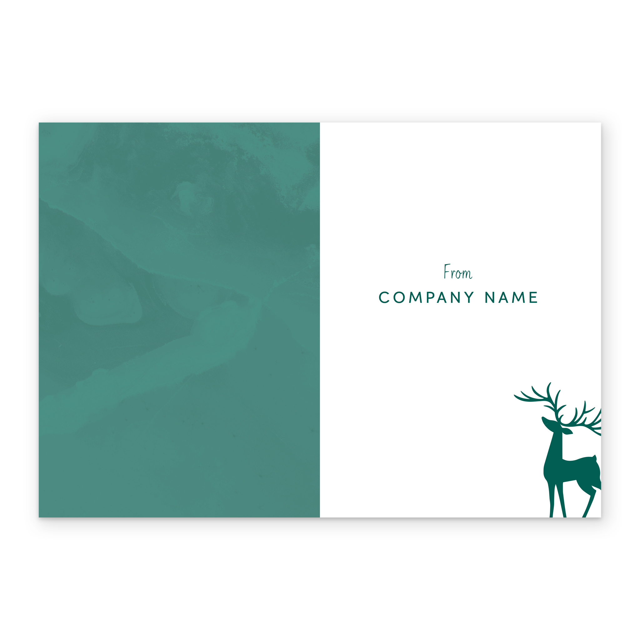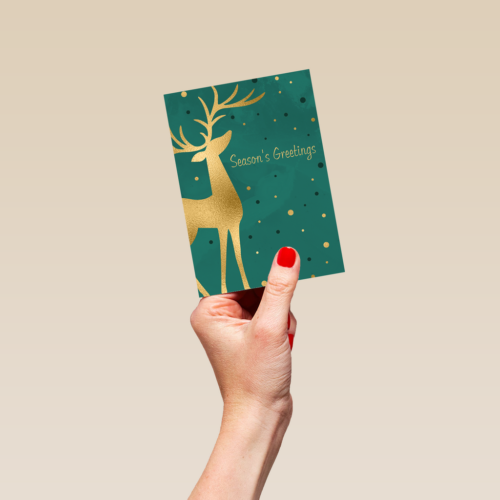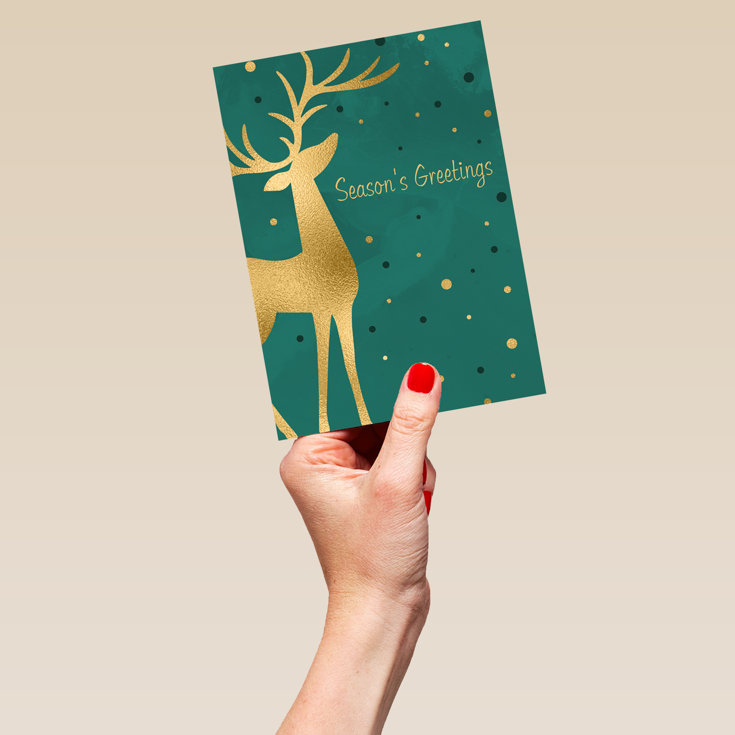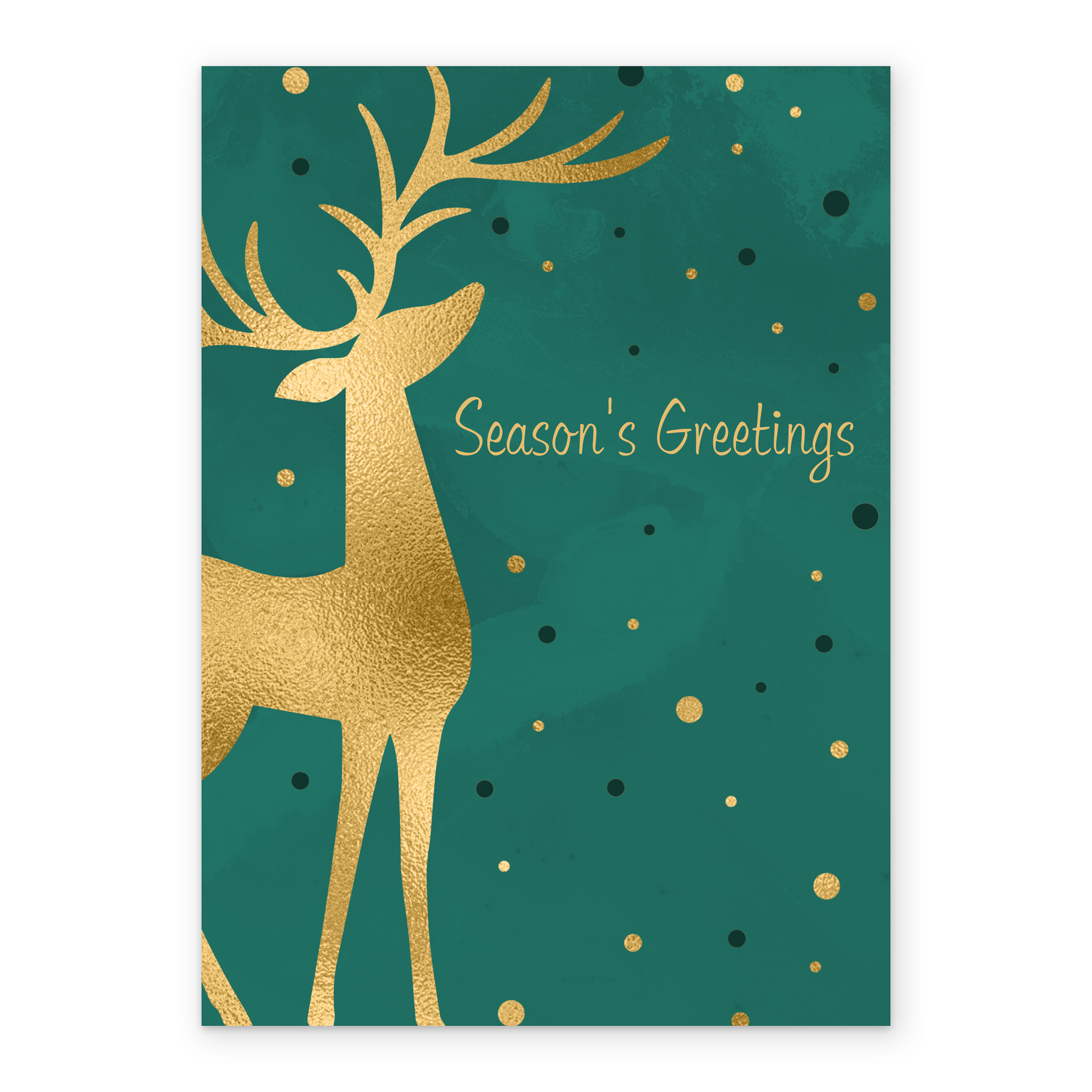 Printed on premium-quality board, this card features a gold-coloured reindeer silhouette with a snowing background, with the message 'Season's Greetings', space to personalise a name, and comes complete with a co-ordinating white envelope.
