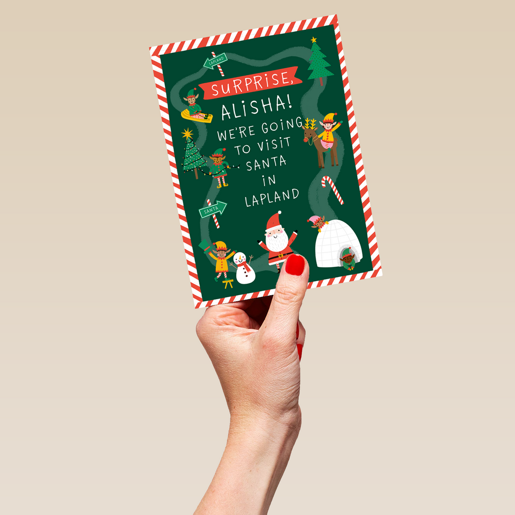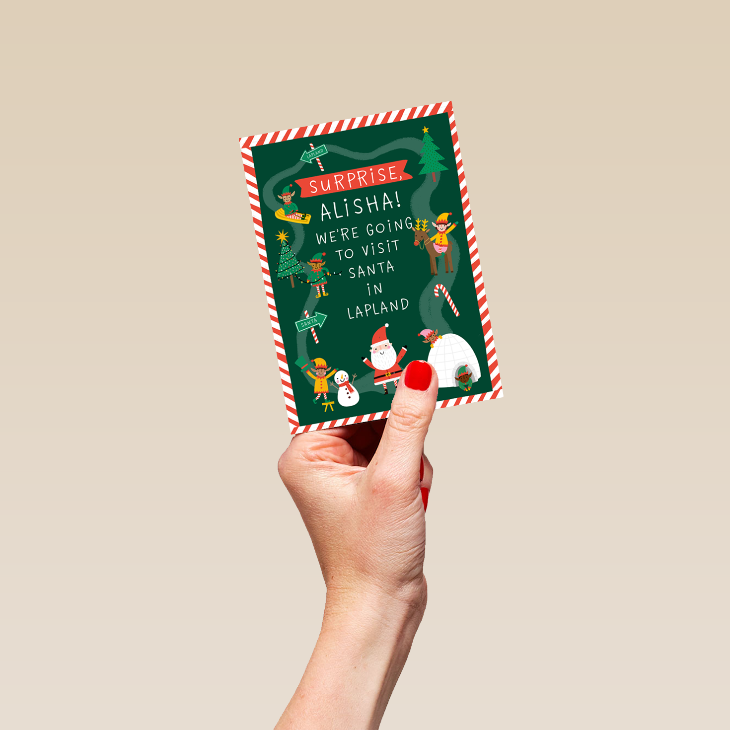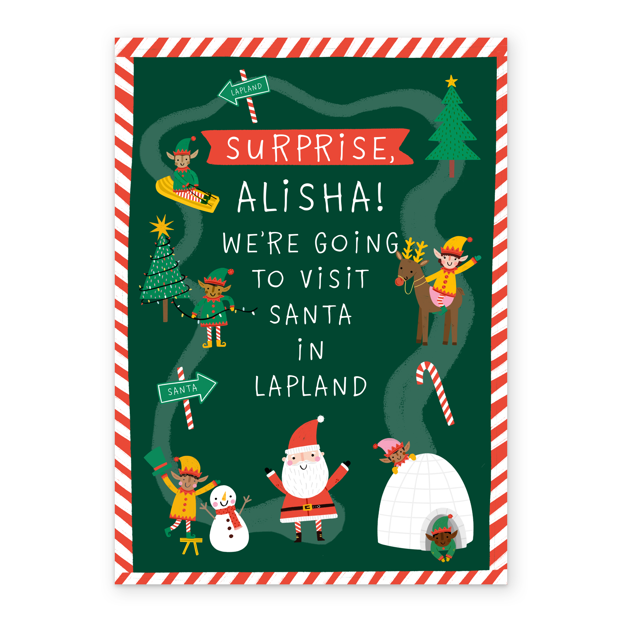 Printed on premium-quality board, this card features fun illustrations of Santa, his Elves and Reindeer with a festive red and white border, with the message 'Surprise, [Name]! We're going to visit Santa in Lapland', space to personalise a name, and comes complete with a co-ordinating white envelope.