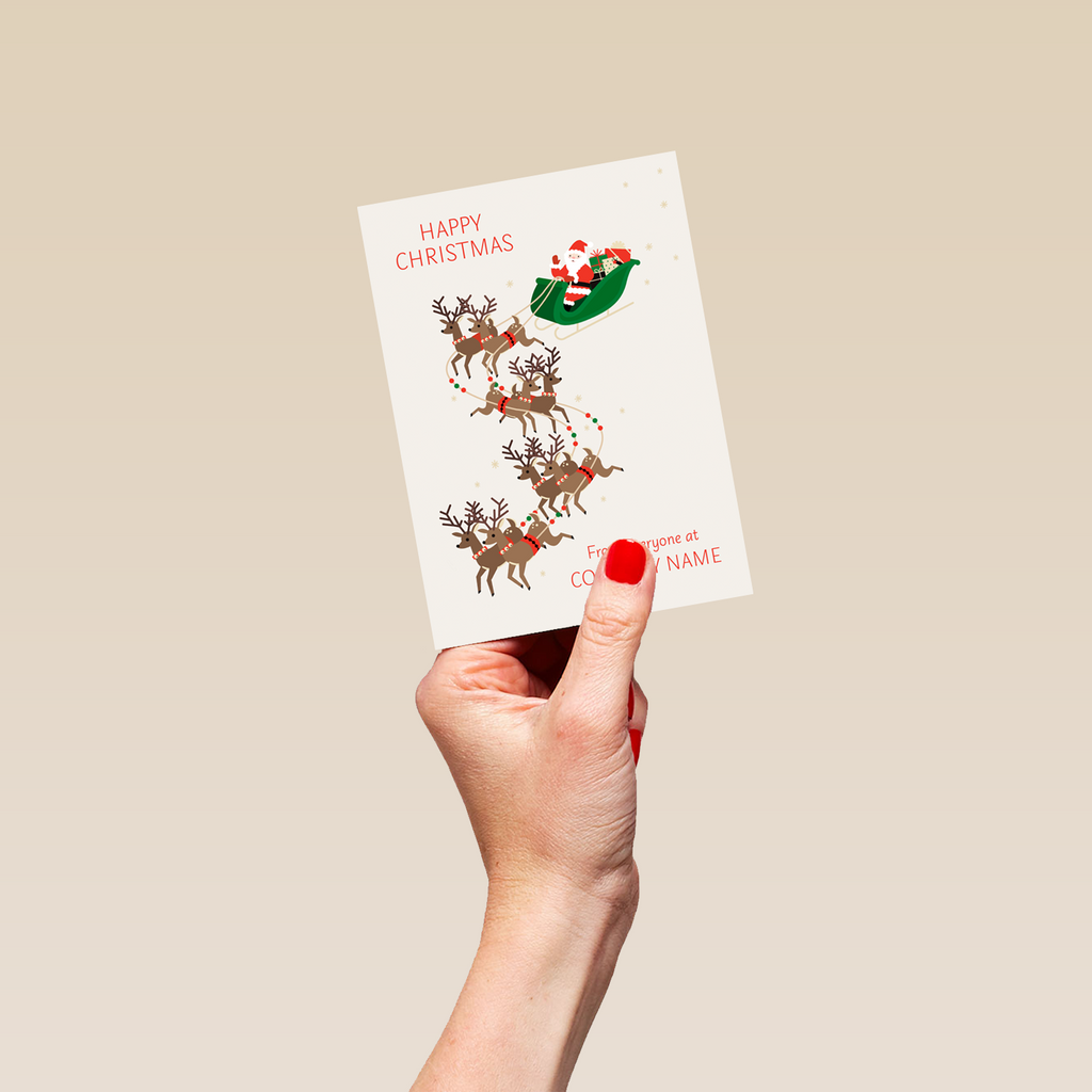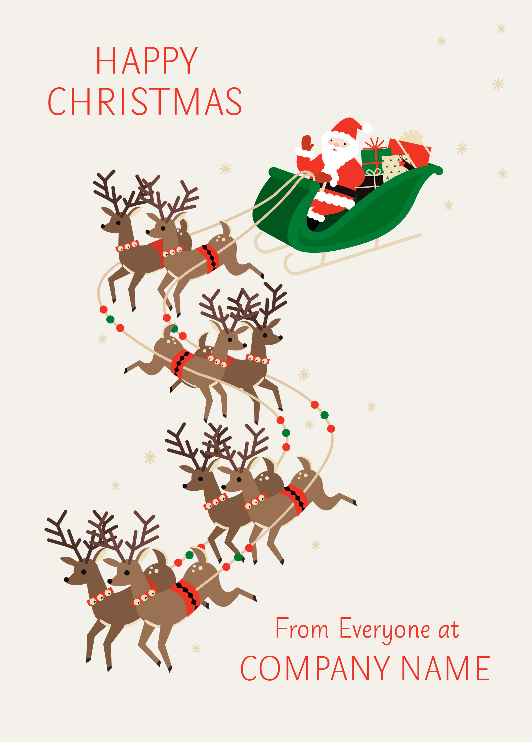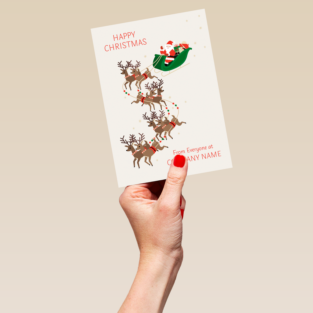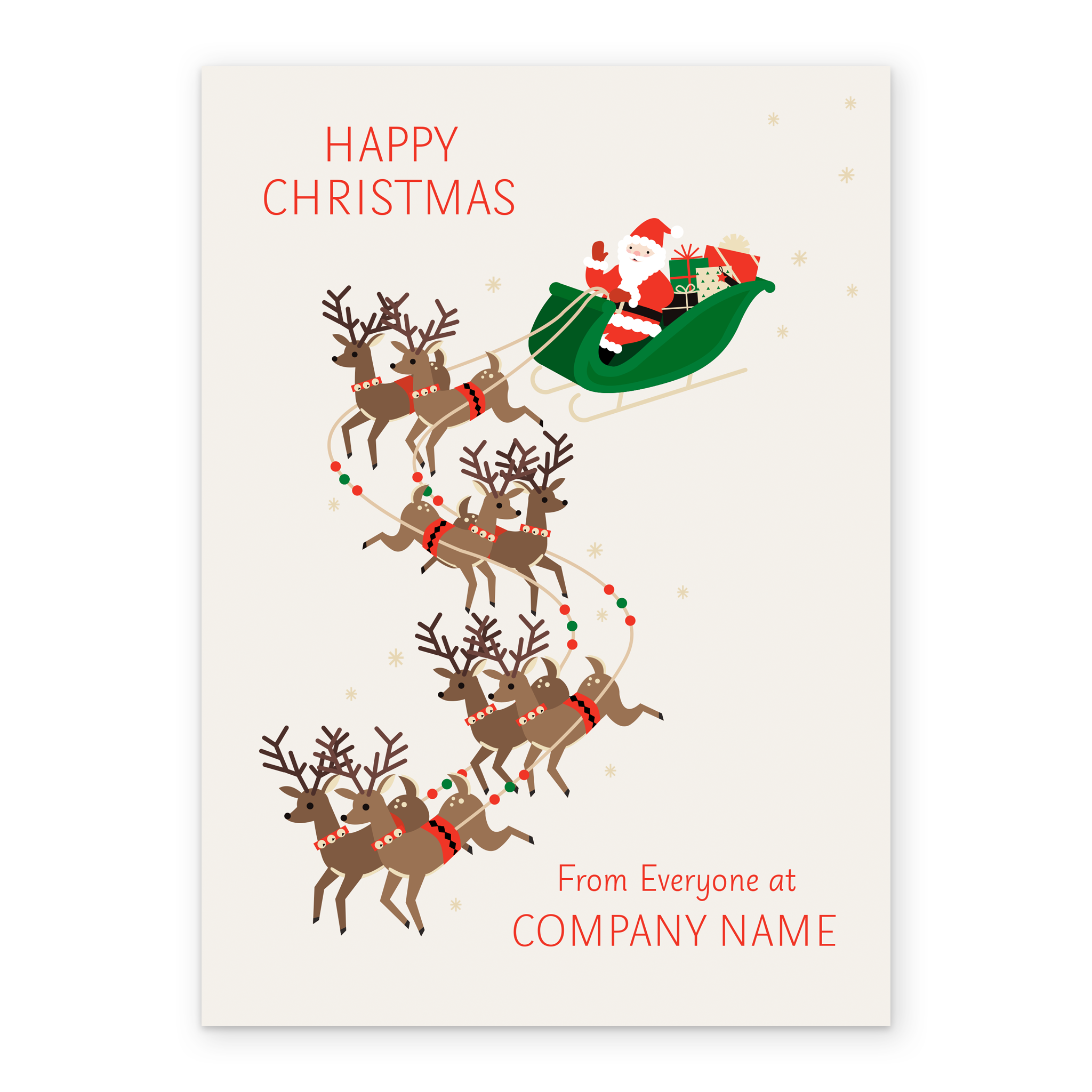Printed on premium-quality board, this card features an illustration of Santa in his sleigh being pulled by his reindeer, with the message 'Happy Christmas from everyone at [COMPANY NAME]', space to personalise a name, and comes complete with a co-ordinating white envelope.