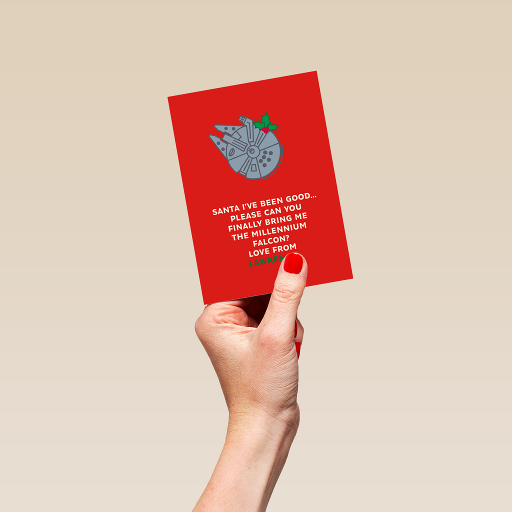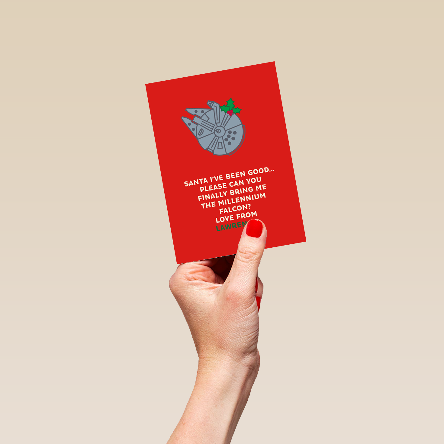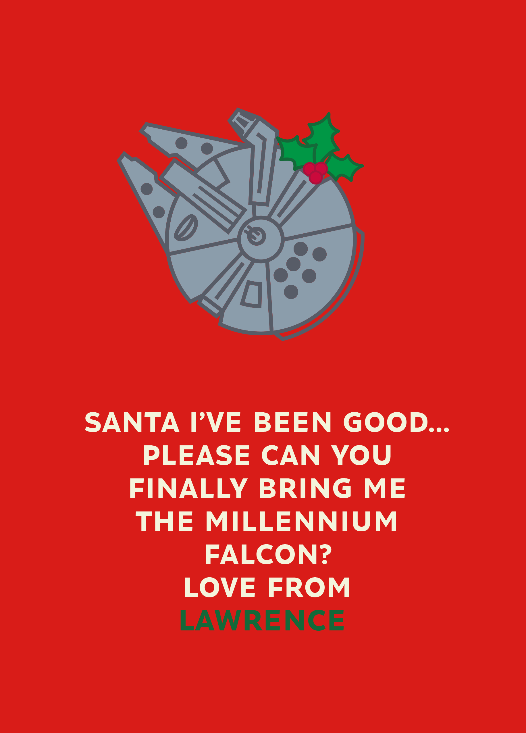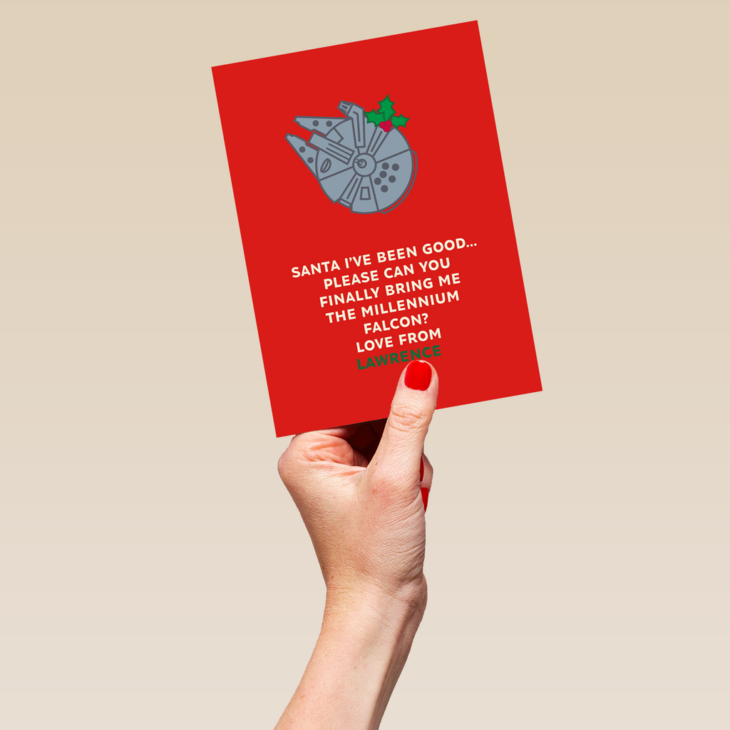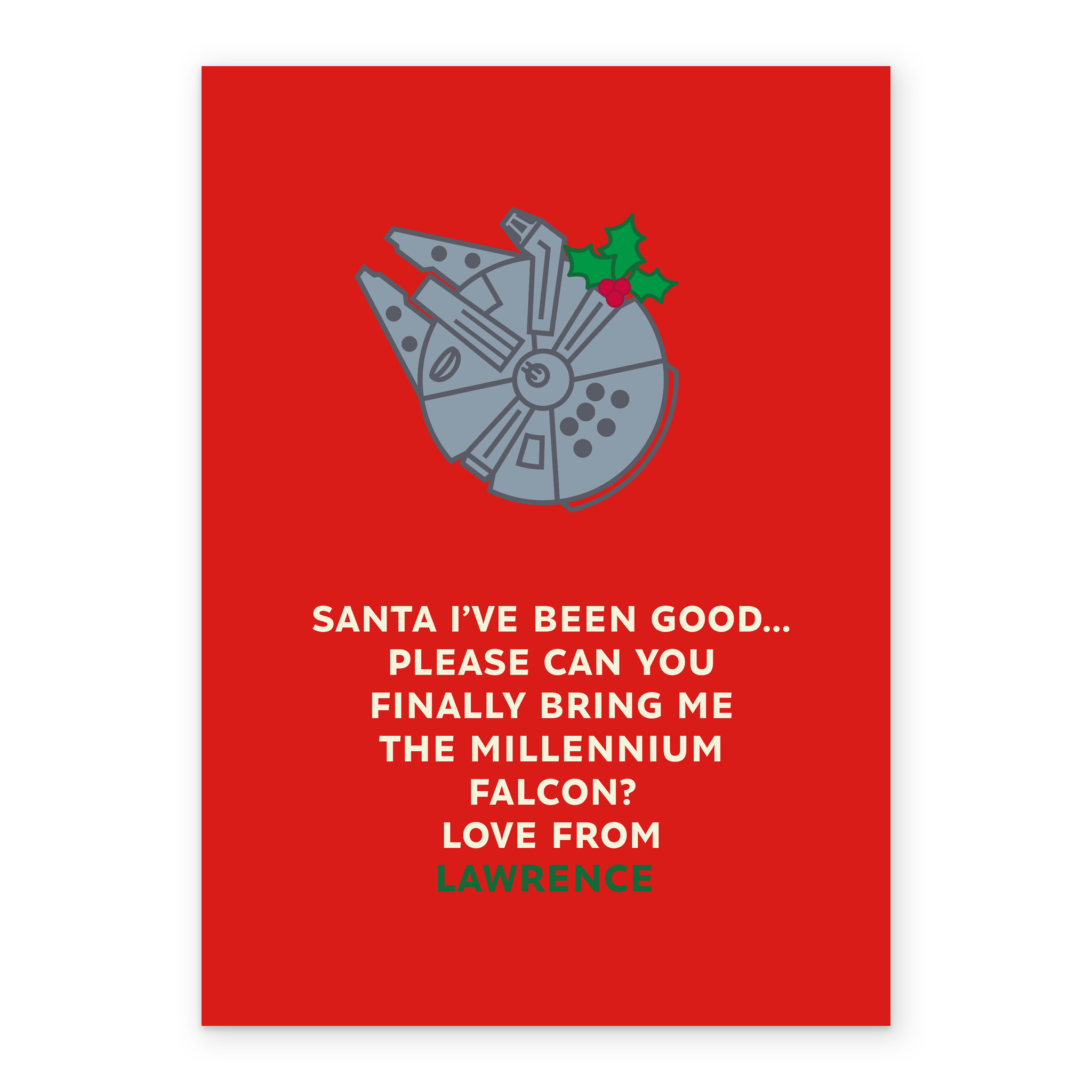 When they've been good all year long, make sure they ask Santa for what they truly deserve… the Millennium Falcon, and send lots of festive wishes with this personalised and editable Christmas card, inspired by Star Wars™. Printed on premium-quality board, this card features the Millennium Falcon with a sprig of holly, inspired by Star Wars™, with the message 'Santa I've been good… Please can you finally bring me the Millennium Falcon?', space to personalise a name, and comes complete with a co-ordinating white envelope.