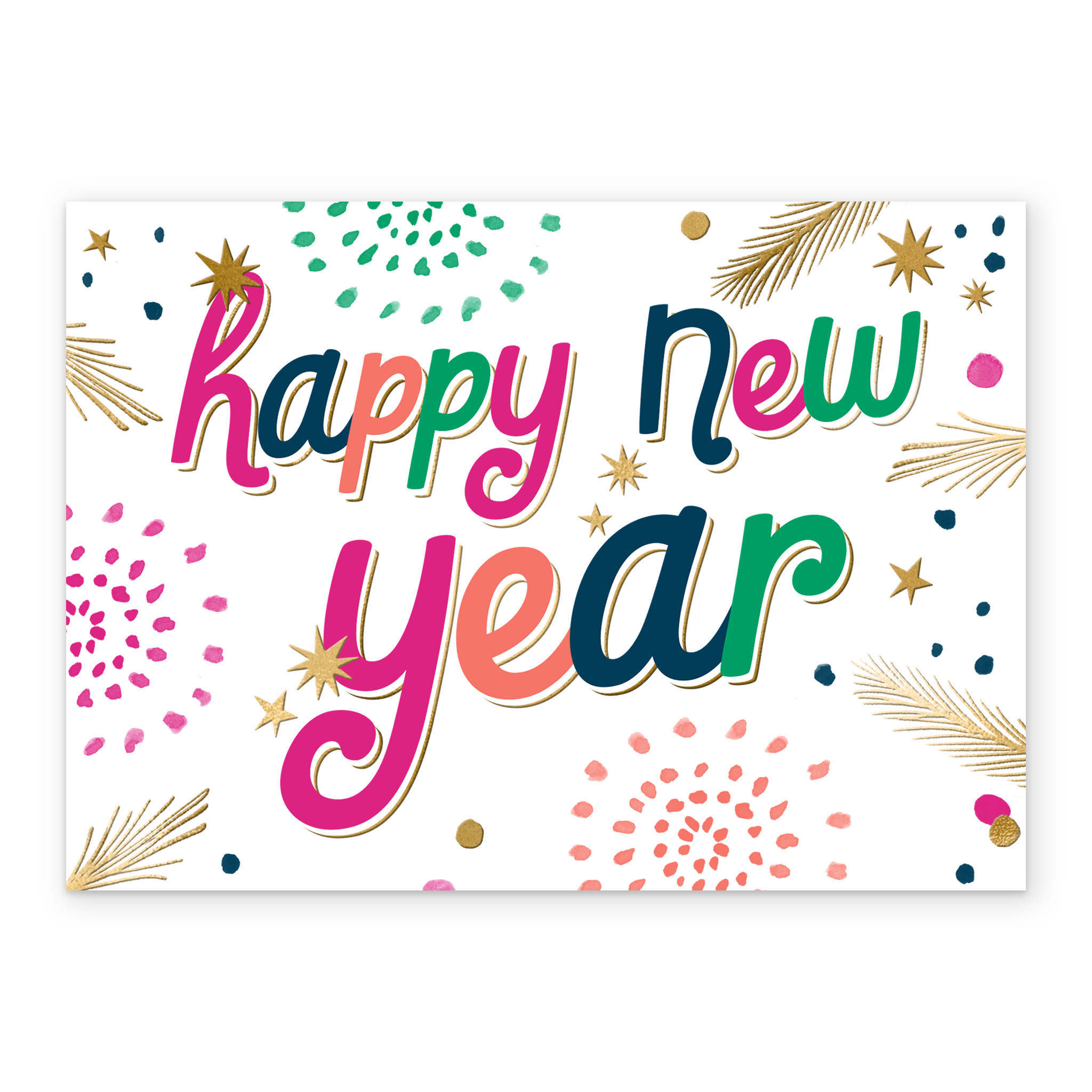 Printed on premium-quality board, this card features a fun background with feathers, fireworks and stars, with the message 'Happy New Year!', and comes complete with a co-ordinating white envelope.