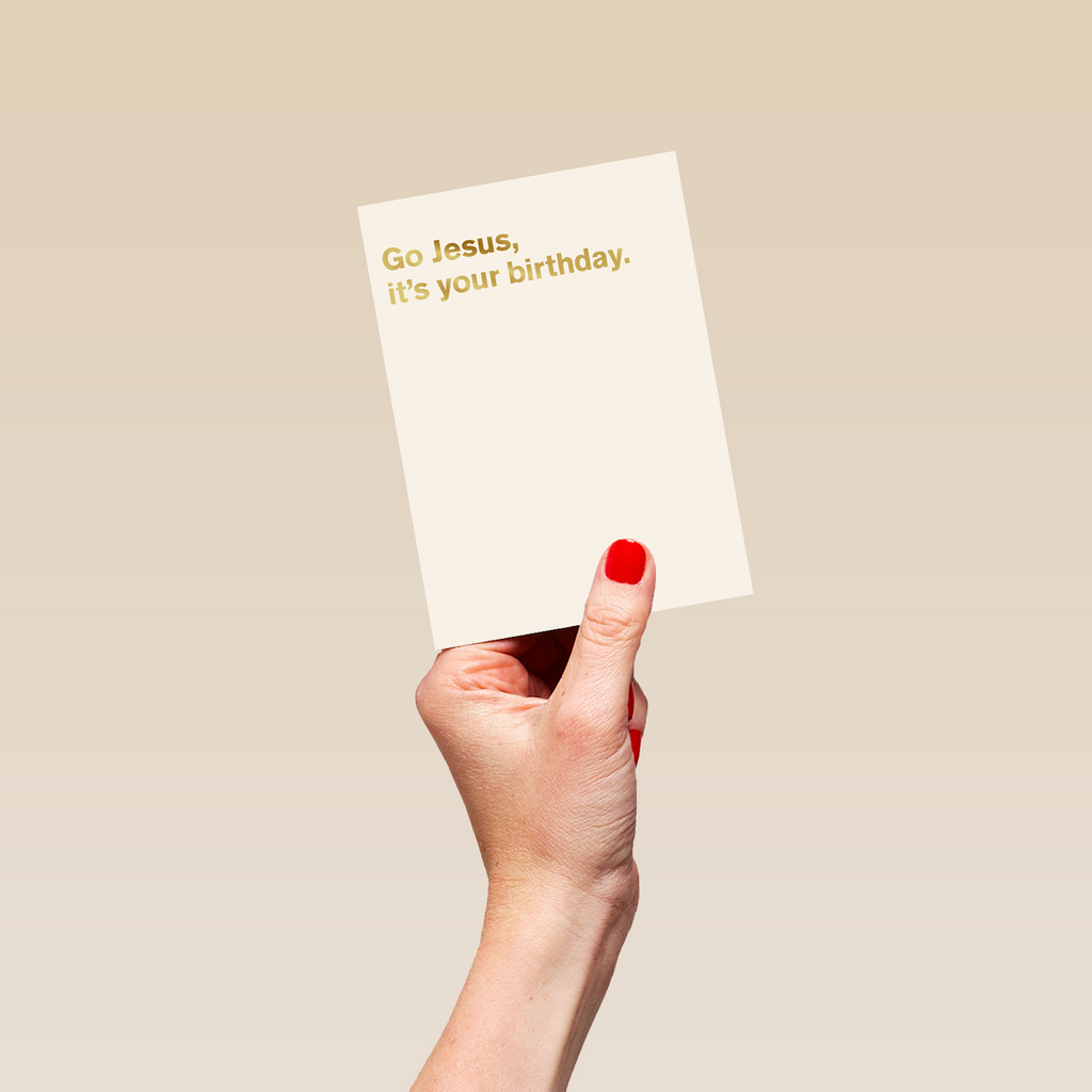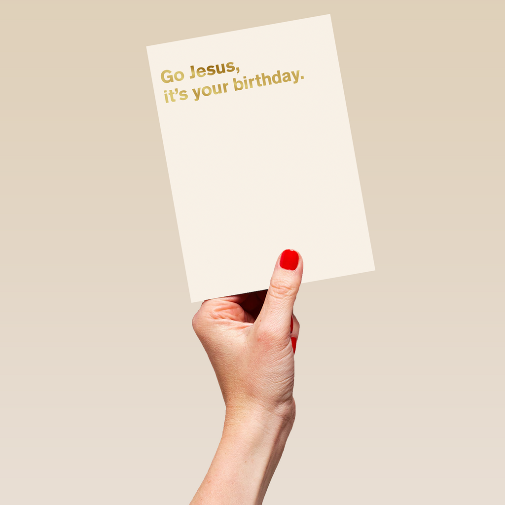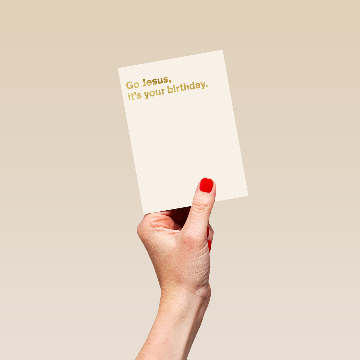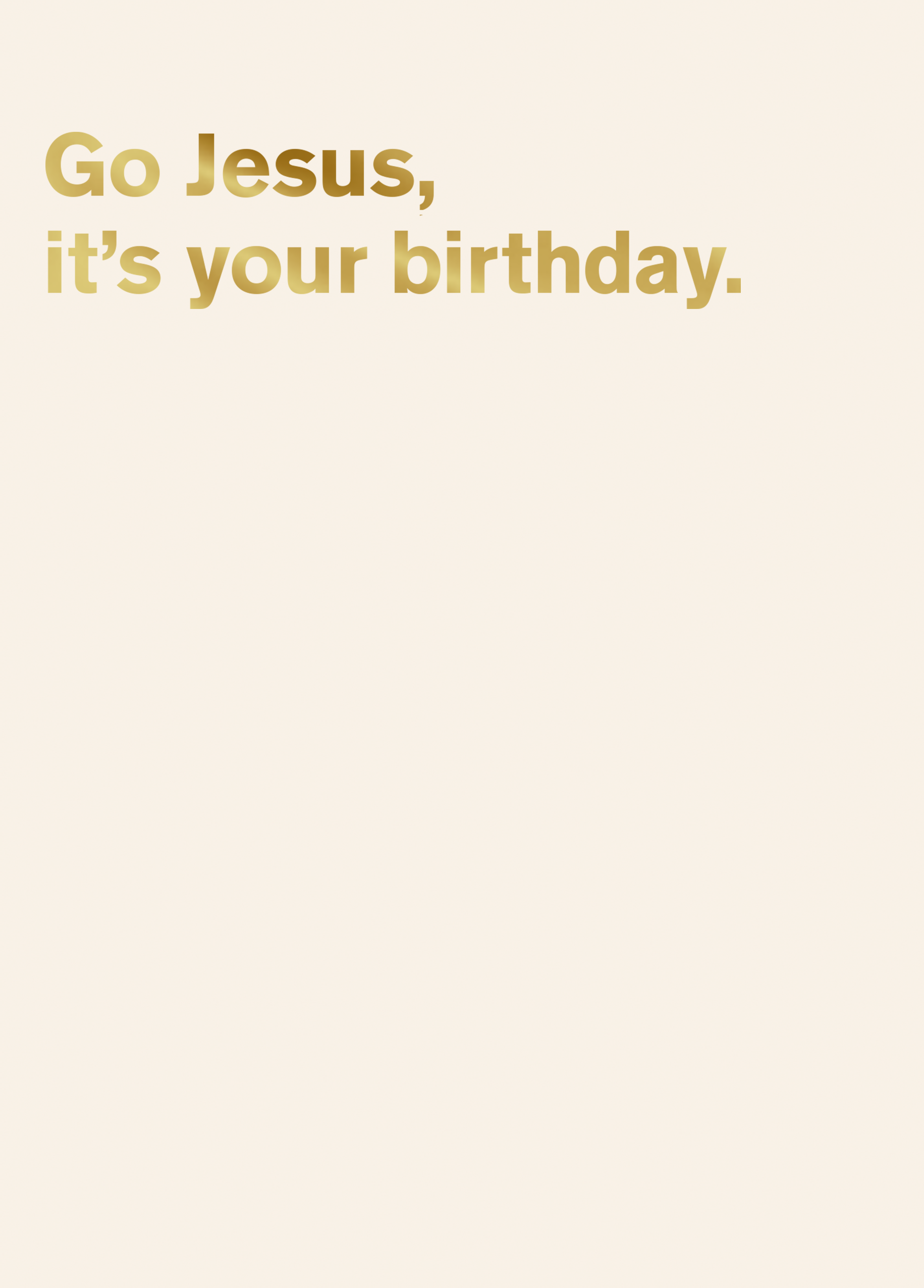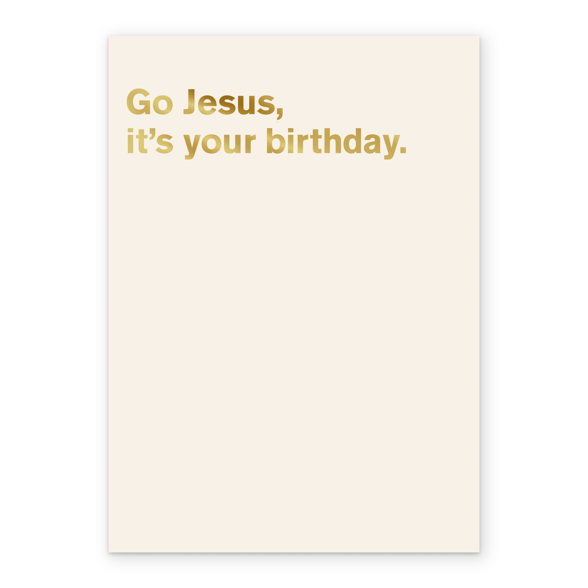 Printed on premium-quality board, this card features a simple, gold-coloured, funny text design, with the message 'Go Jesus, it's your birthday', and comes complete with a co-ordinating white envelope.