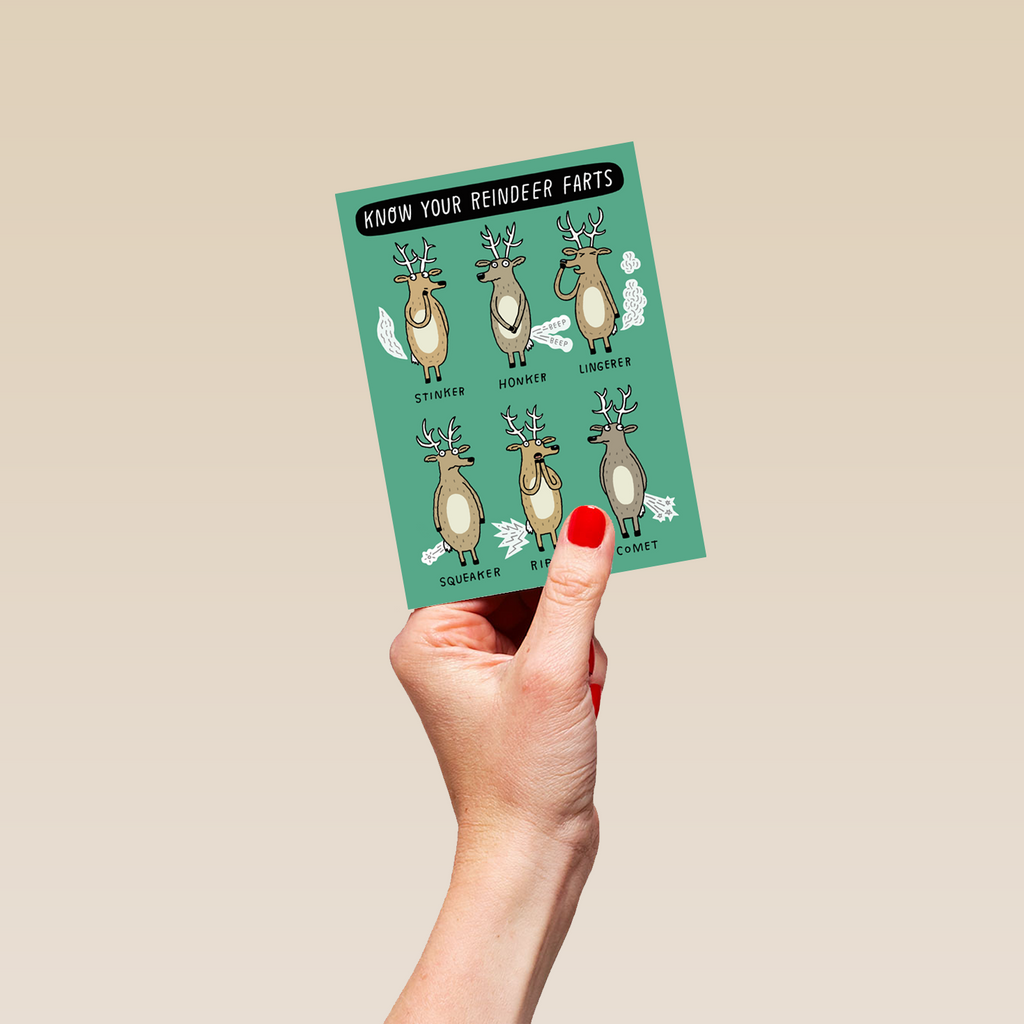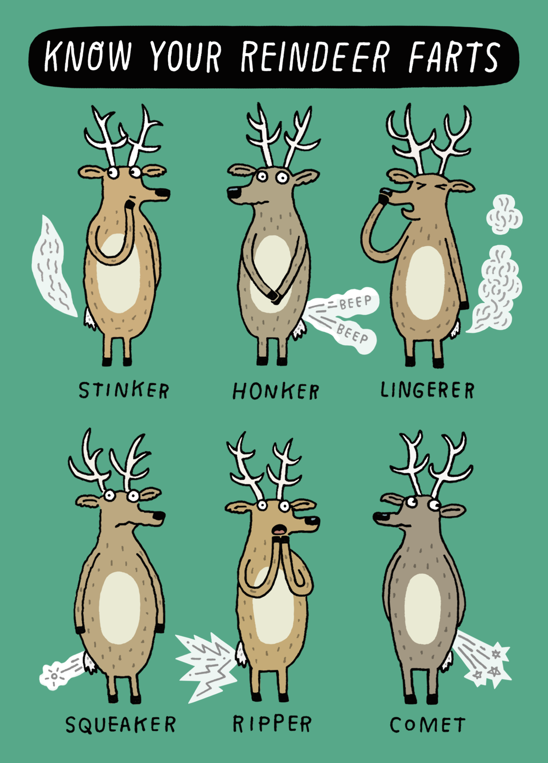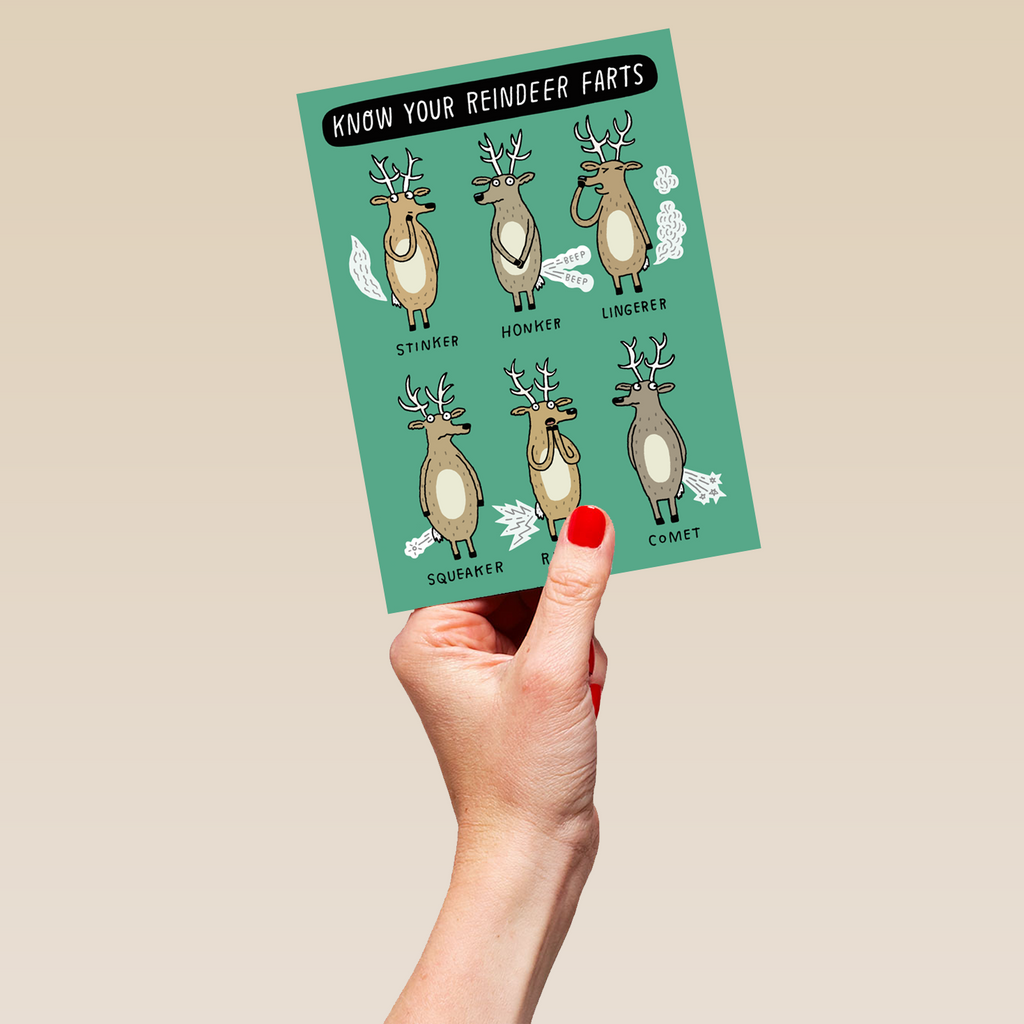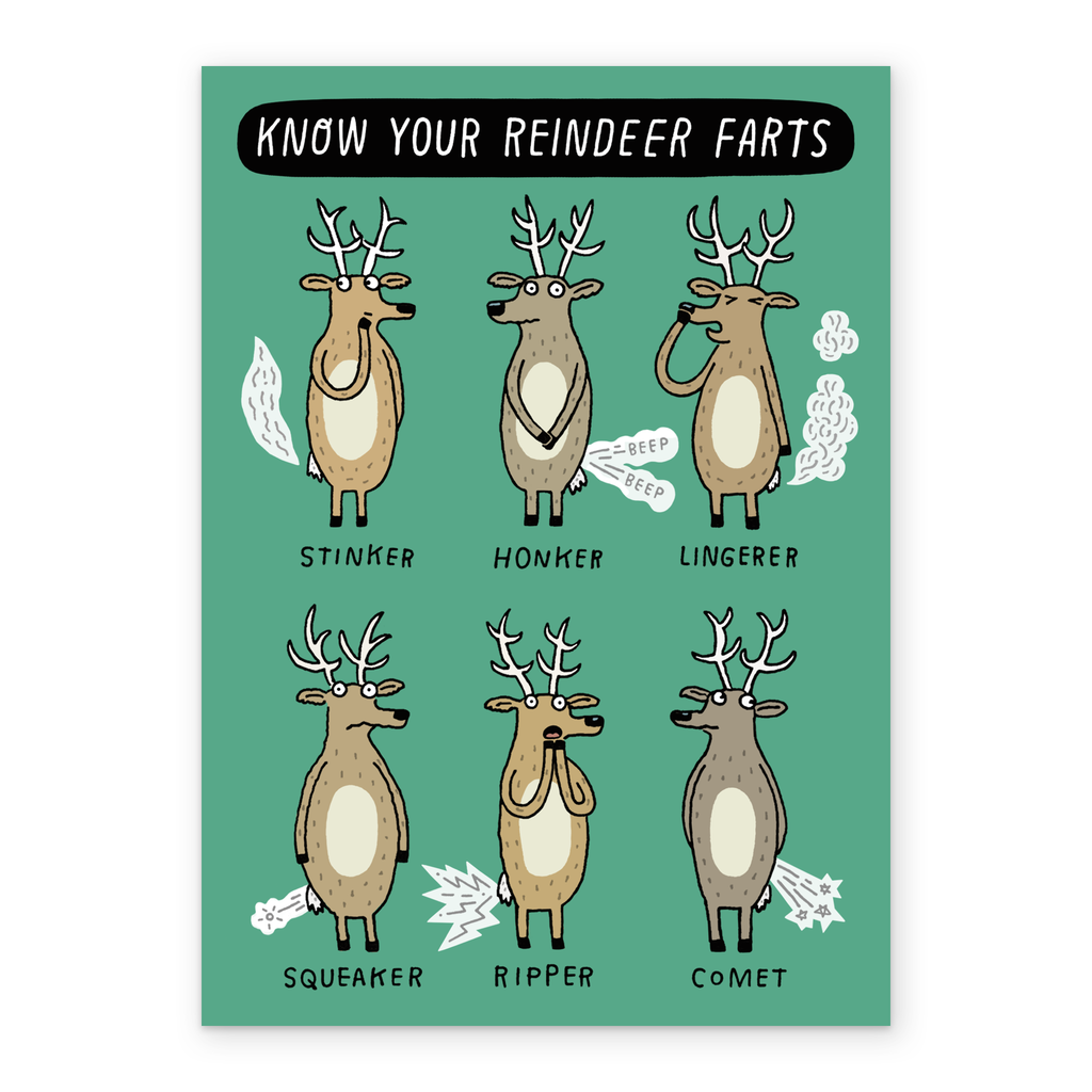 Printed on premium-quality board, this card features a funny reindeer character farting, with the message 'Know your reindeer farts', and comes complete with a co-ordinating white envelope.
