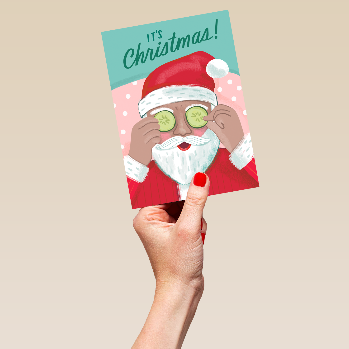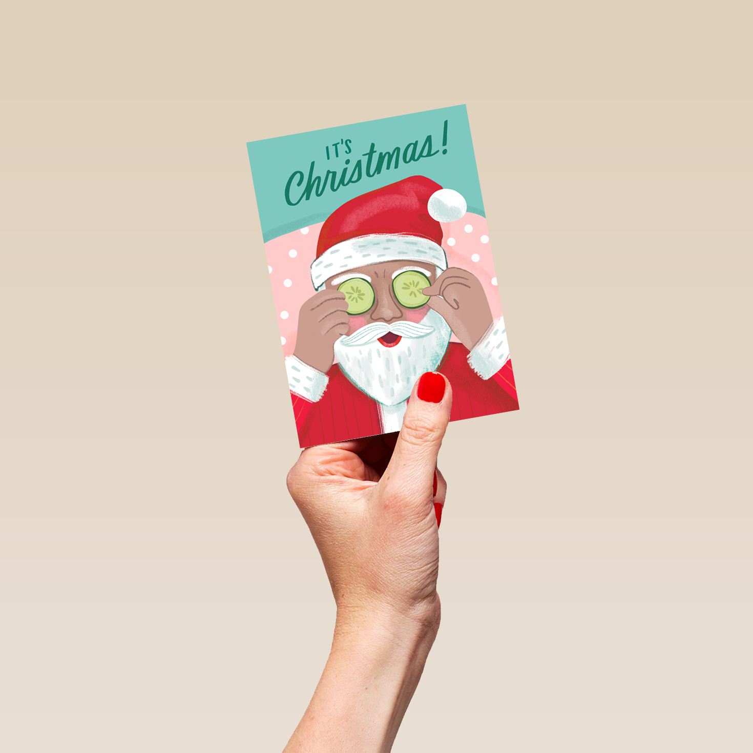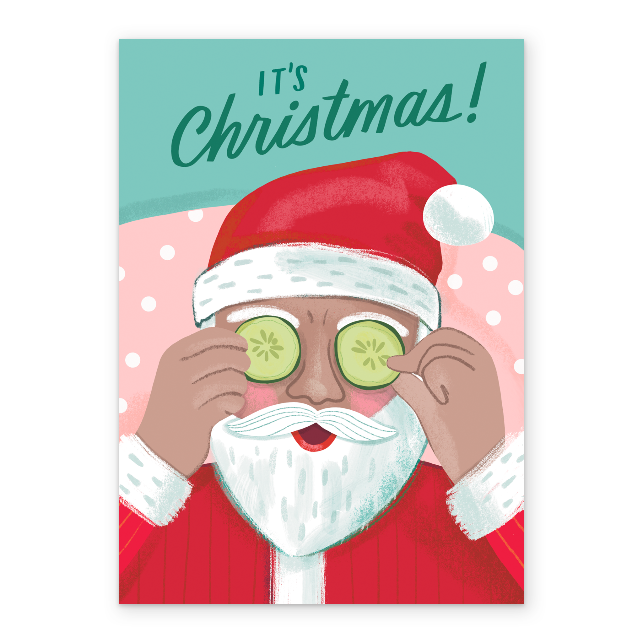 Printed on premium-quality board, this card features a fun illustration of Santa relaxing with cucumber slices on his eyes, with the message 'It's Christmas!', and comes complete with a co-ordinating white envelope.
