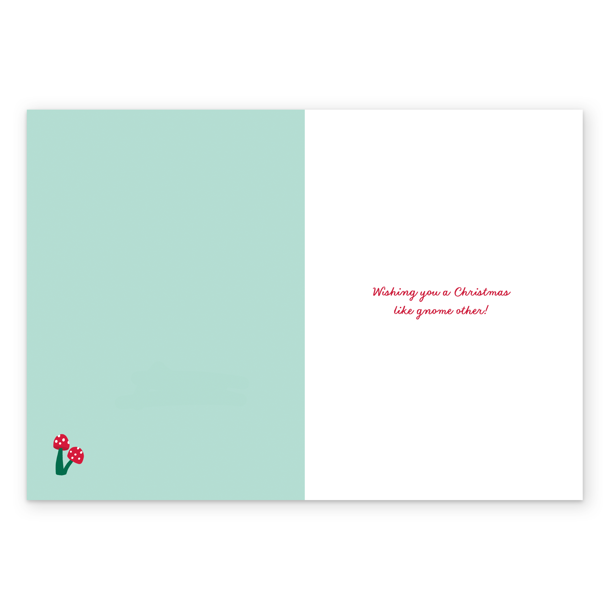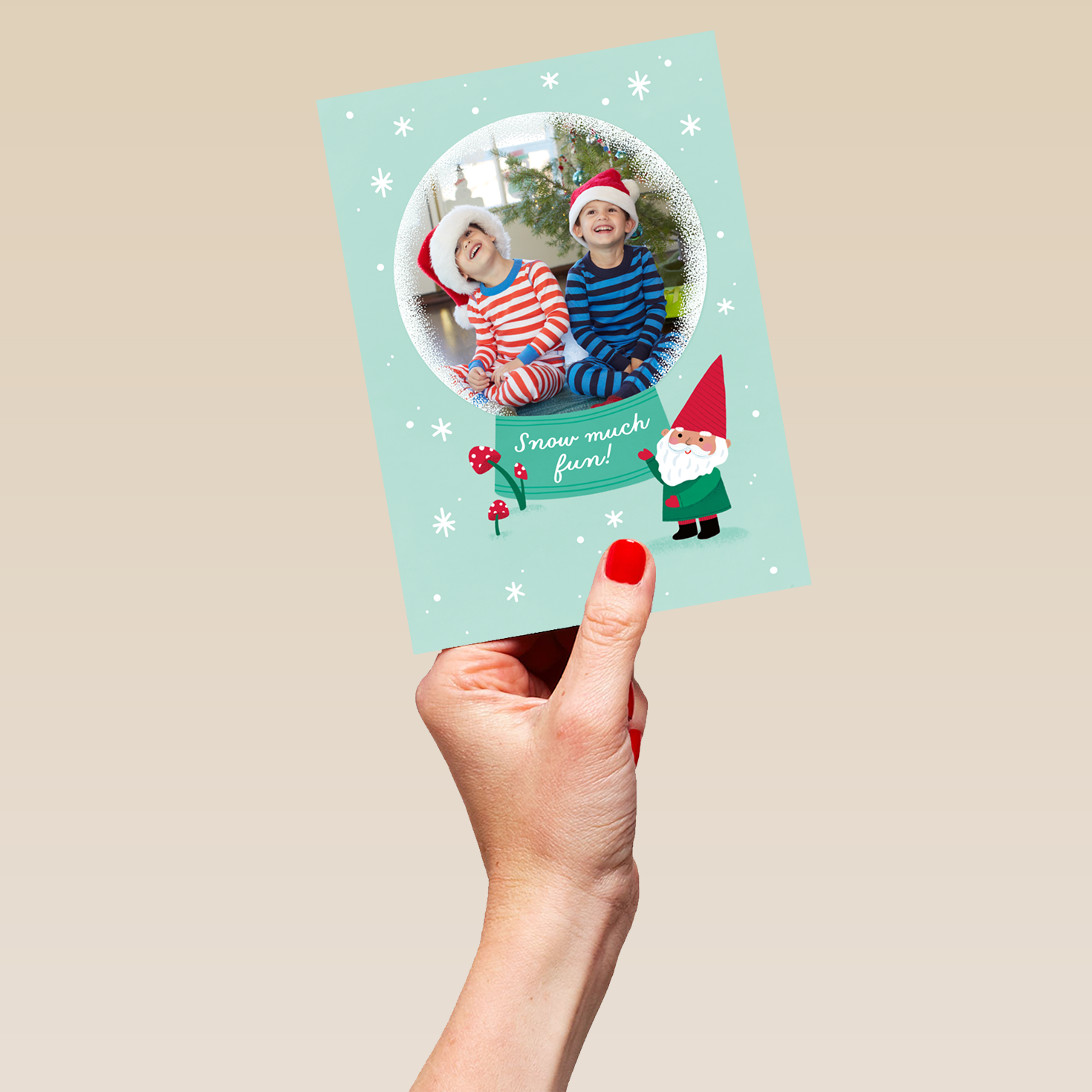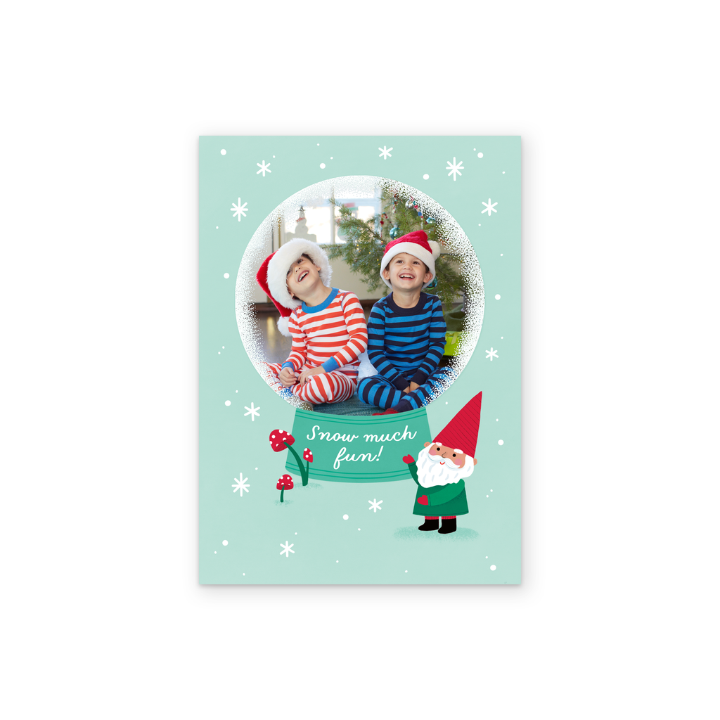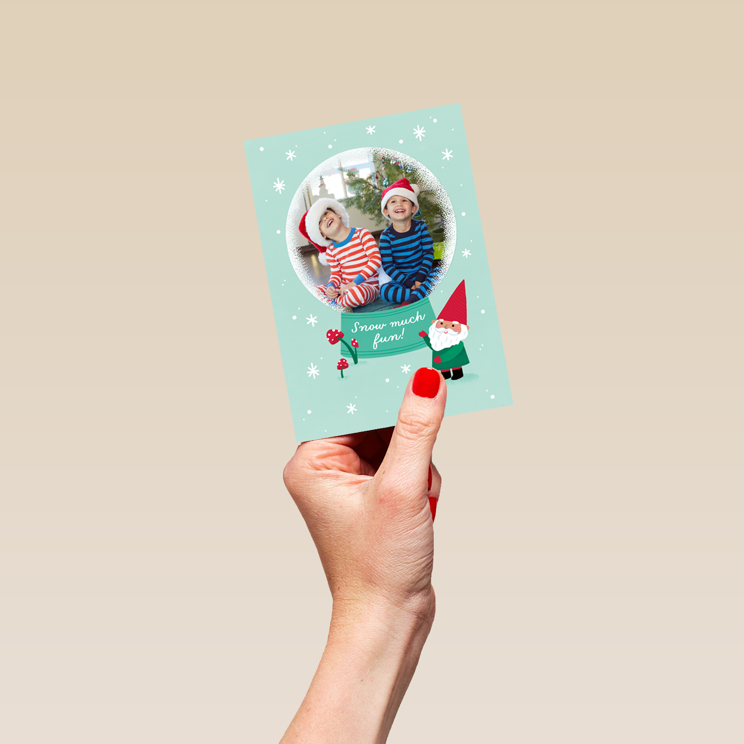Printed on premium-quality board, this card features a pale blue, snowflake dotted background with a 'Snow globe frame' centrepiece, illustrated red flowers, a cute gnome and white lettering on the base of the snow globe, with the message 'Snow Much Fun!', and comes complete with a co-ordinating white envelope.