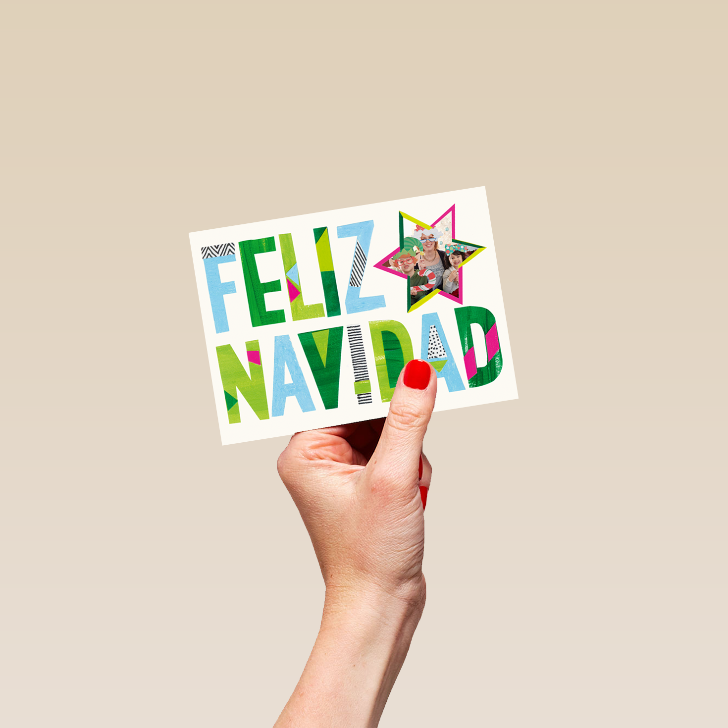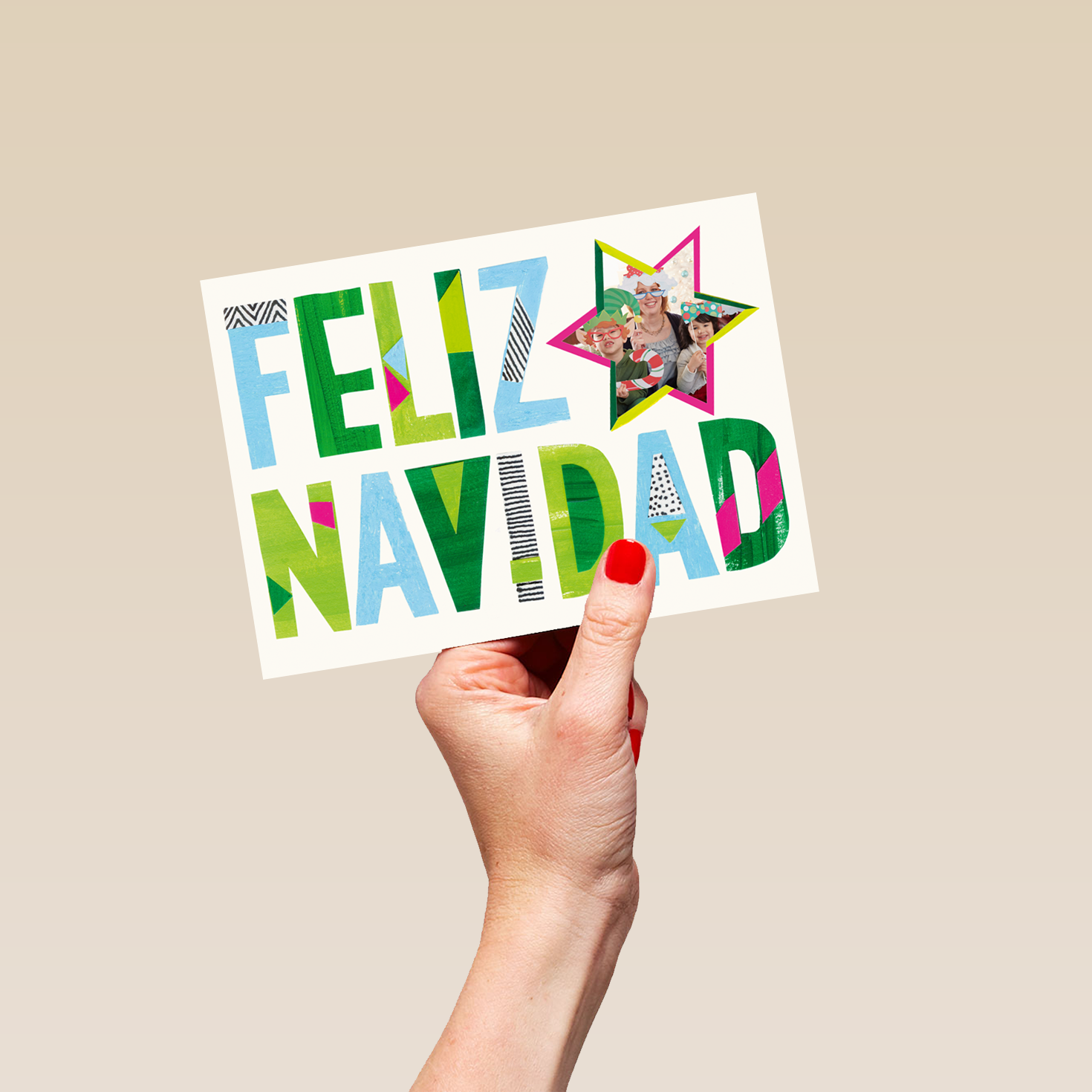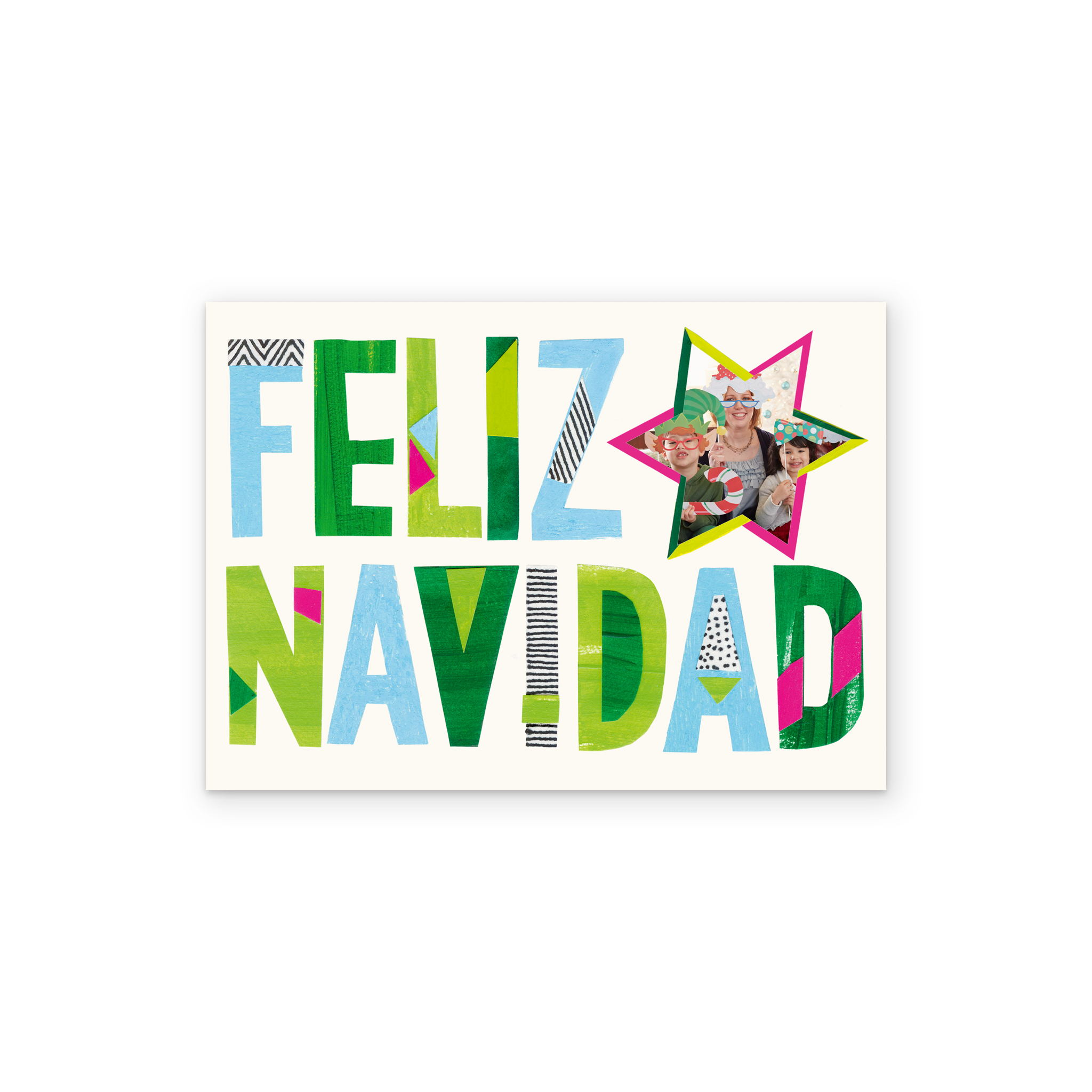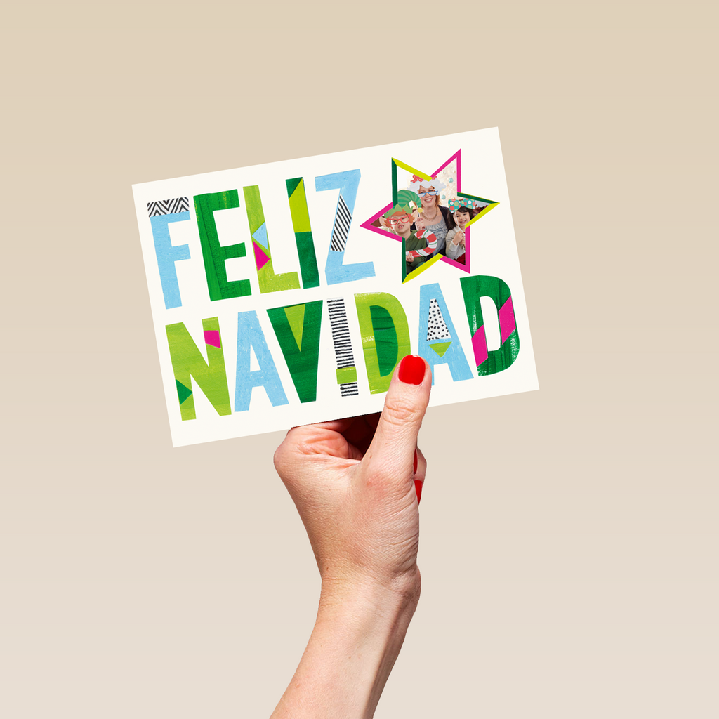 Printed on premium-quality board, this card features a plain white background with a colourfully outlined star frame alongside, large, multi-coloured, boldly patterned lettering, with the message 'Feliz Navidad', space to upload a photo, and comes complete with a co-ordinating white envelope.