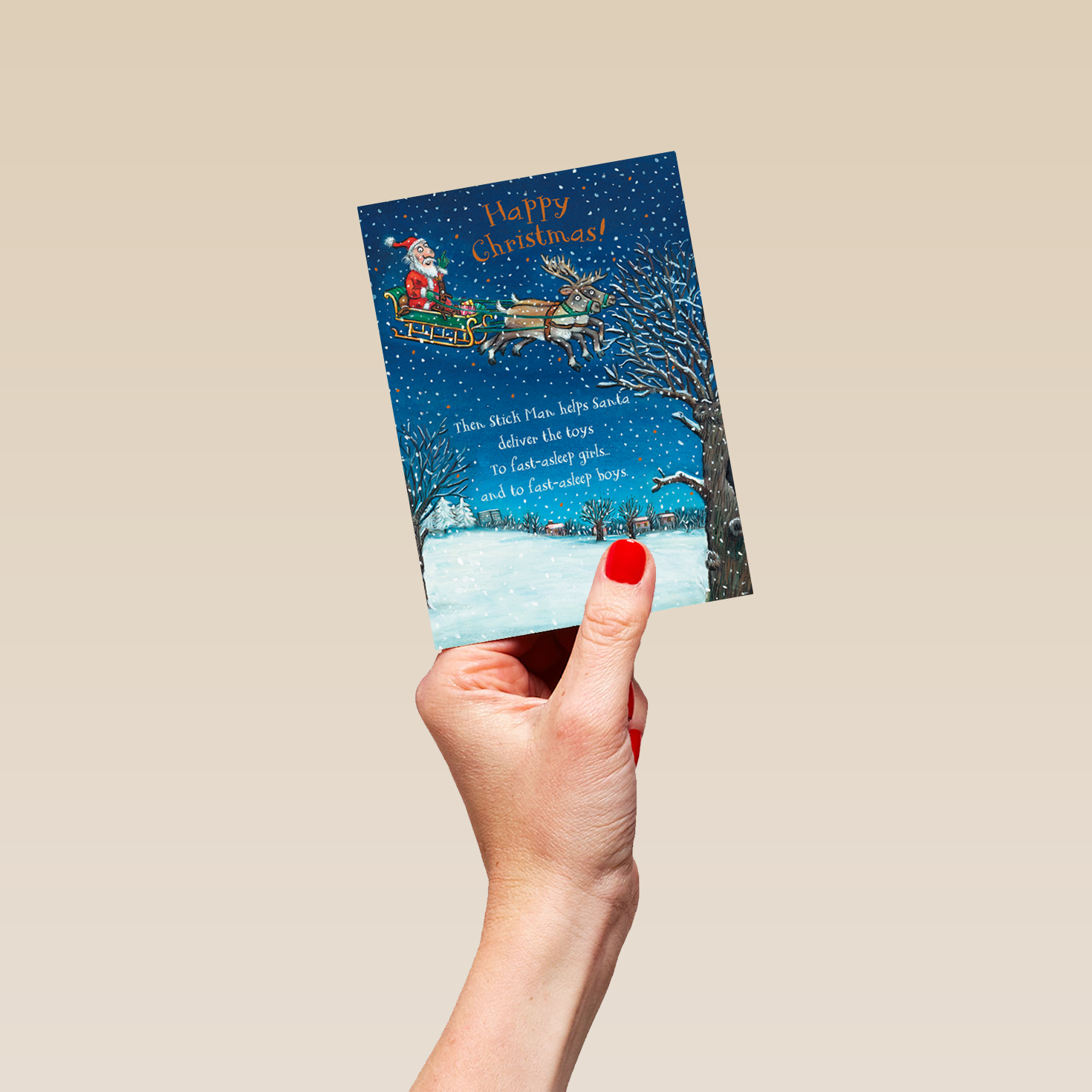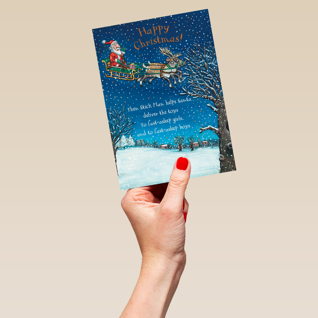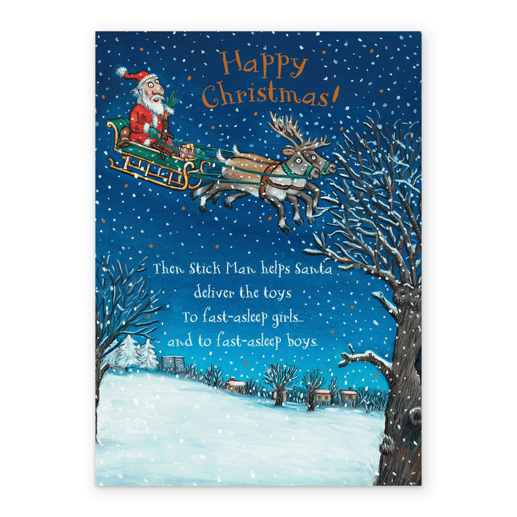 Printed on premium-quality board, this card features a classic Axel Schaeffler illustration of Julia Donaldson's Stick Man riding alongside Santa in his sleigh above a wintery landscape with orange and white lettering, with the message 'Happy Christmas! Then Stick Man helps Santa deliver the toys to fast-asleep girls and to fast-asleep boys', and comes complete with a co-ordinating white envelope.