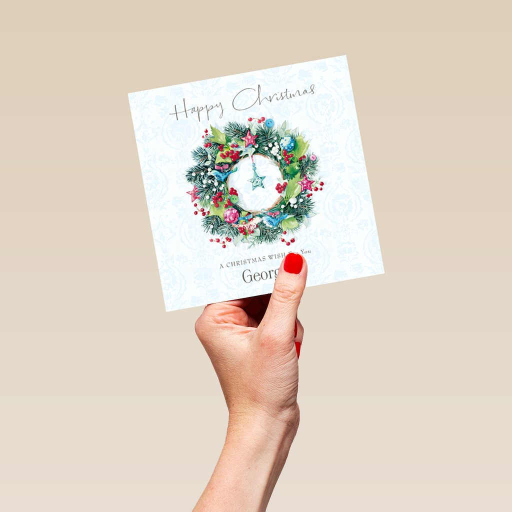 Show them you care with a personalised traditional Christmas Lucy Cromwell wreath card from Hallmark. Our greetings cards are printed on premium quality, FSC®-certified card & delivered nationwide. This card is available as standard 12cm by 12cm and large 15cm by 15cm.