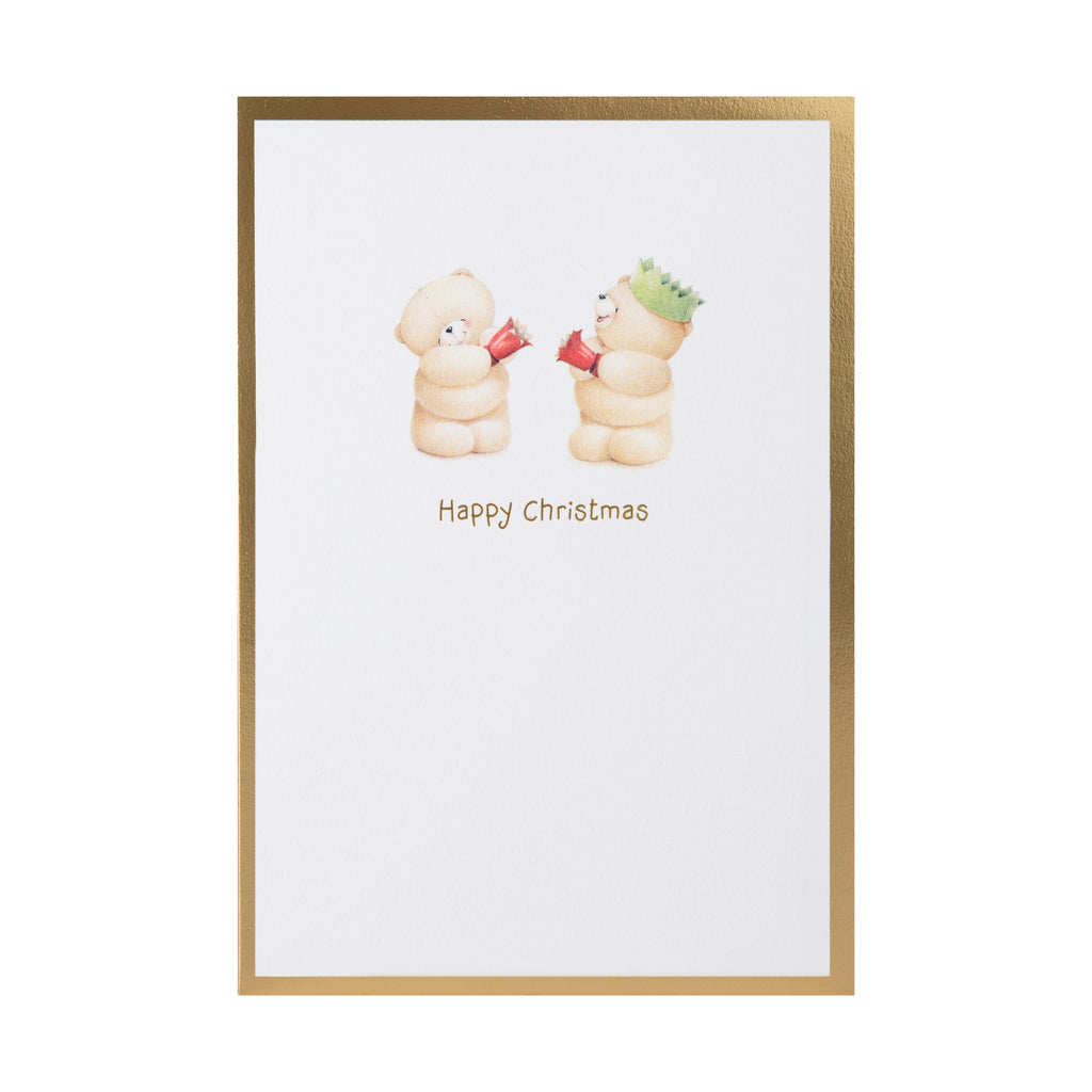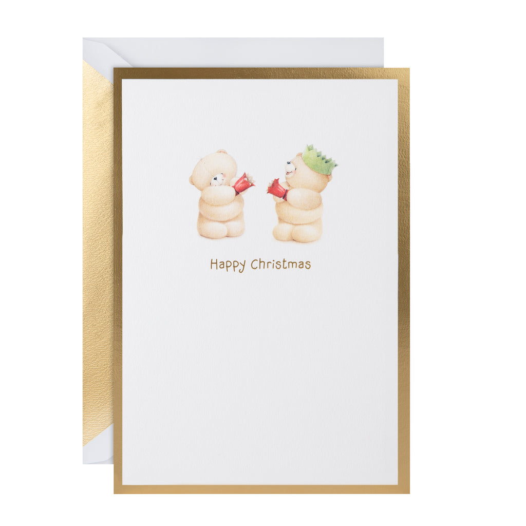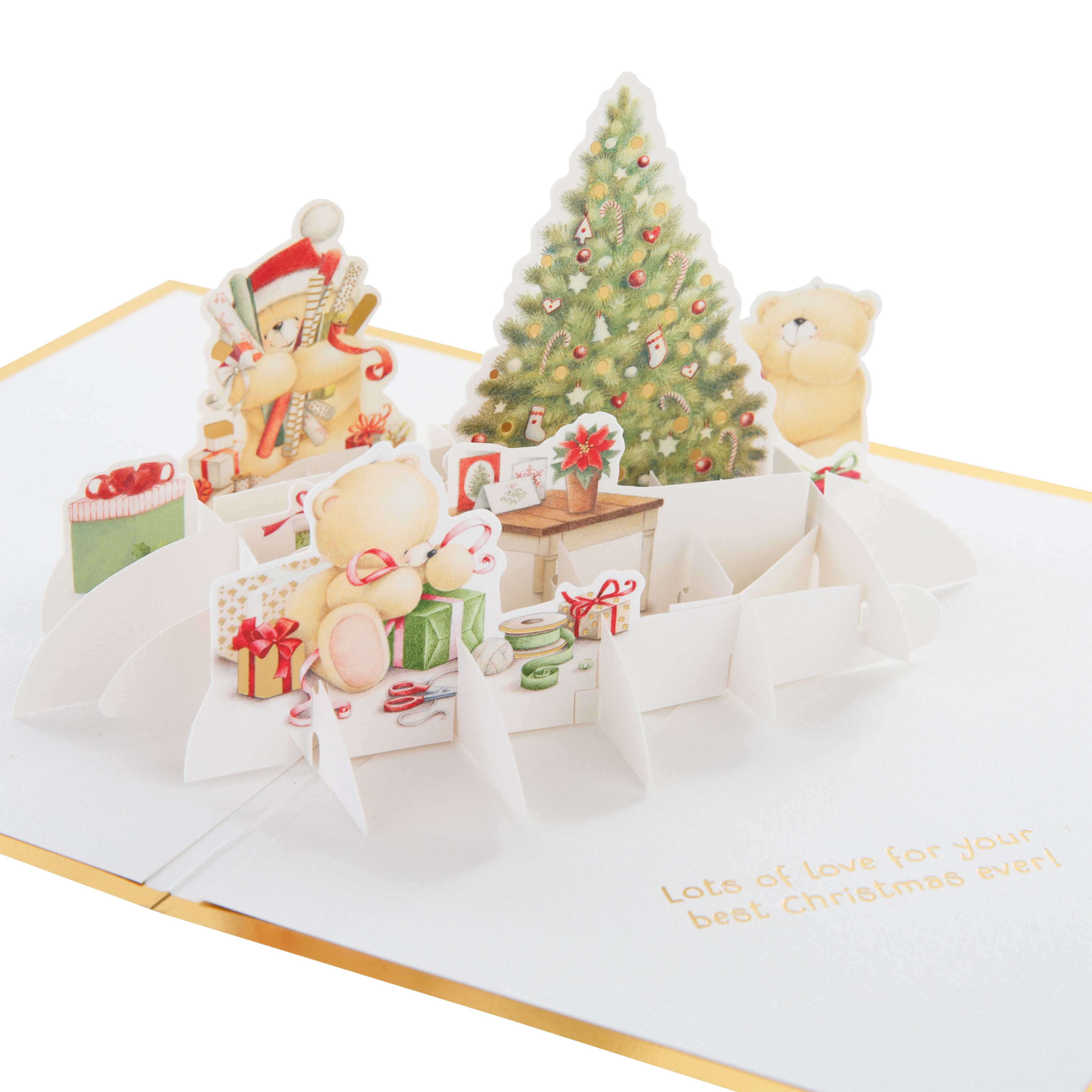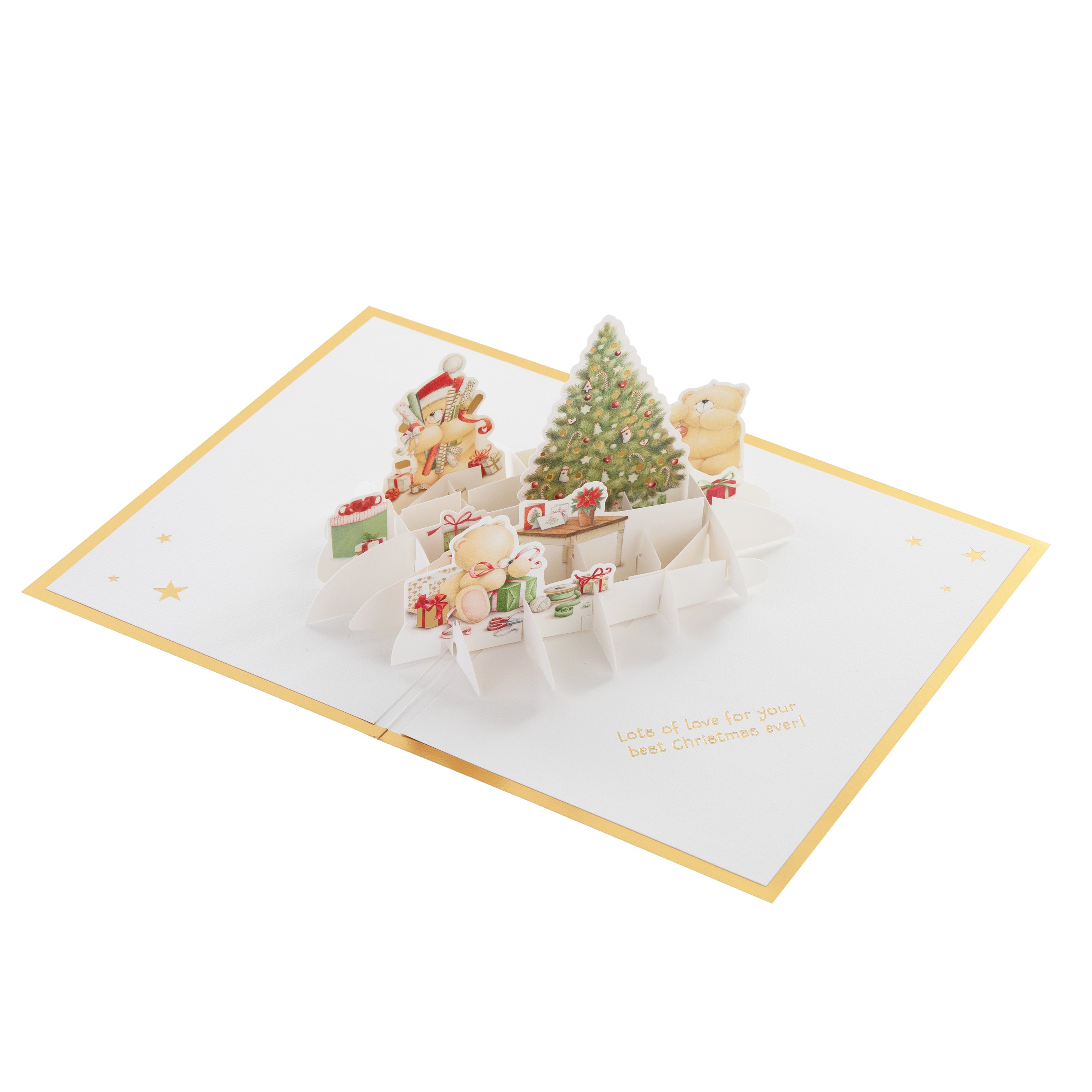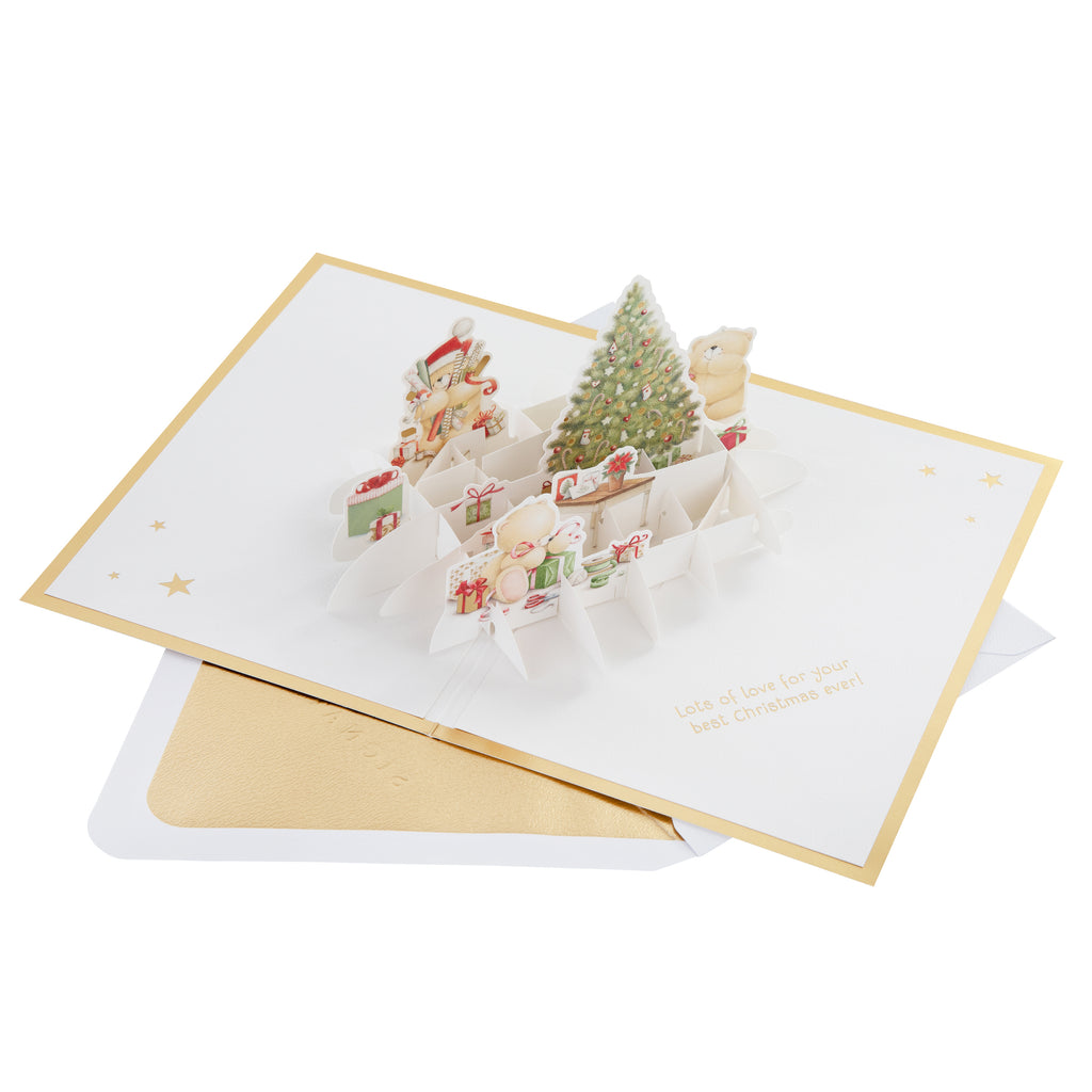 Printed on high-quality board, simply open this card up to reveal a 3D and pop-up scene of Hallmark's Forever Friends bears wrapping presents and decorating a Christmas tree. This card features metallic gold foil details, the message, 'Happy Christmas' on the front, and comes complete with a co-ordinating Hallmark branded, white envelope.