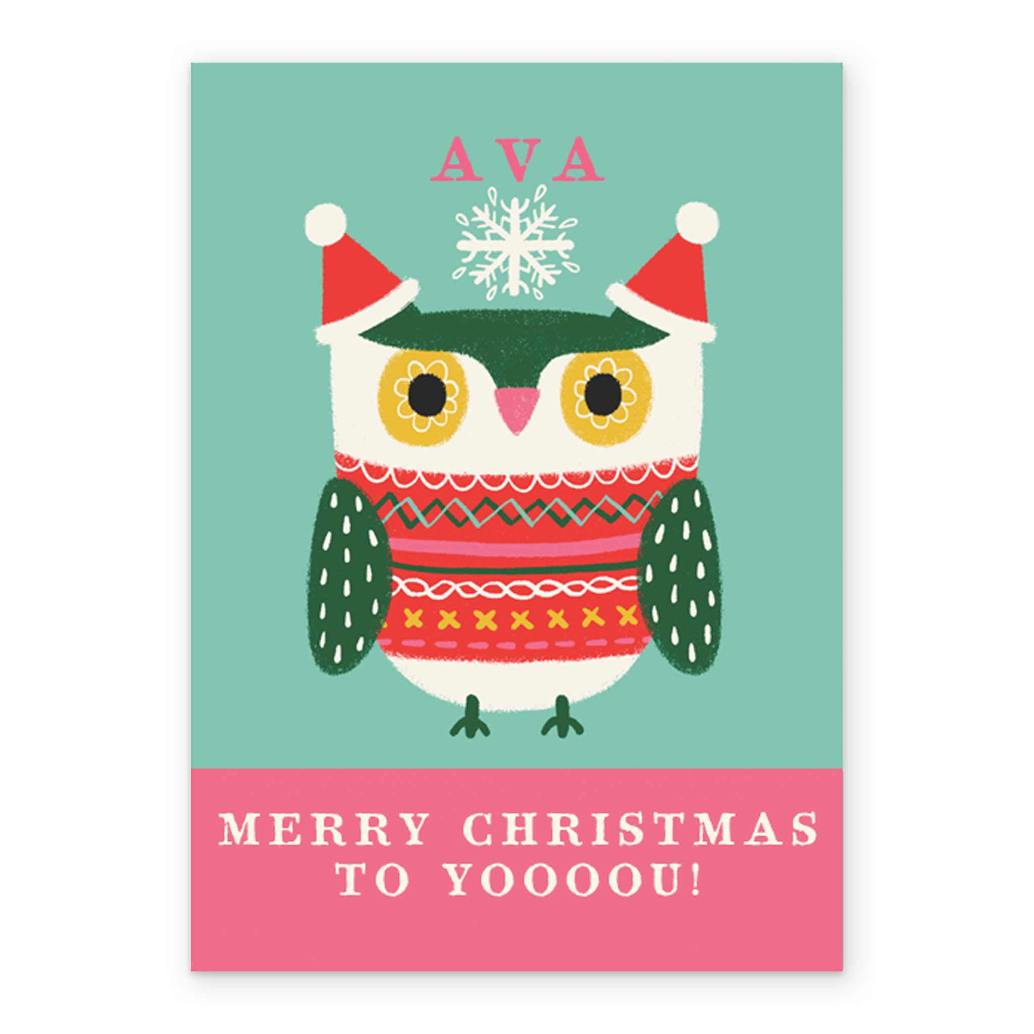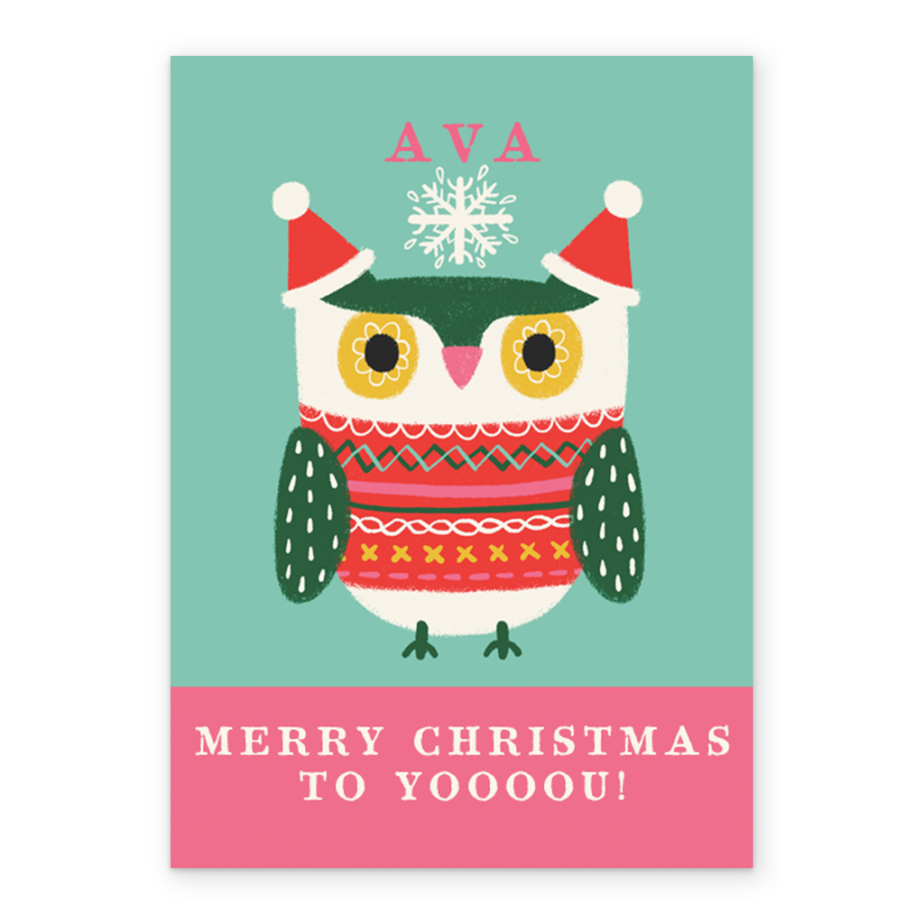 Show them you care with a personalised kids editable cute owl Christmas jumper card from Hallmark. Our greetings cards are printed on premium quality, FSC®-certified card & delivered nationwide. This card is available as standard 12cm by 16.7cm and large 15.5cm by 21.6cm.
