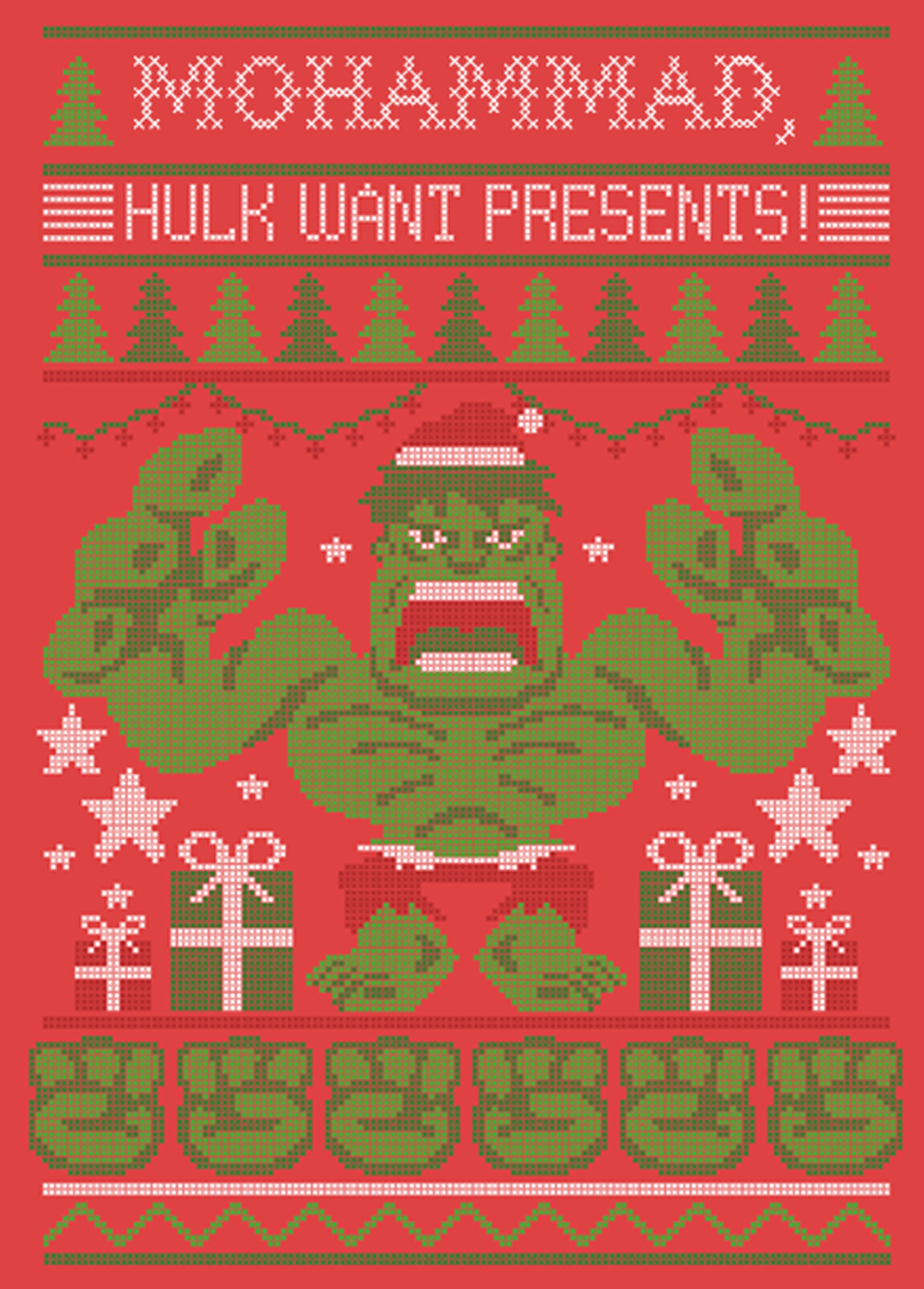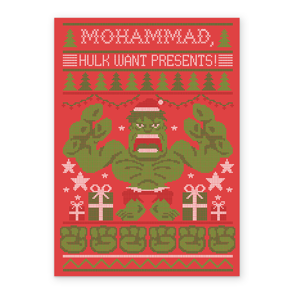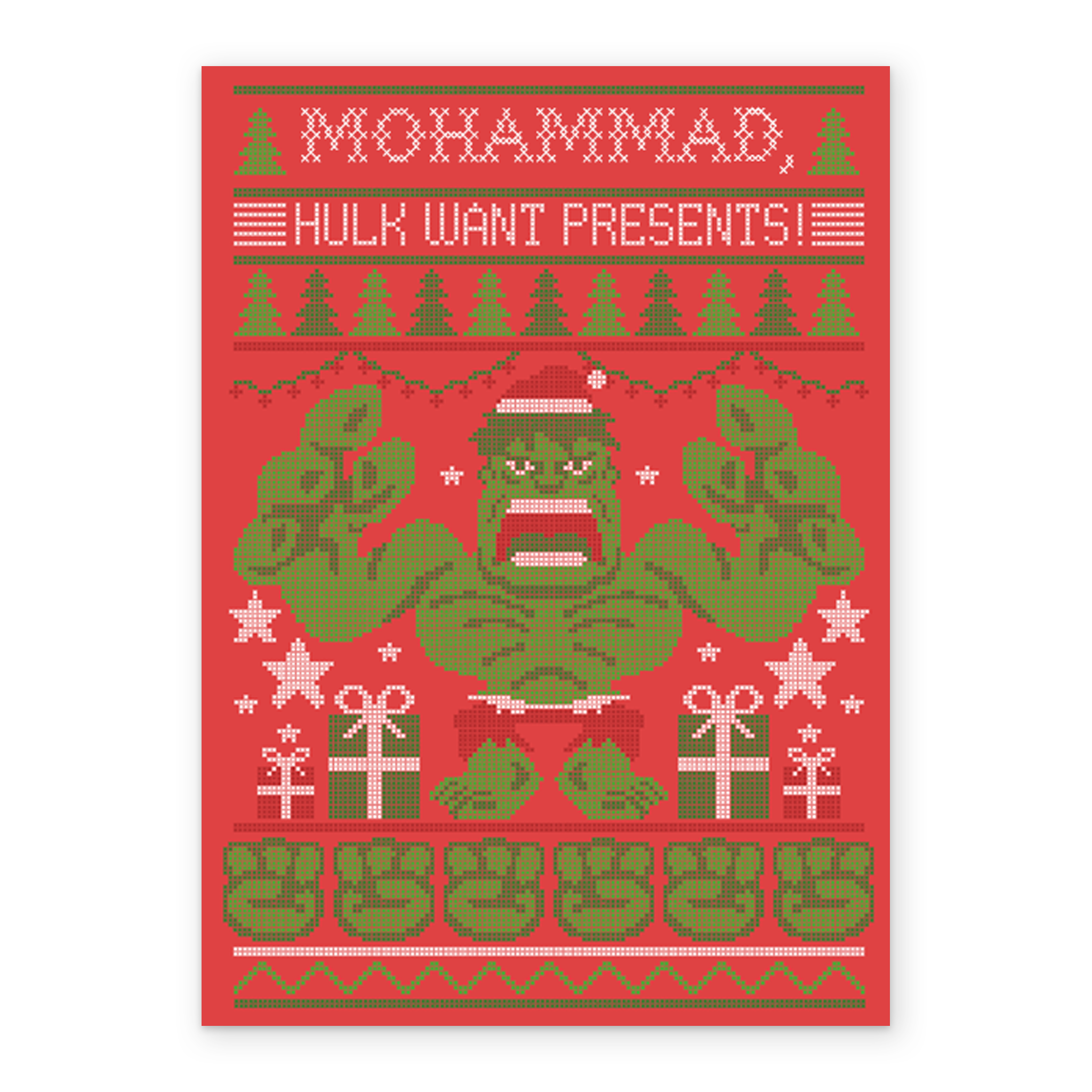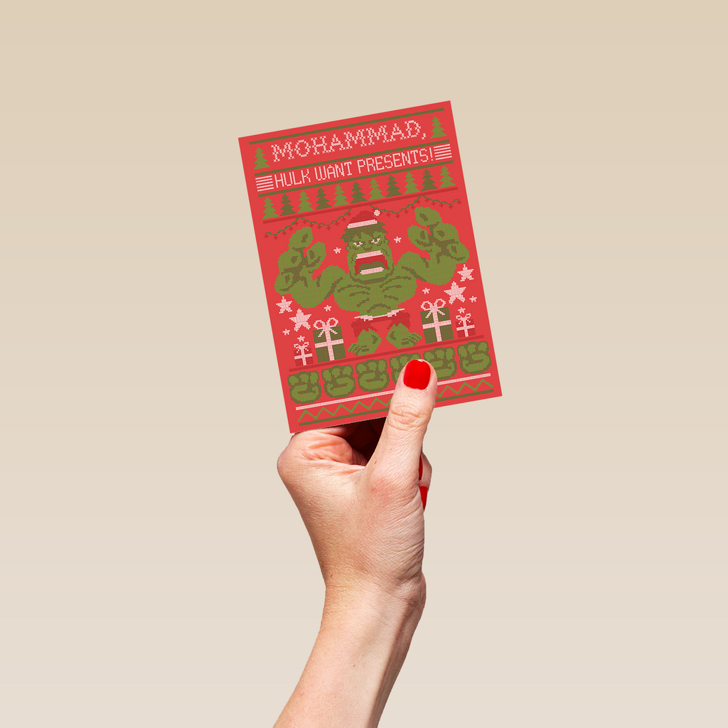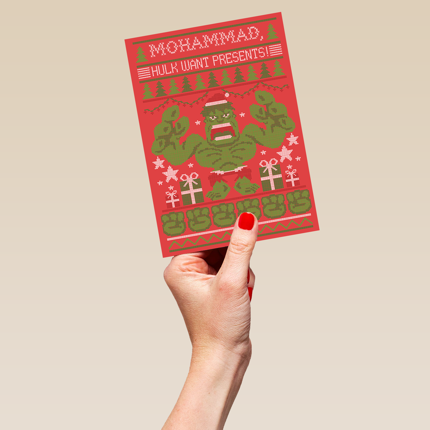 Show them you care with a personalised & editable MARVEL Avengers Hulk Christmas card from Hallmark. Our Christmas cards are printed on premium quality, FSC®-certified card & delivered nationwide. This card is available as standard 12cm by 16.7cm and large 15.5cm by 21.6cm.