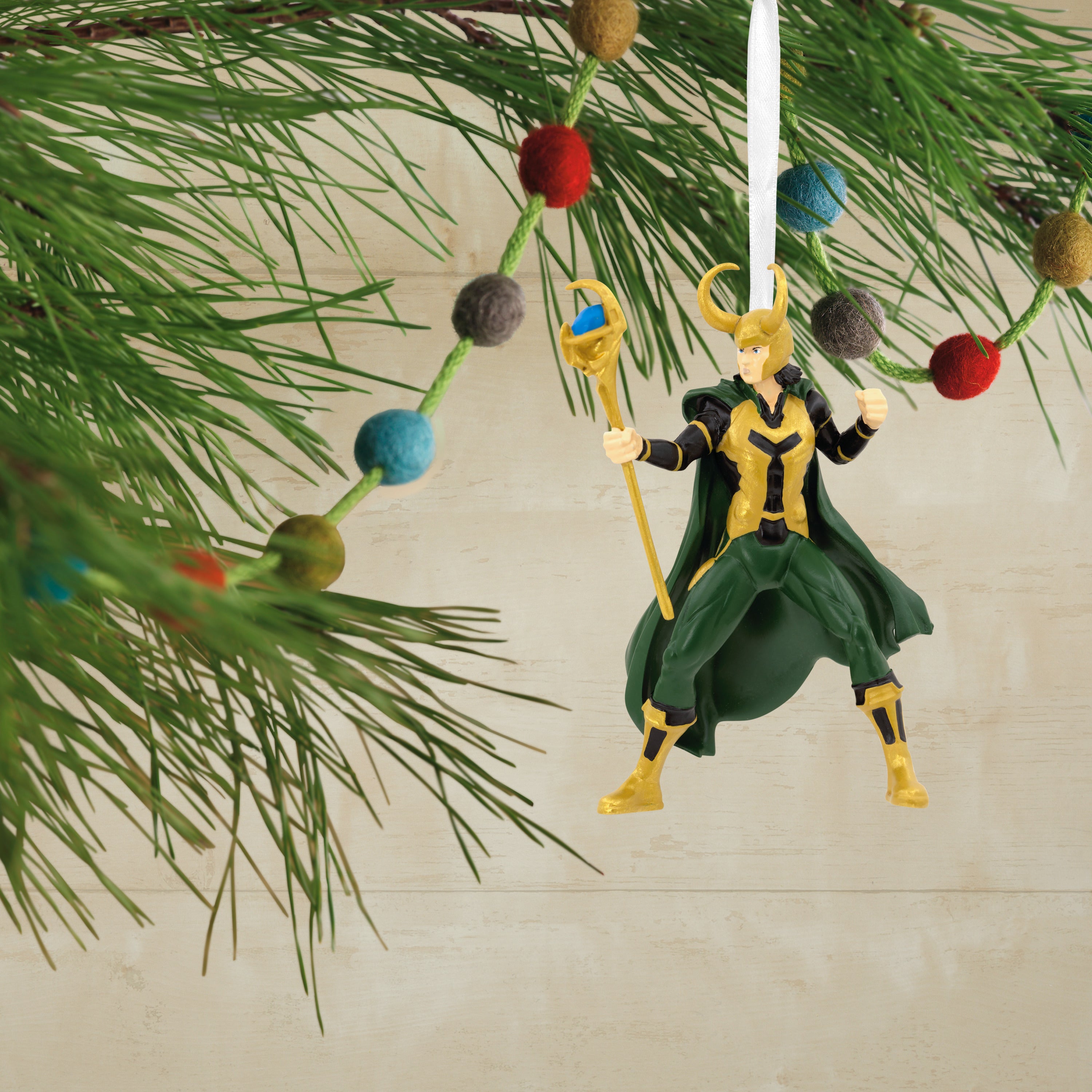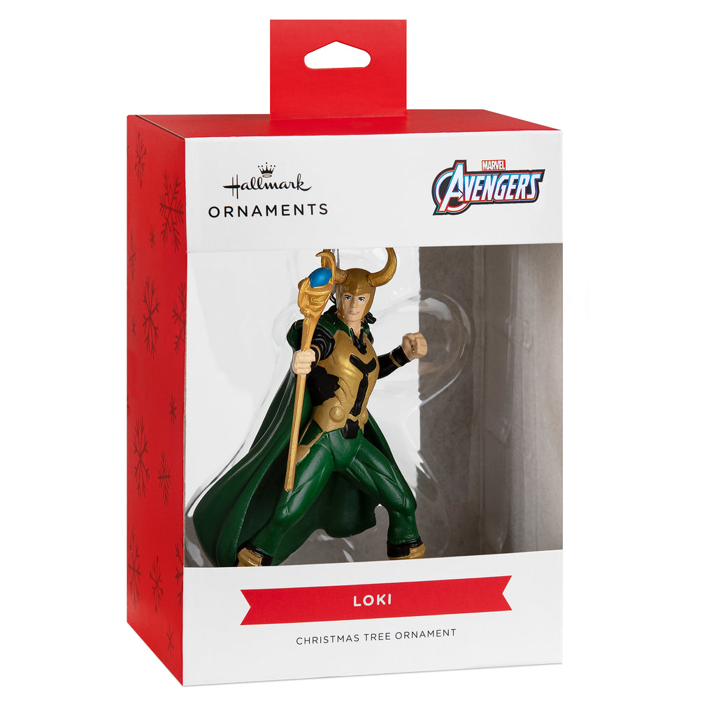 This hanging ornament is made from hard-wearing resin and features MARVEL Villain, Loki with his horned helmet and Sceptre, a hanging loop and white ribbon.