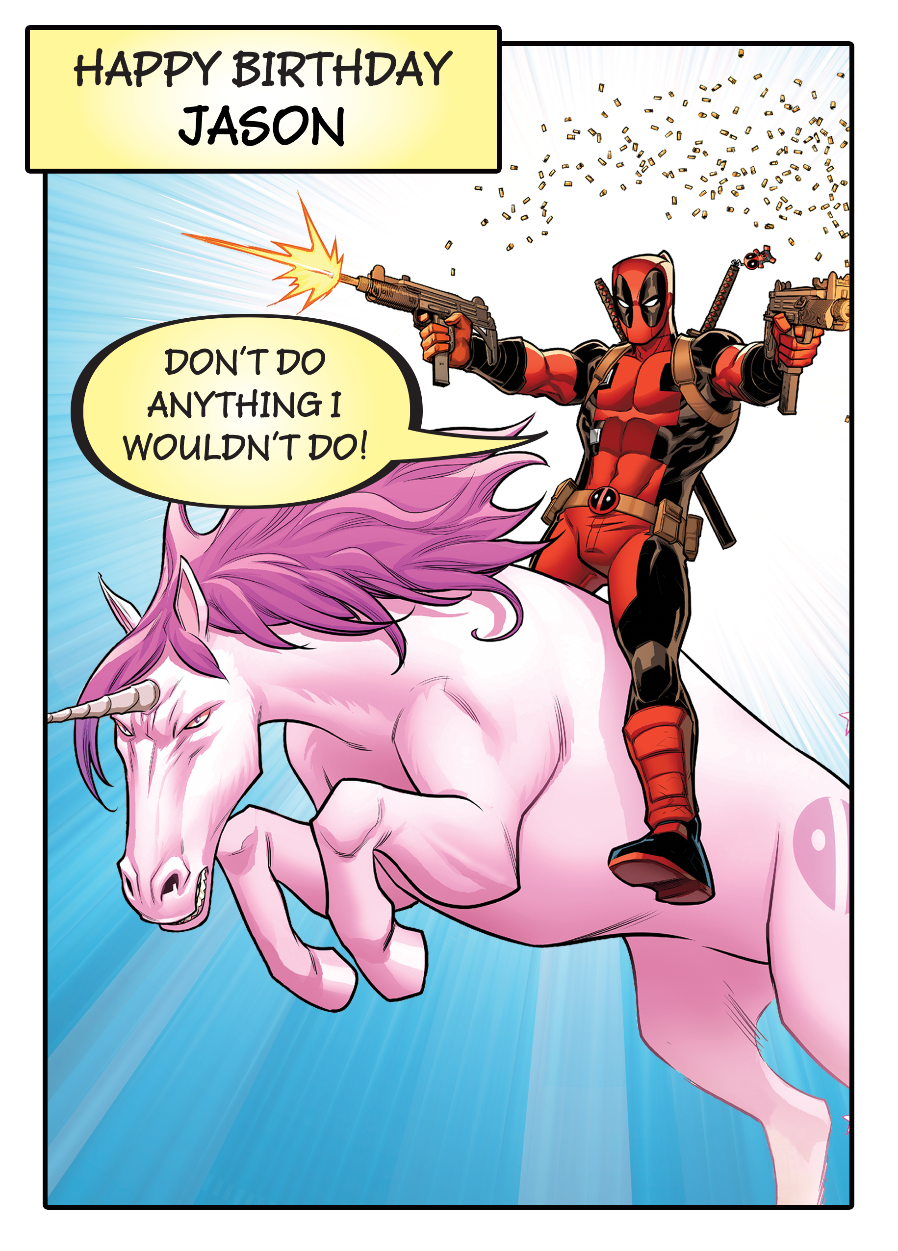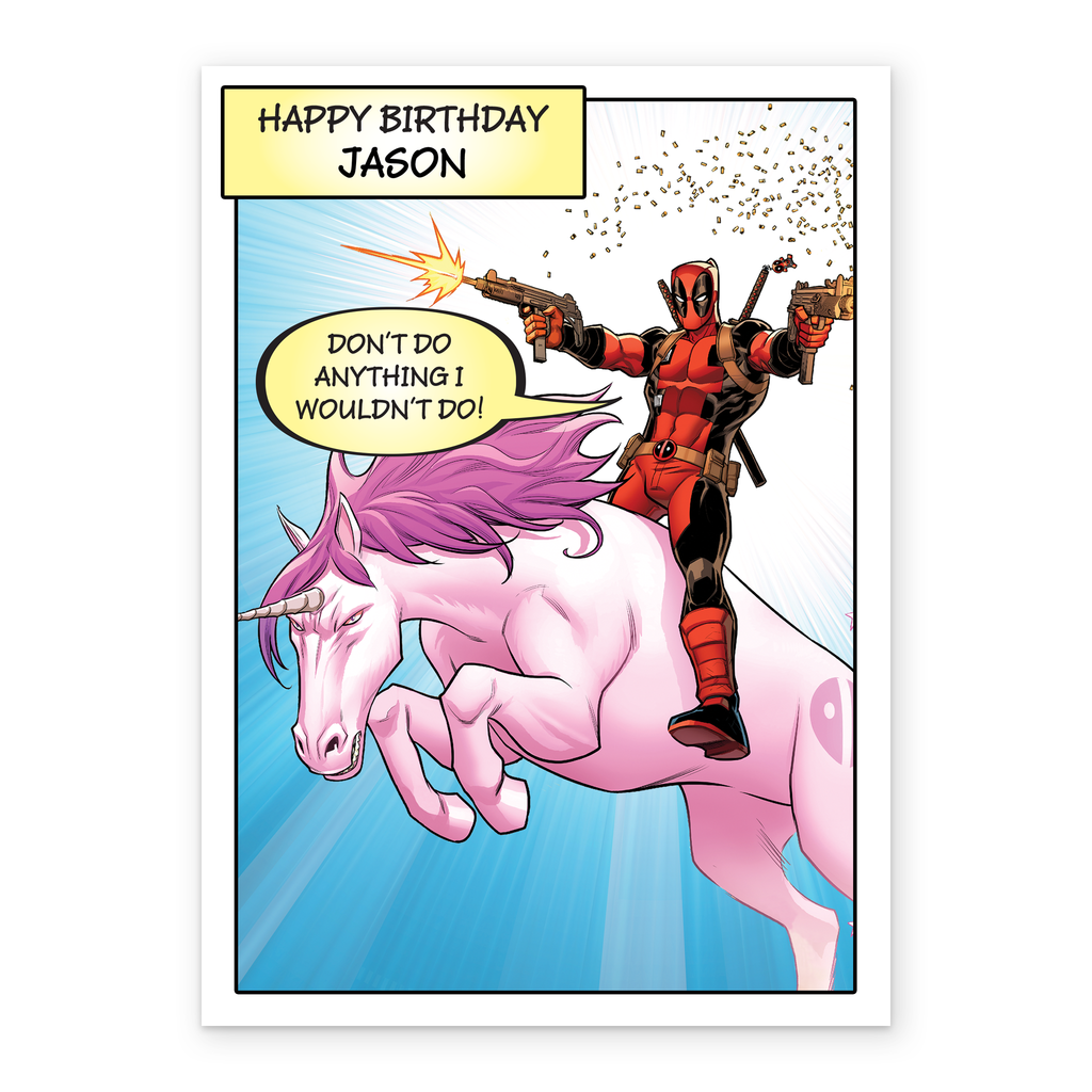 Deadpool has arrived to make this the most action-packed birthday yet! Make their big day one to remember with this epic personalised and editable birthday card. The perfect way to fill their day with laughter, jokes and a giant pink unicorn.