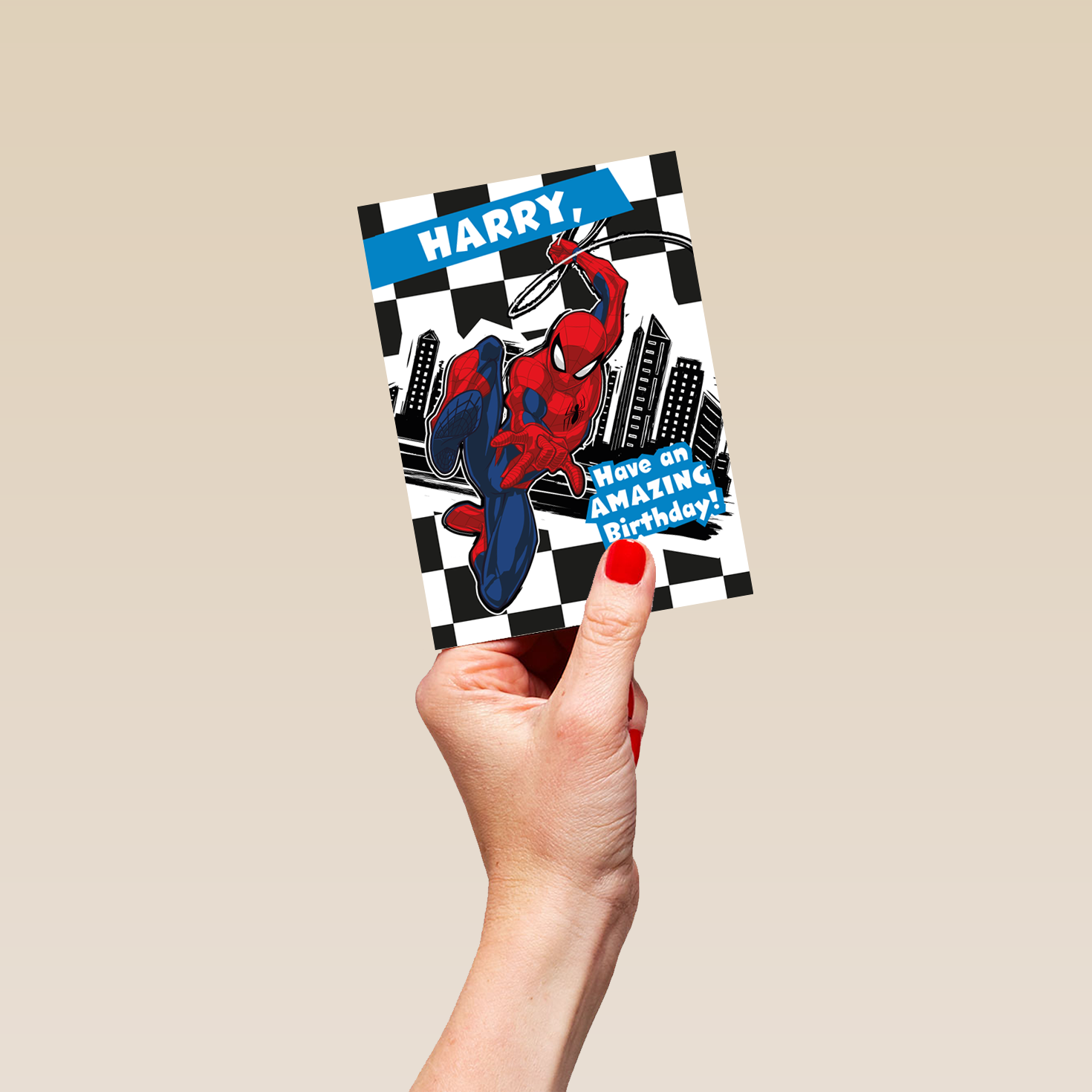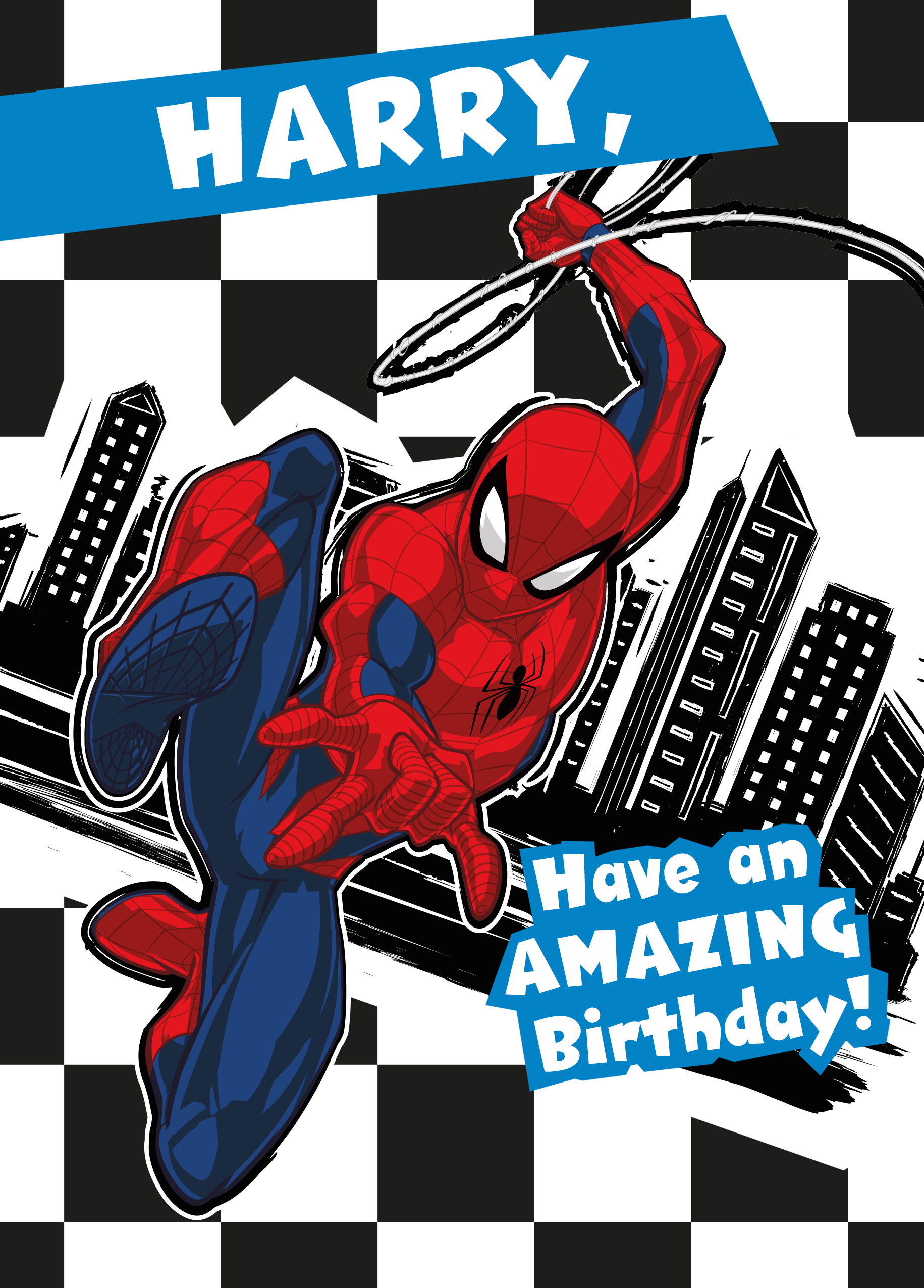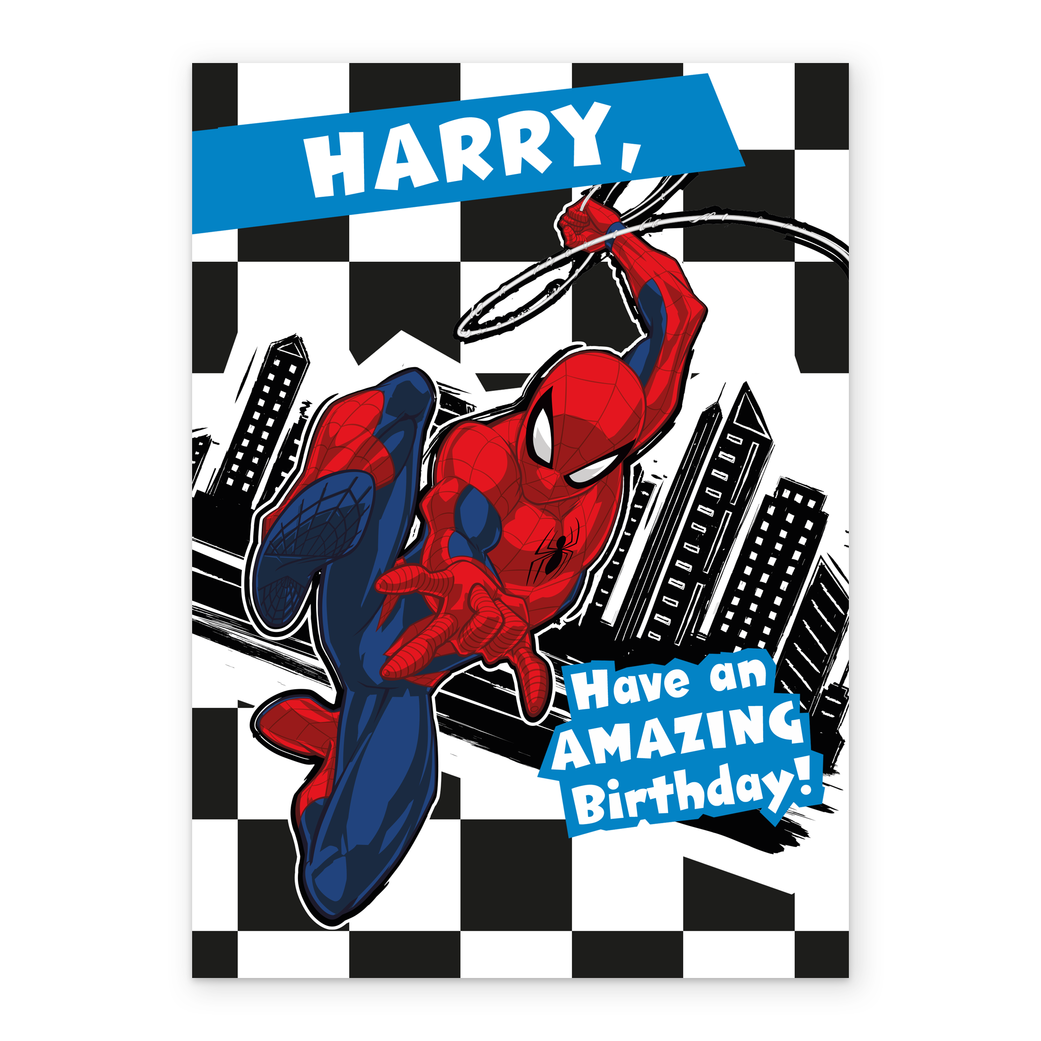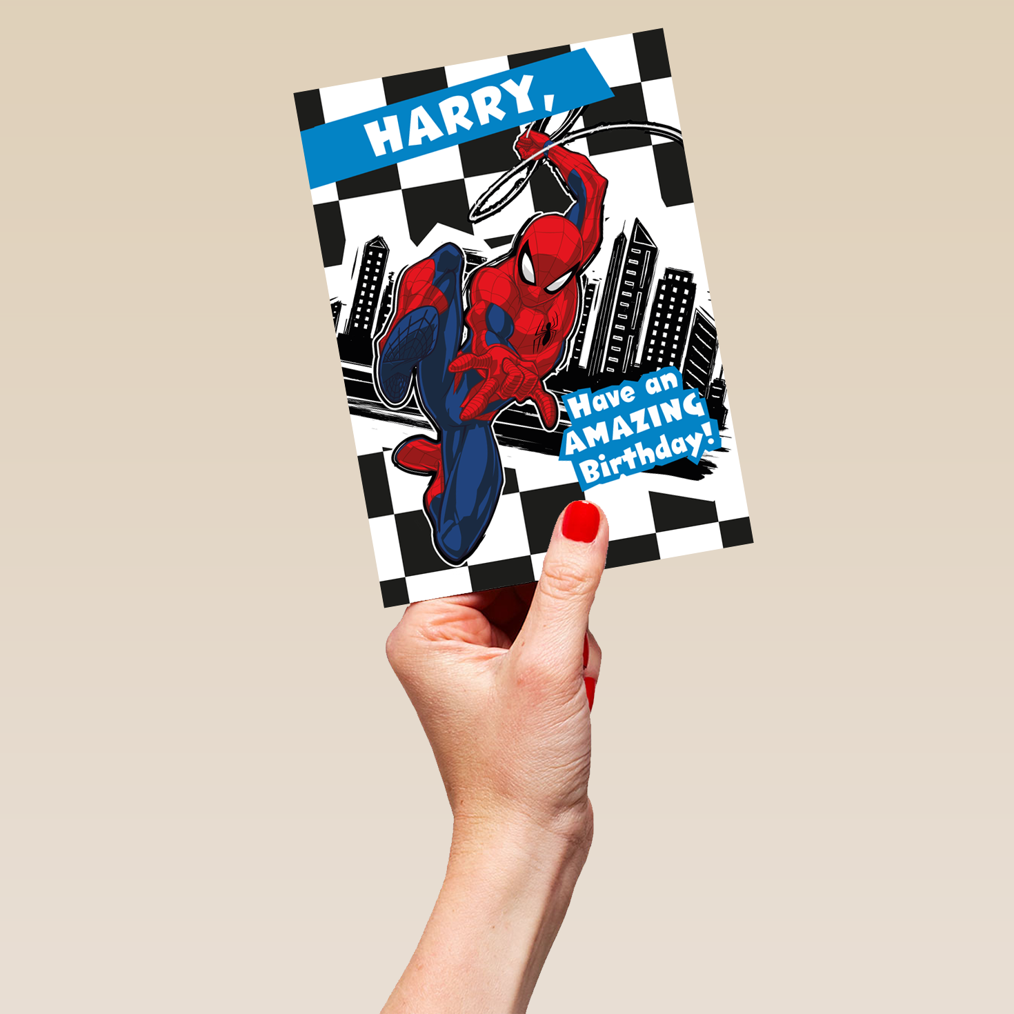 Printed on premium-quality board, this card features MARVEL's Spider-Man in his iconic red and blue suit, web-slinging across Manhattan's towers, on a black and white chequered background, with the message 'Have an Amazing Birthday!', space to personalise a name, and comes complete with a co-ordinating white envelope.