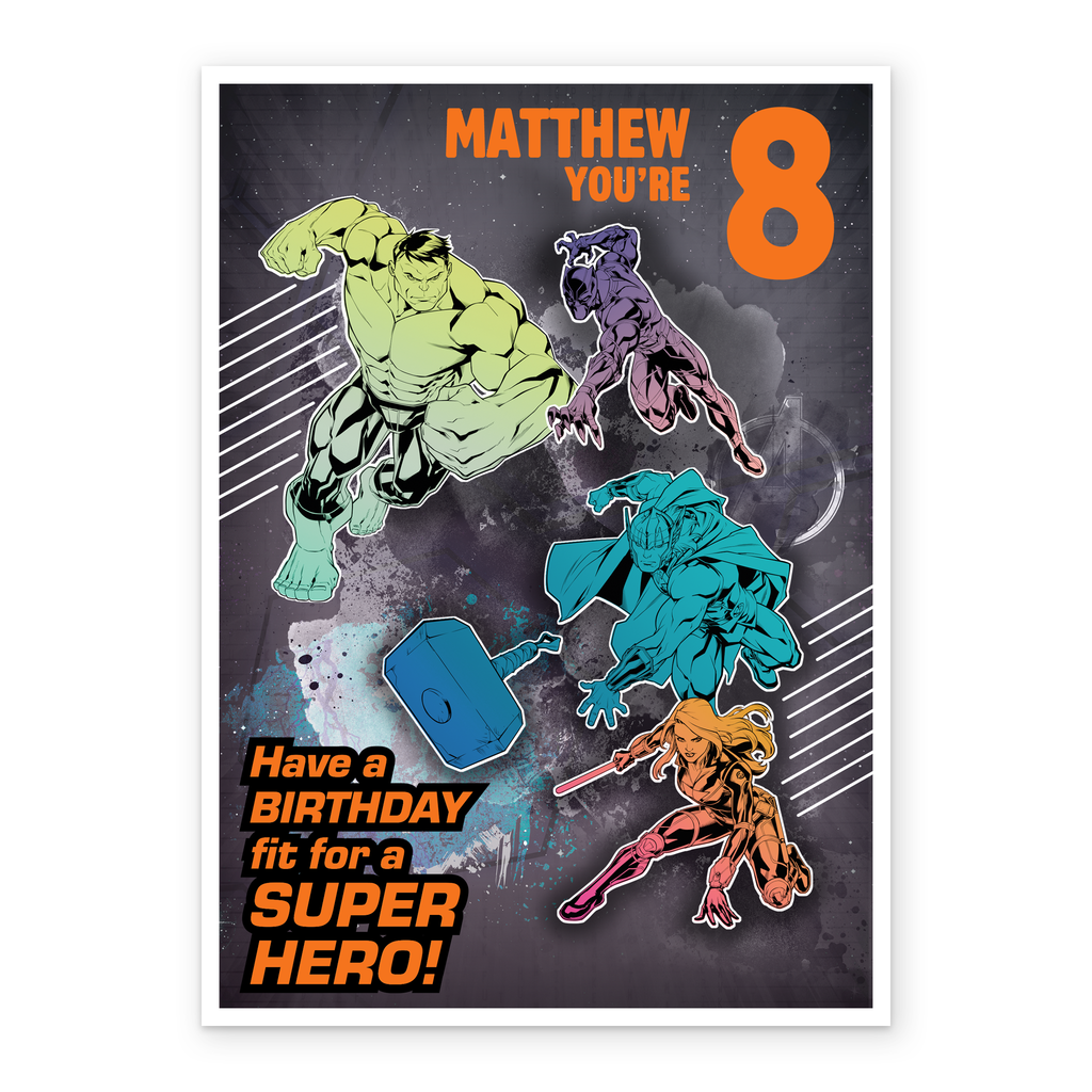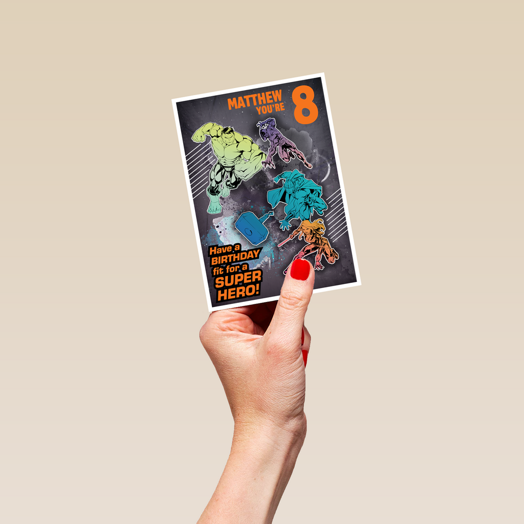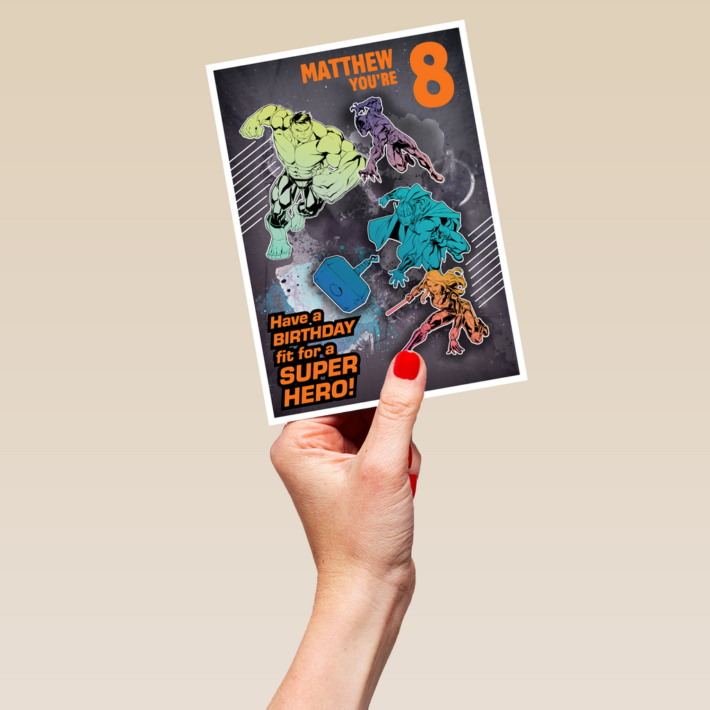 Show them you care with a personalised MARVEL Avengers Age 8th Birthday Card from Hallmark.