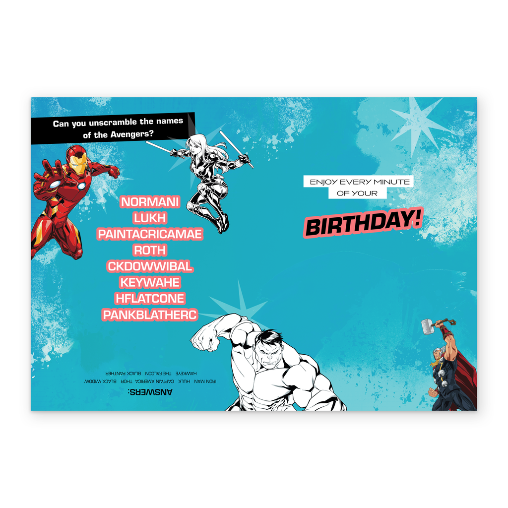Printed on premium-quality board, this card features Earth's Mightiest Heroes, MARVEL's Avengers! The Incredible Hulk, Black Panther, Thor and Black Widow in heroic, poses on a worn-effect grey and blue background, with the message 'Have a Birthday fit for a Super Hero!', and comes complete with a co-ordinating white envelope.
