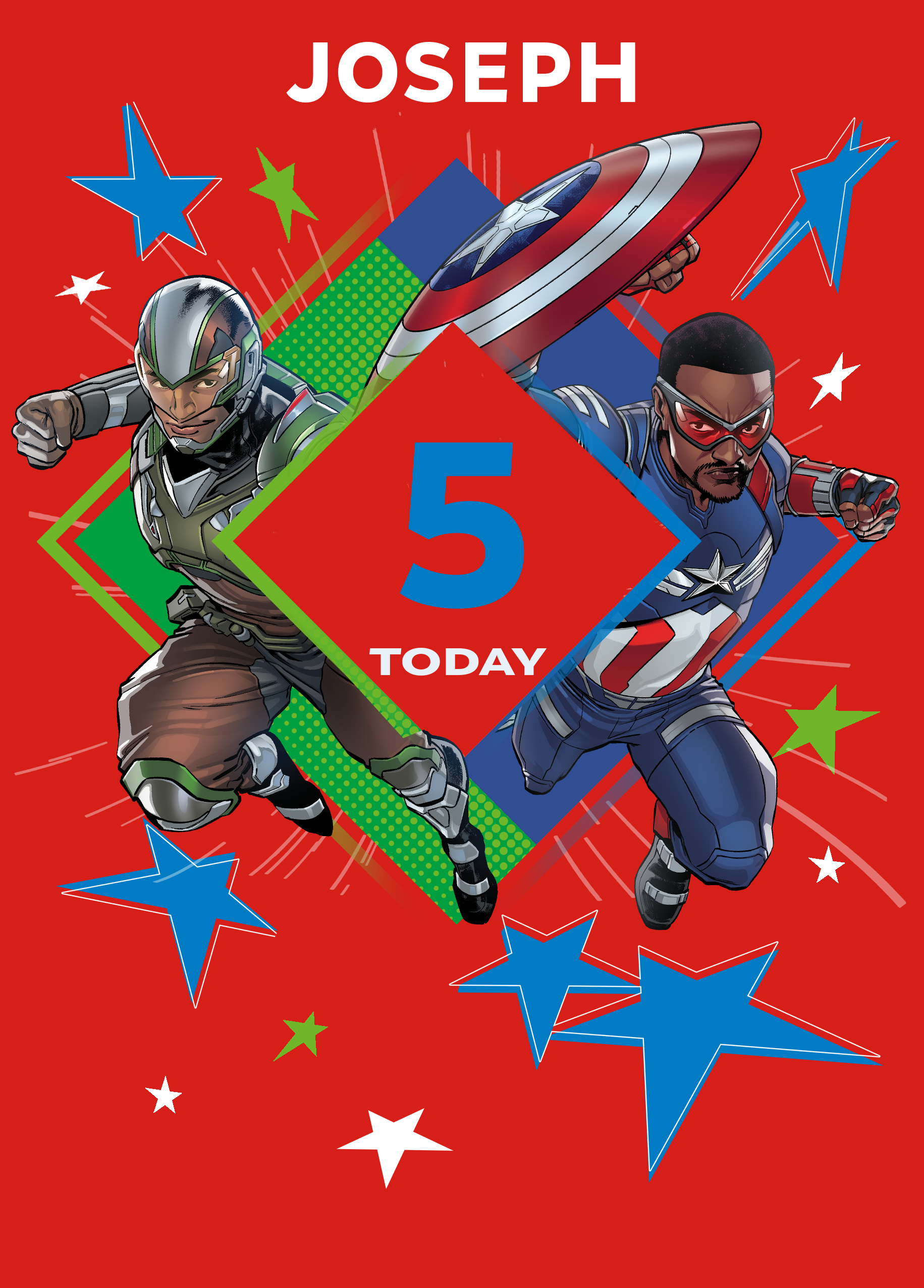 Printed on premium-quality board, this card features Sam Wilson's Captain America and Joaquin Torres's Falcon from MARVEL's Captain America: Brave New World, with the message '[NAME] [AGE] Today', space to personalise a name and the age, and comes complete with a co-ordinating white envelope.