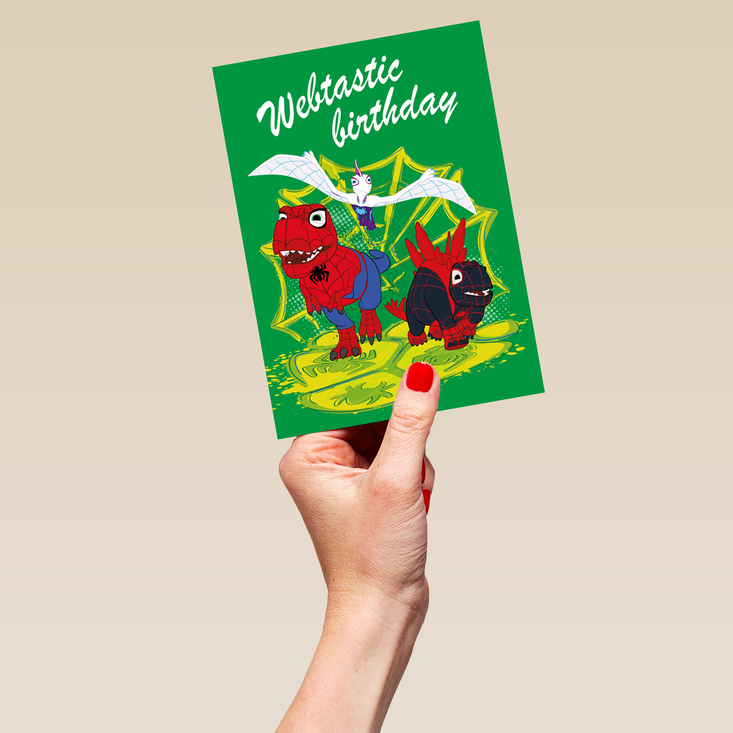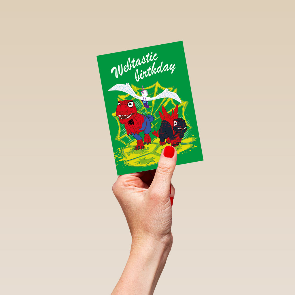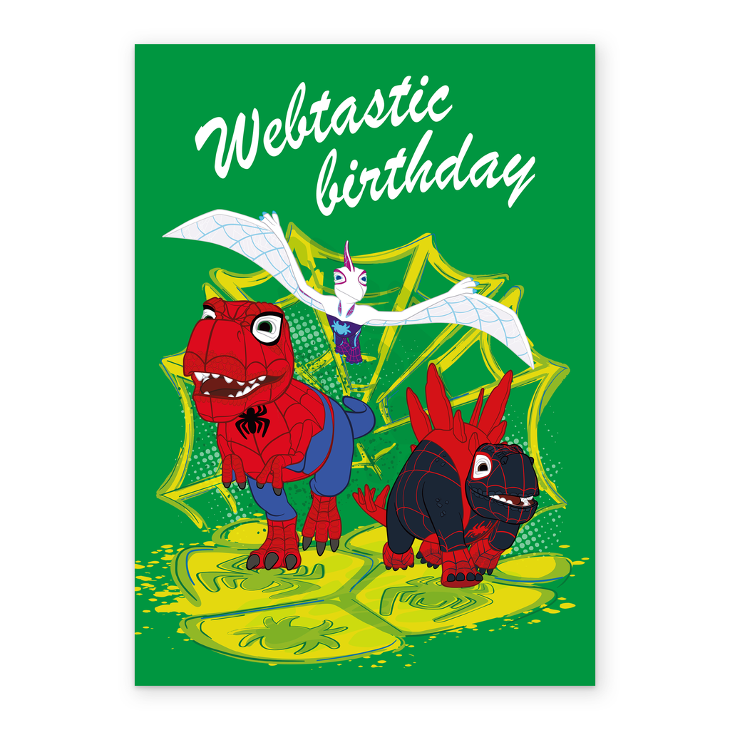 Printed on premium-quality board, this card features Spin's Stegosaurus Spider-Man, Pter Ptarker's Spider-Rex and Humberto Lopez's Reptil from Spidey and His Amazing Friends, with the message 'Webtastic birthday', and comes complete with a co-ordinating white envelope.