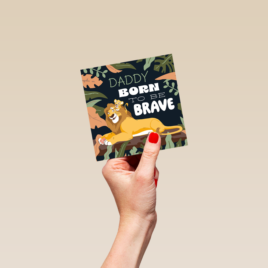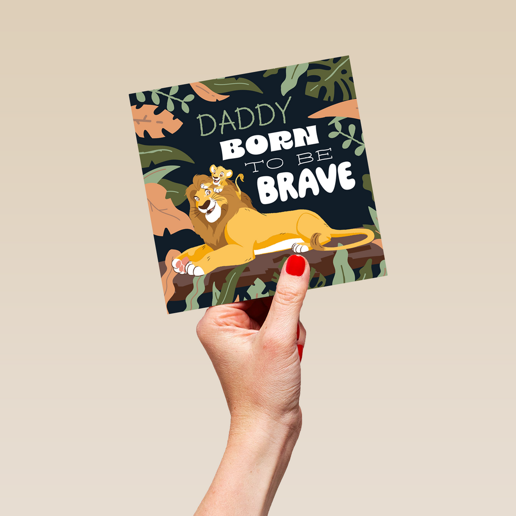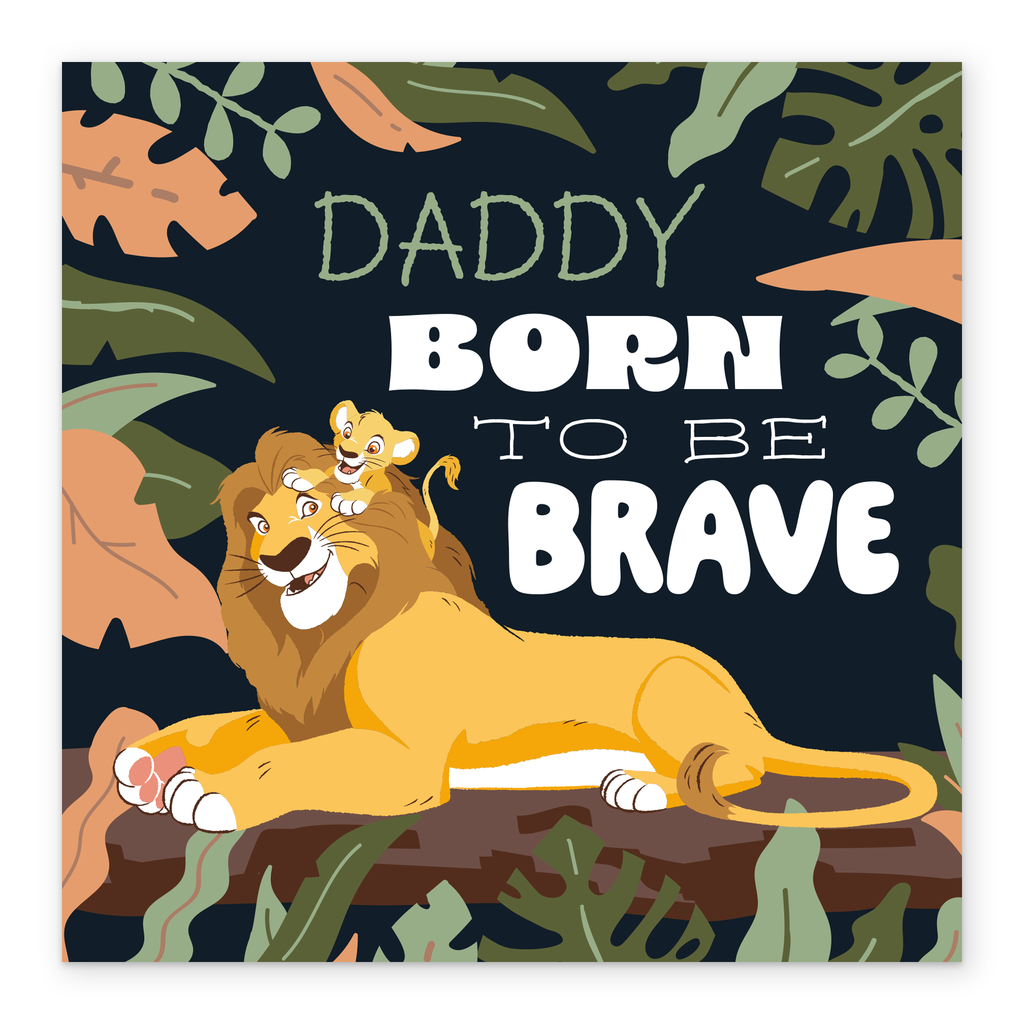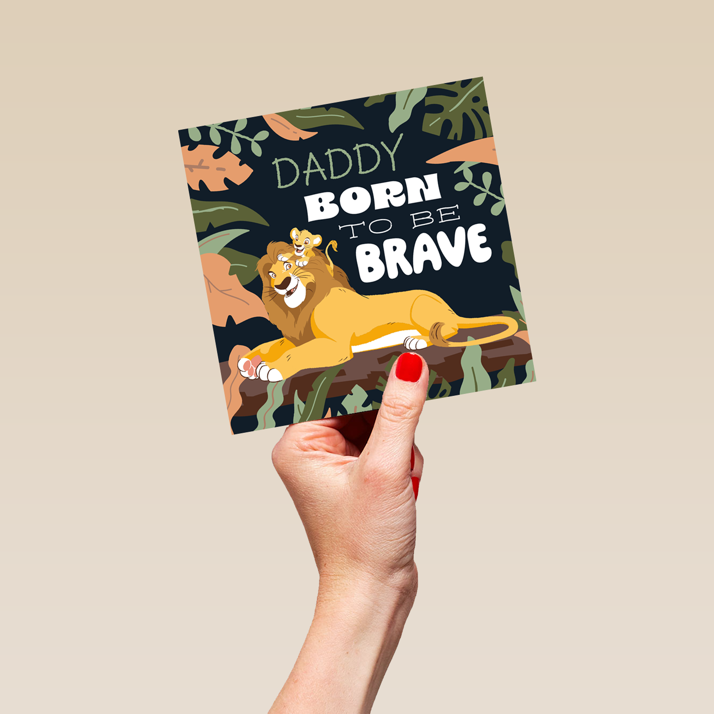 Printed on premium-quality board, this card features Mufasa and Simba, with the message 'Born to be brave', space to personalise a name, and comes complete with a co-ordinating white envelope.