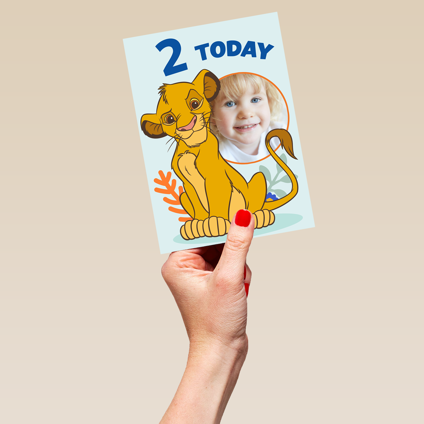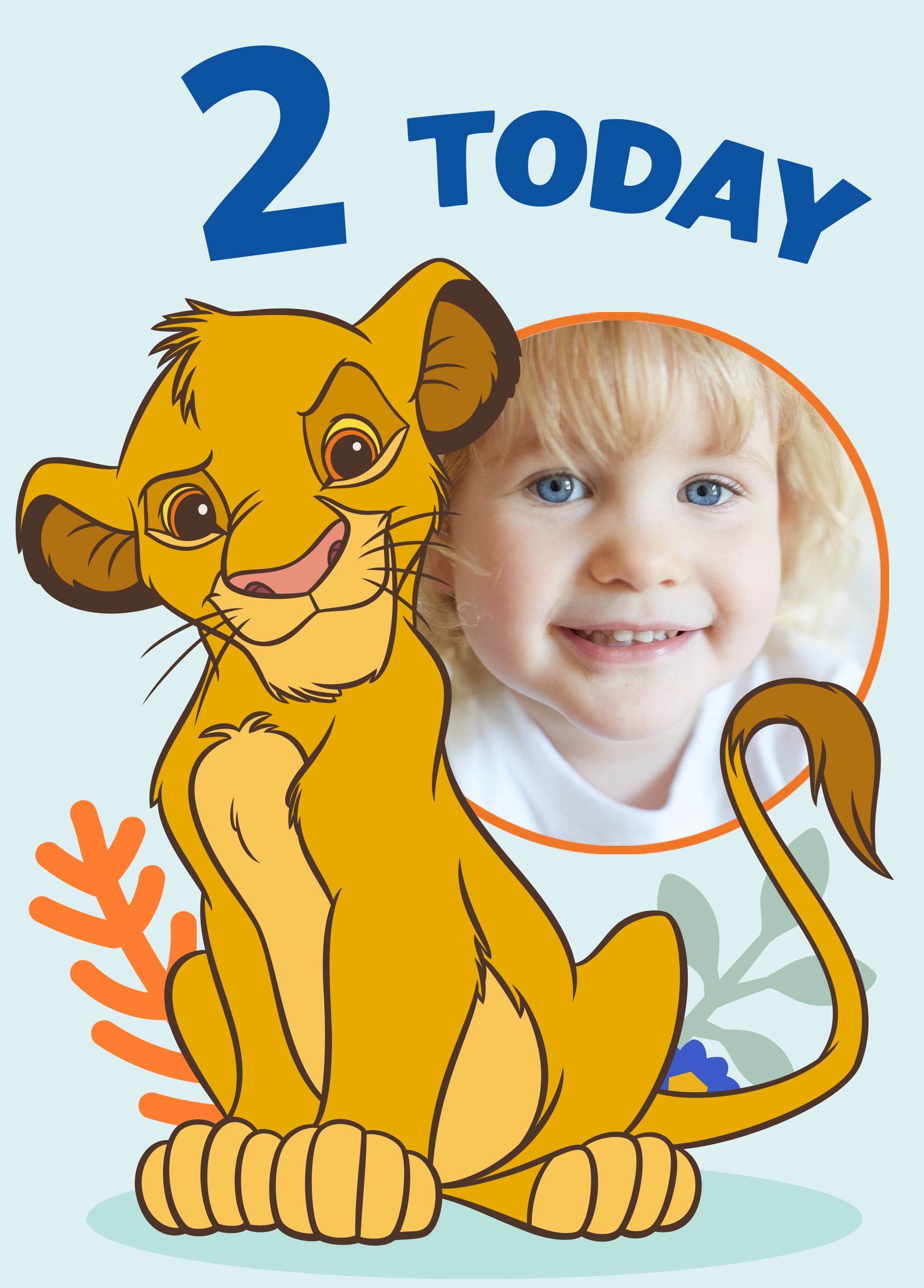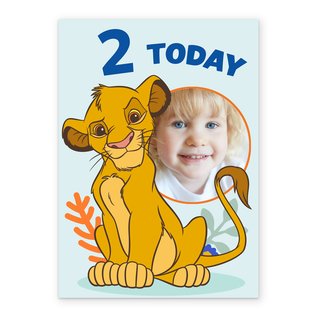 Printed on premium-quality board, this card features Simba as a cub on a light blue background, with the message '[AGE] Today', space to upload a photo and personalise the age, and comes complete with a co-ordinating white envelope.