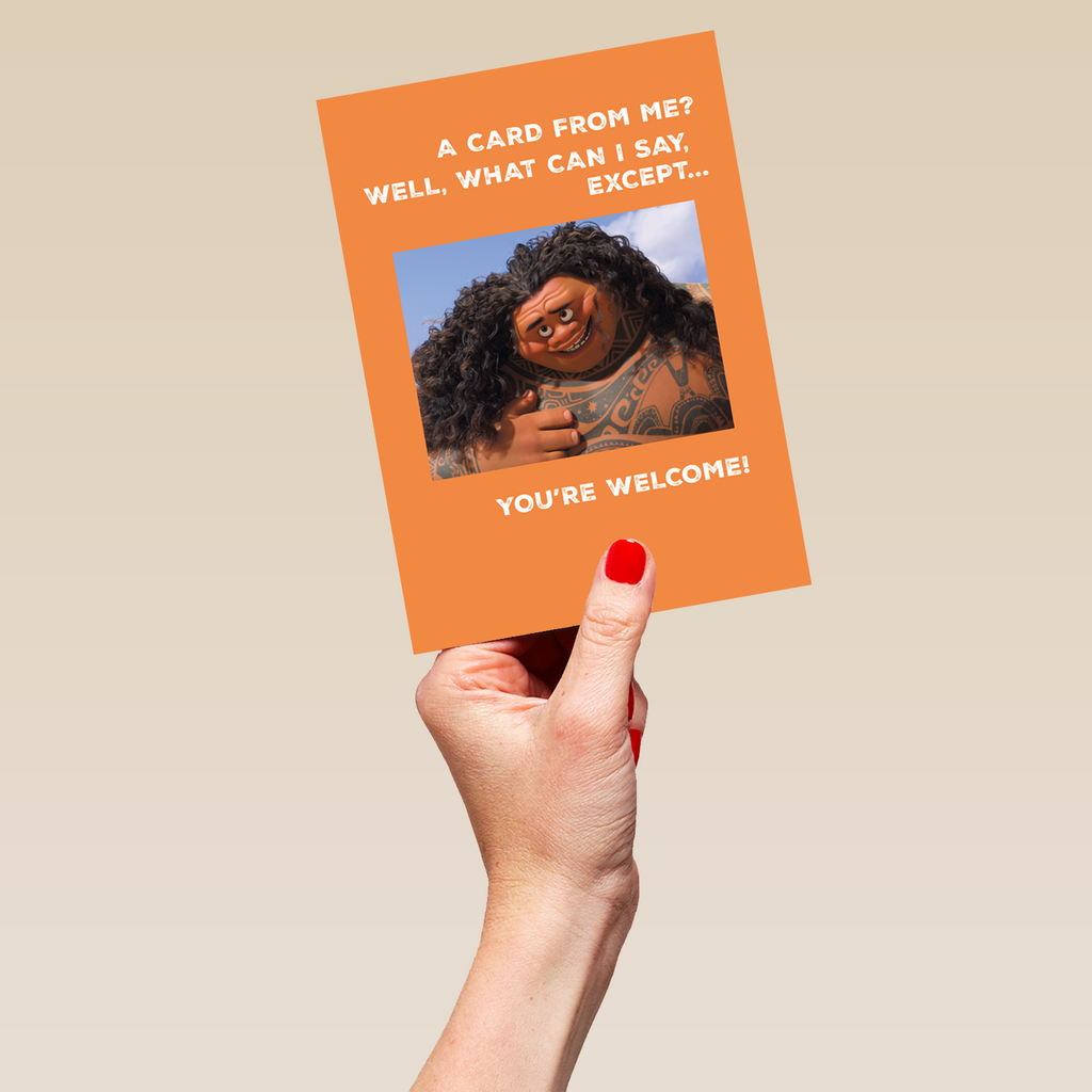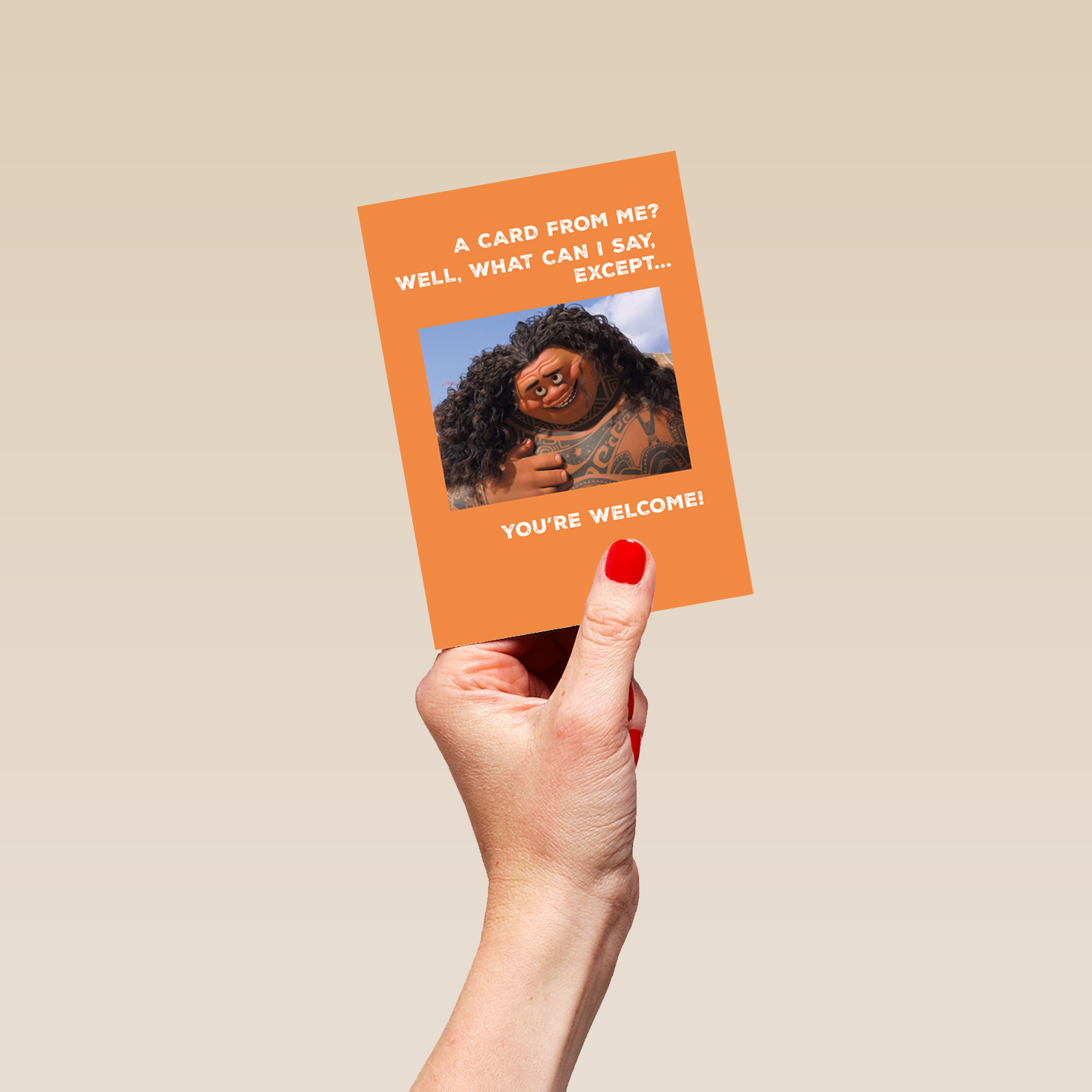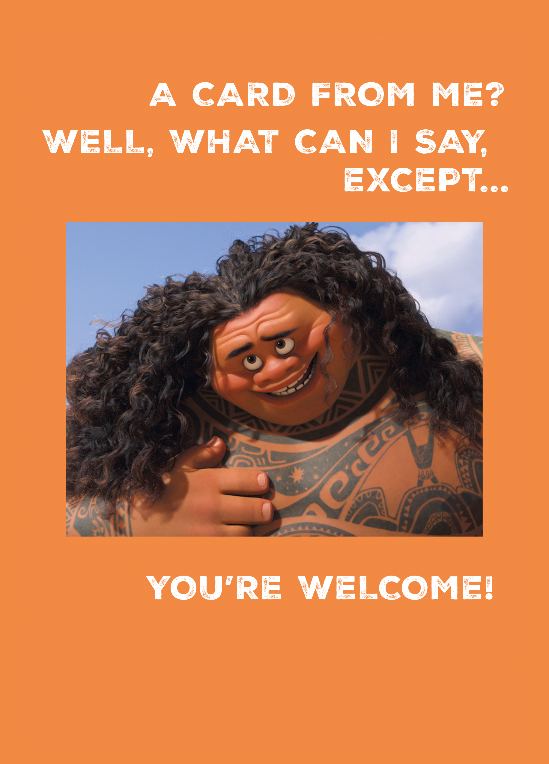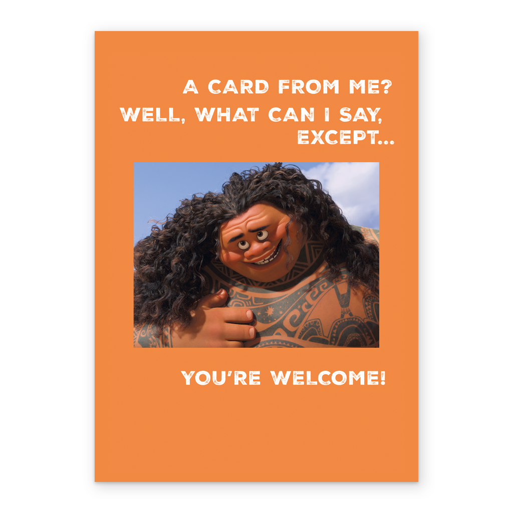 Printed on premium-quality board, this card features Maui from Disney's Moana, with the message 'A Card From Me? Well, What Can I Say, Except... You're Welcome!', and comes complete with a co-ordinating white envelope.