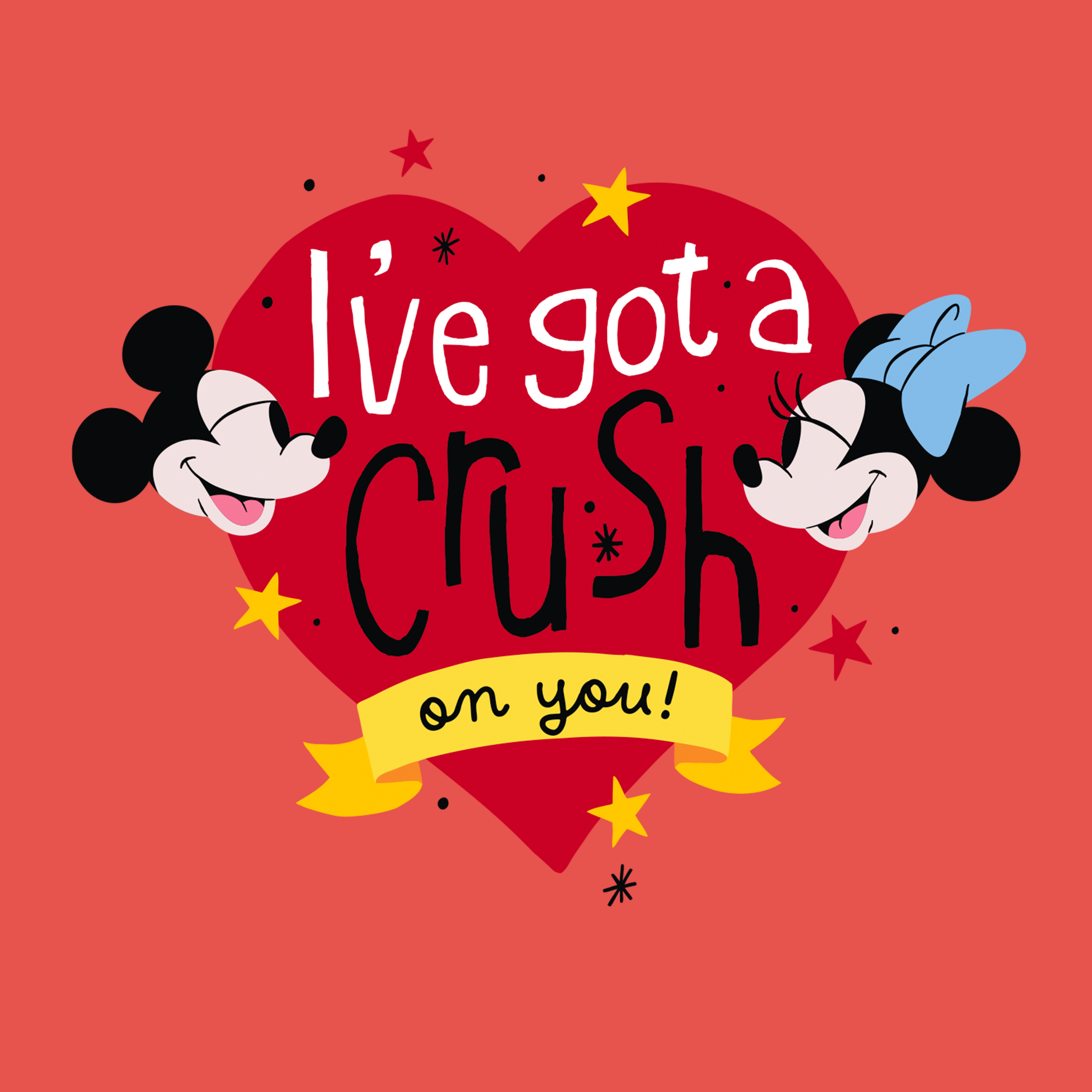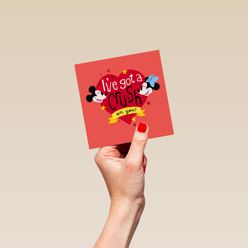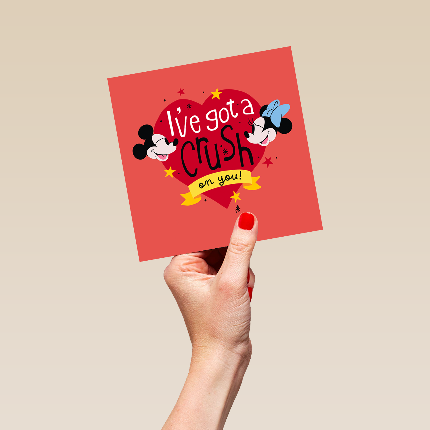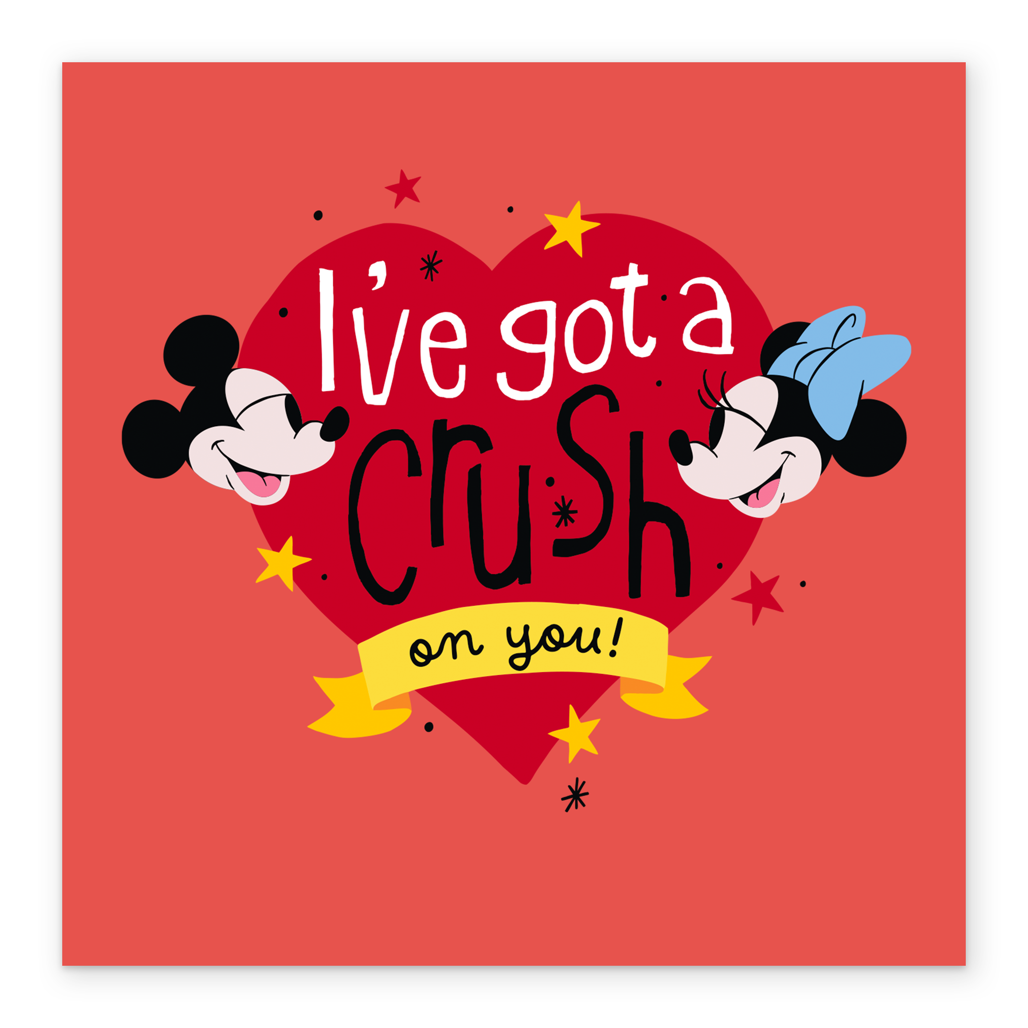 Printed on premium-quality board, this card features Mickey and Minnie Mouse smiling at each other with a big red heart and stars, with the message 'I've got a crush on you!', and comes complete with a co-ordinating white envelope.