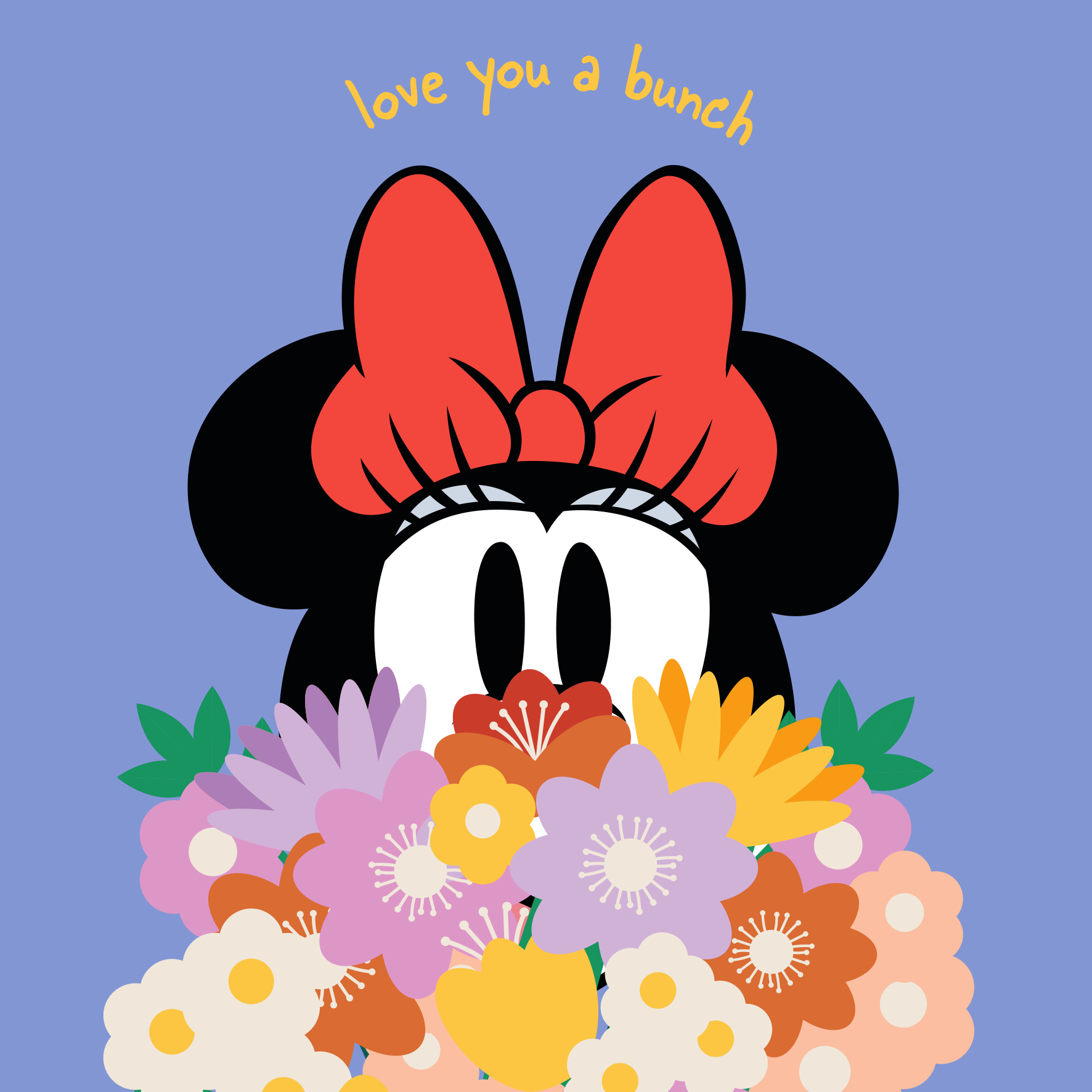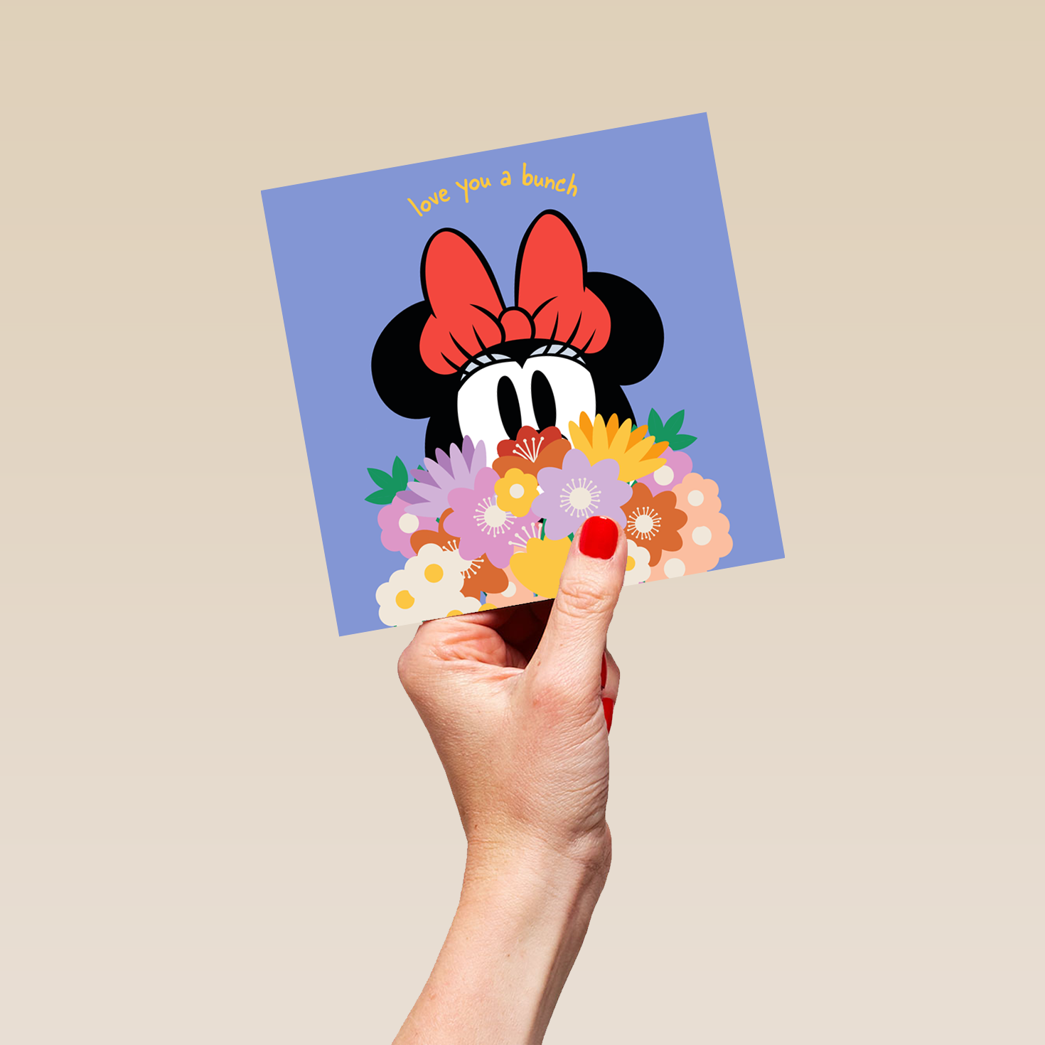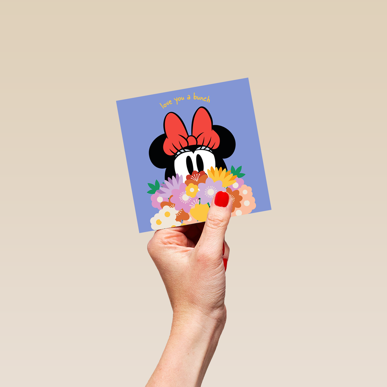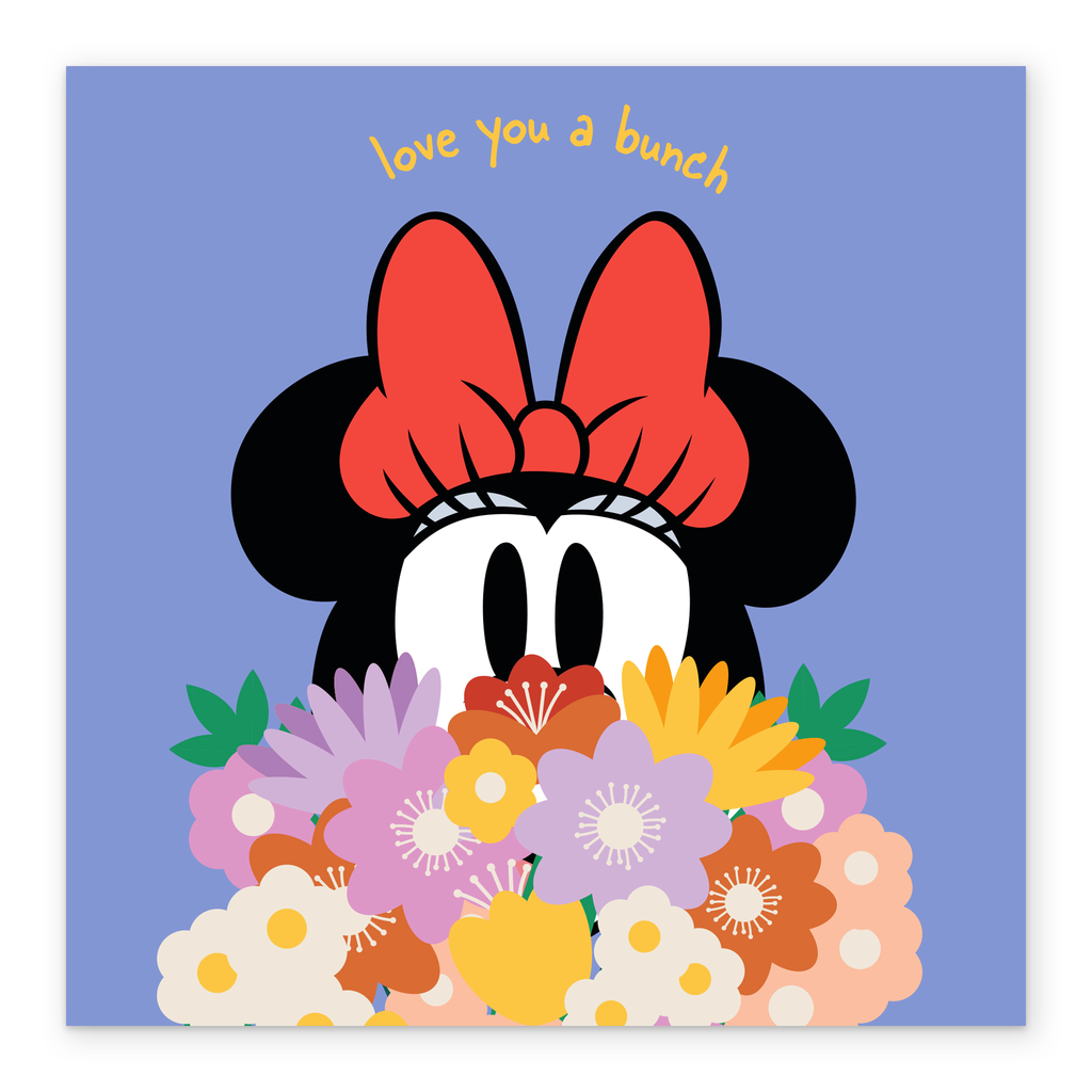 Printed on premium-quality board, this card features Minnie Mouse holding up a bouquet of flowers, with the message 'Love You A Bunch', and comes complete with a co-ordinating white envelope.