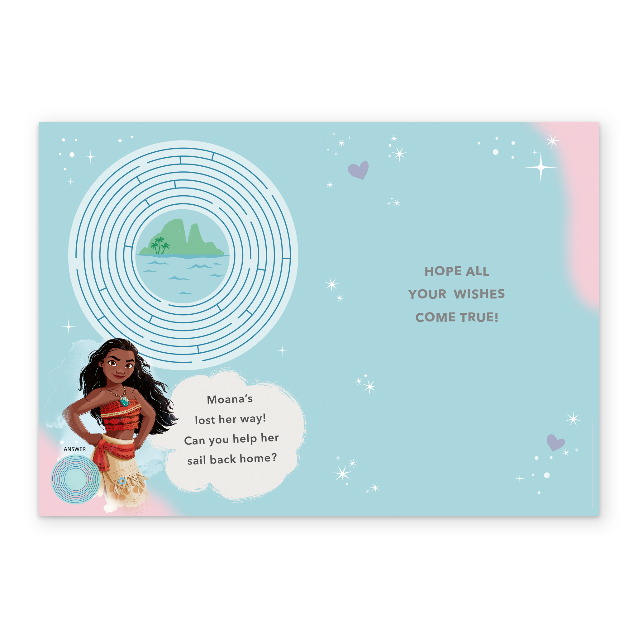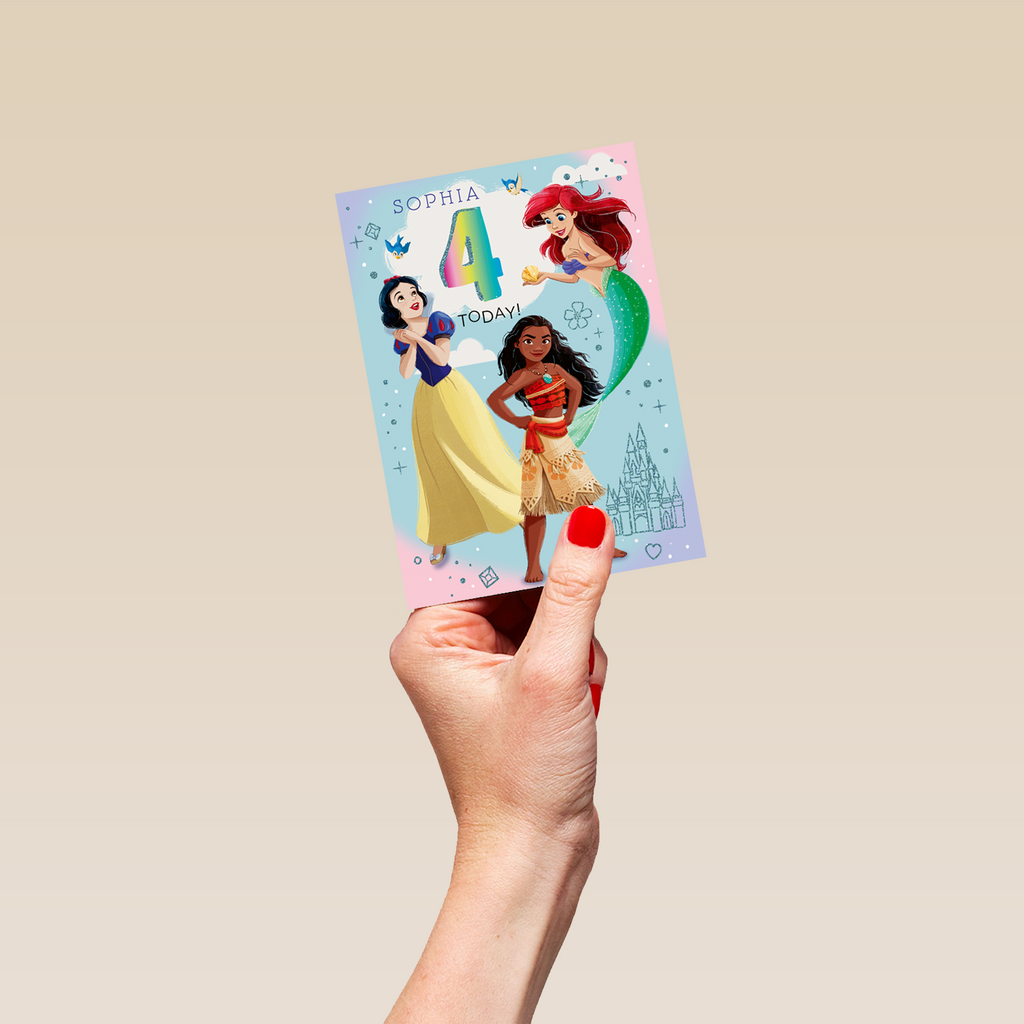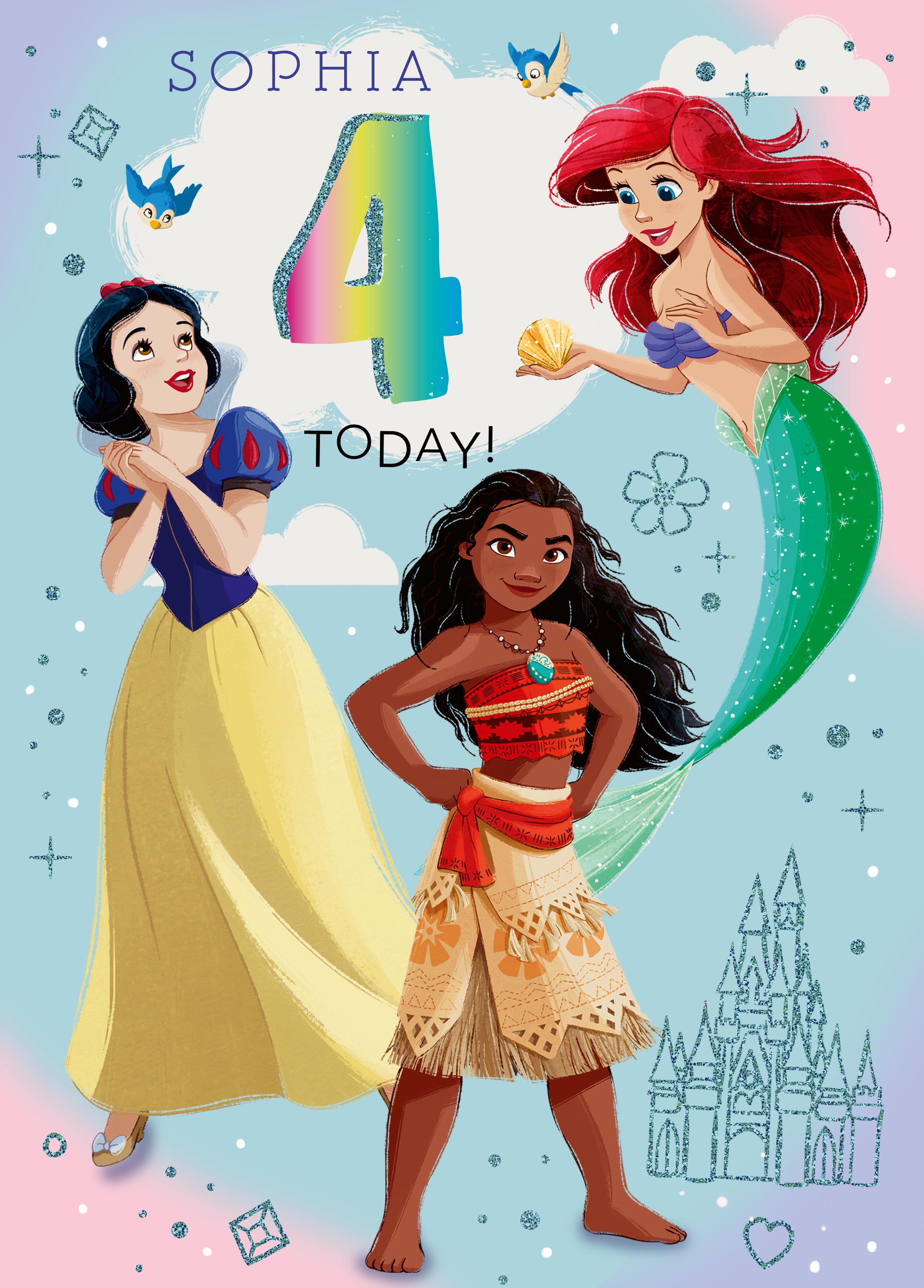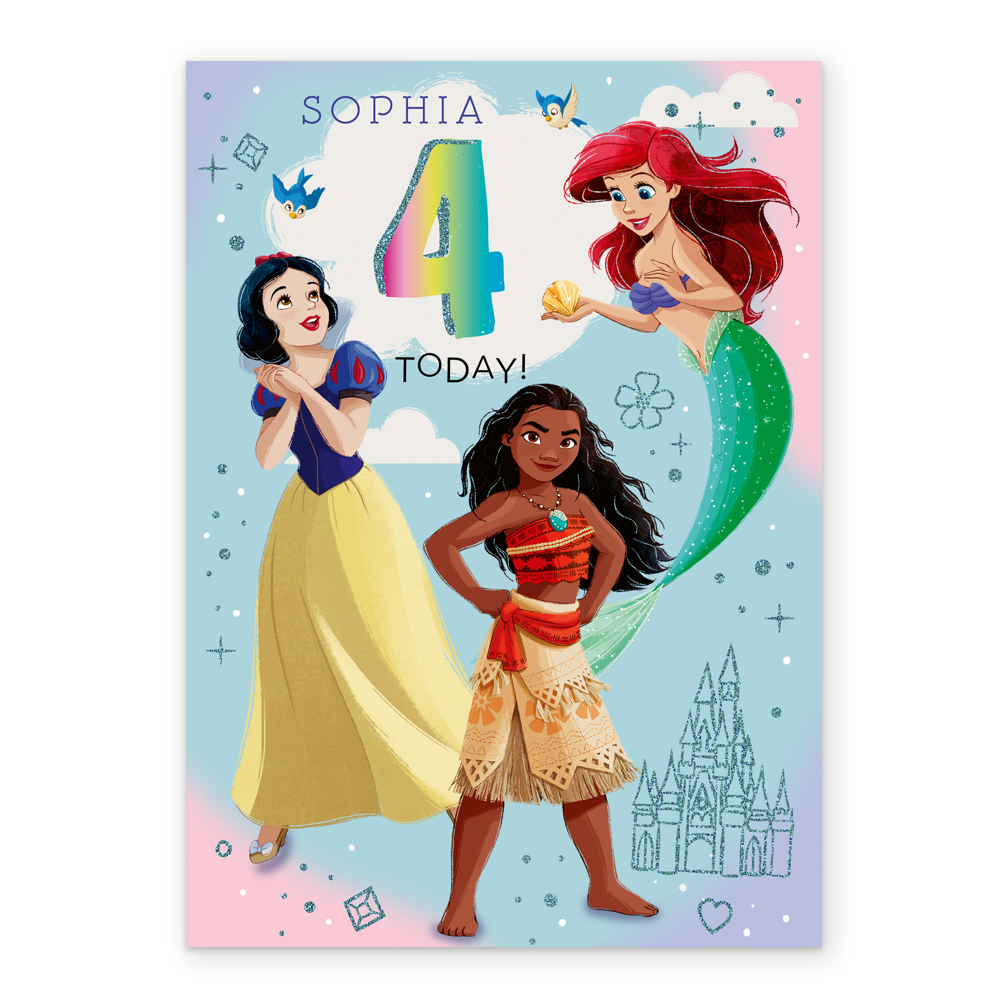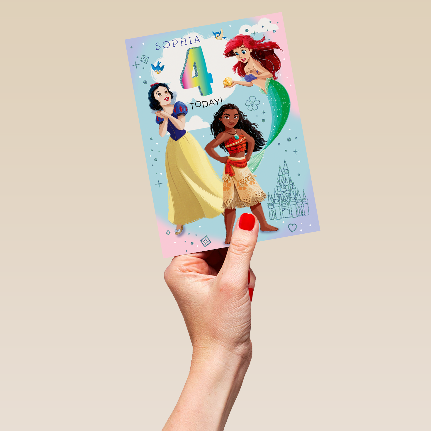 Printed on premium-quality board, this card features Disney princesses Snow White, Moana and Ariel, excited to celebrate a special 4th birthday, on a pretty pink and blue background, with the message '4 Today', space to personalise a name, and comes complete with a co-ordinating white envelope.