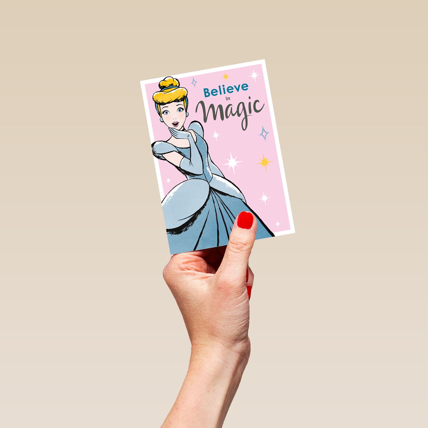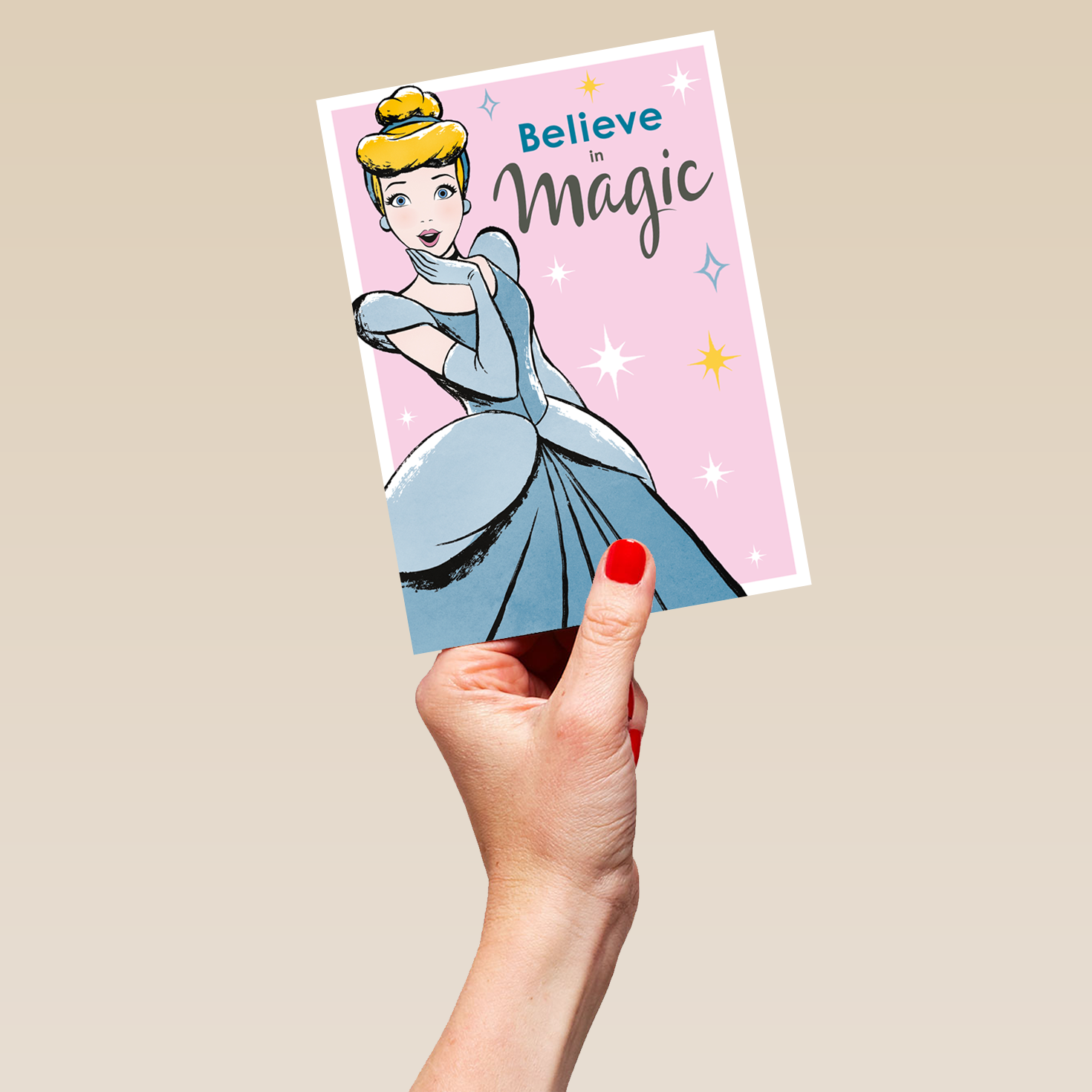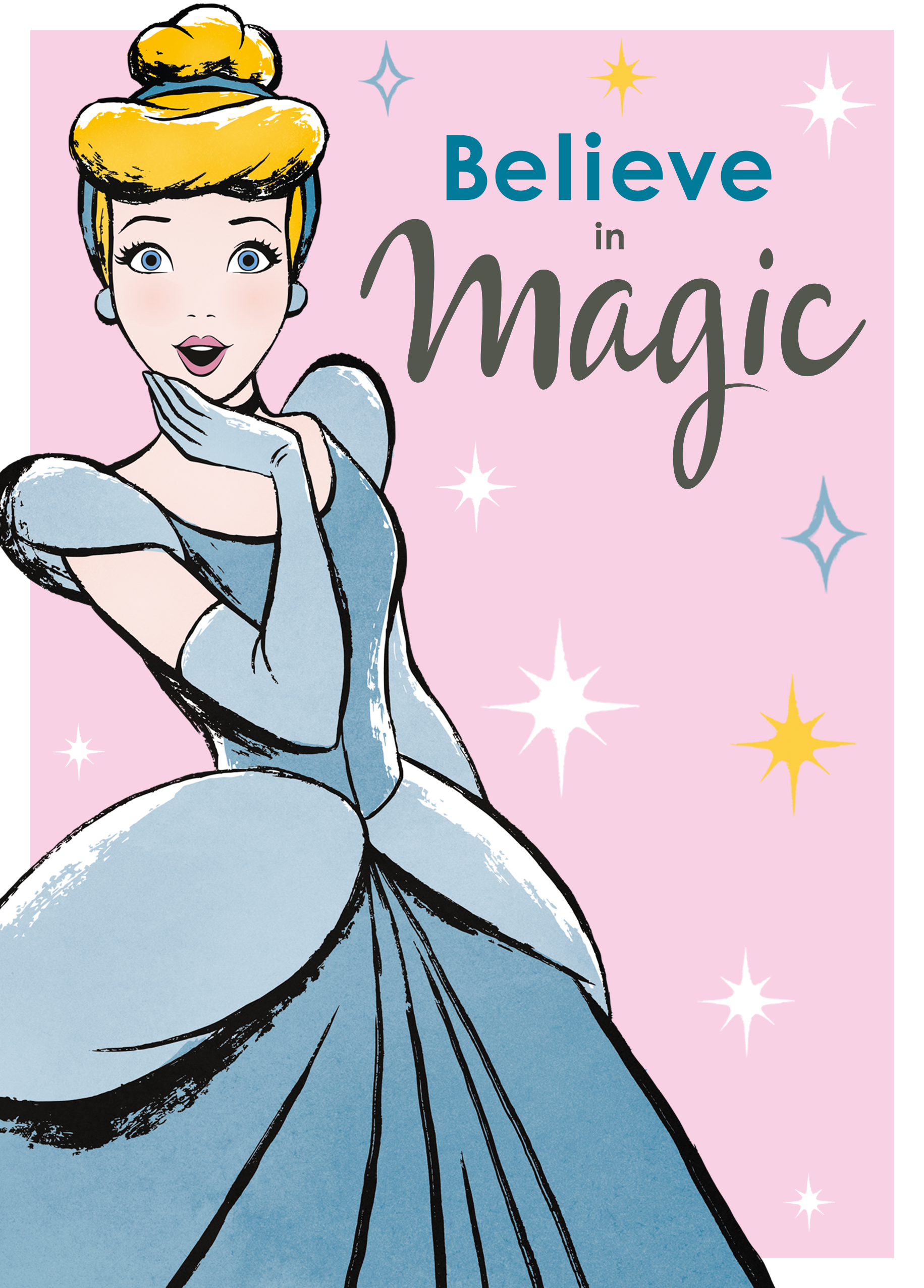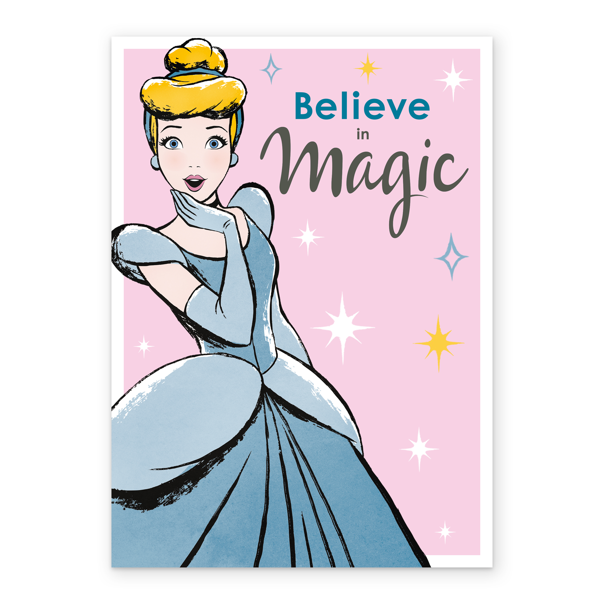 Printed on premium-quality board, this card features Disney's Cinderella, on a light pink background adorned with colourful stars, with the message 'Believe in magic', and comes complete with a co-ordinating white envelope.