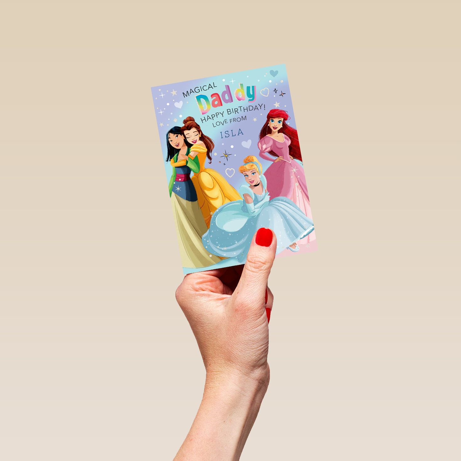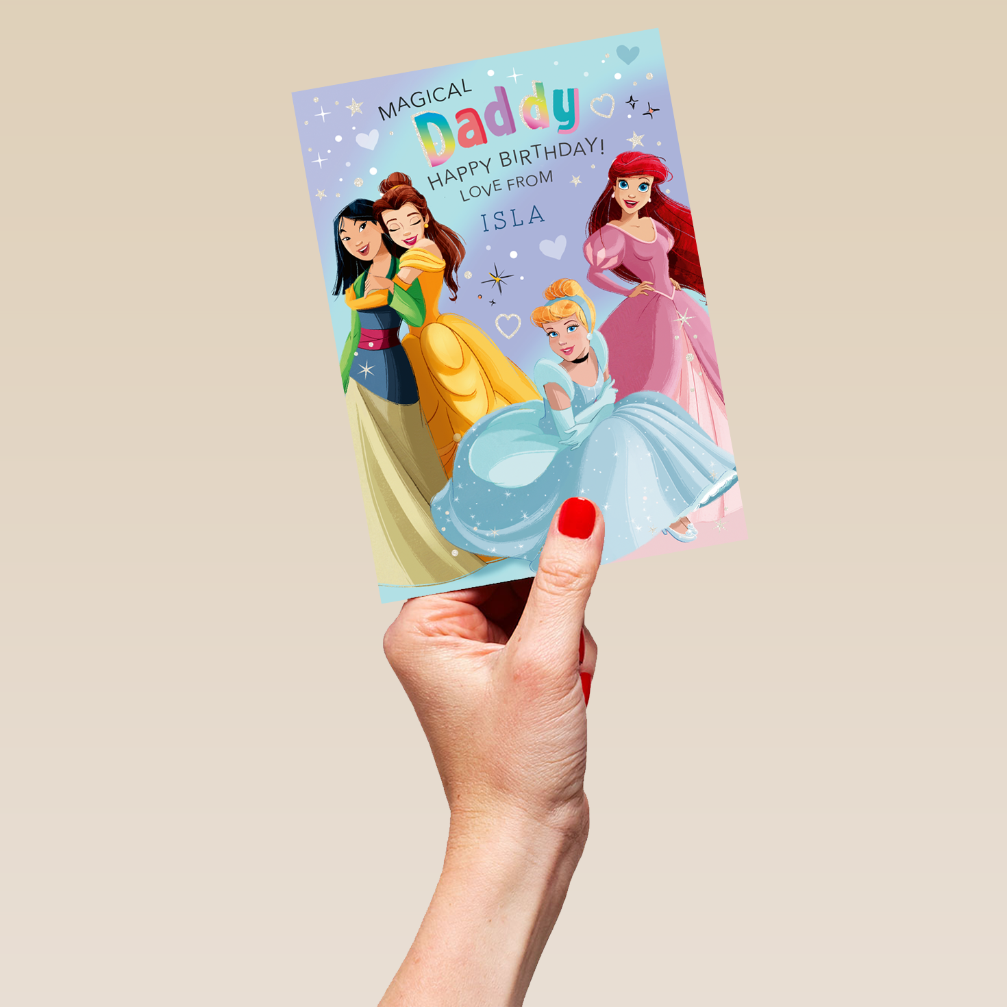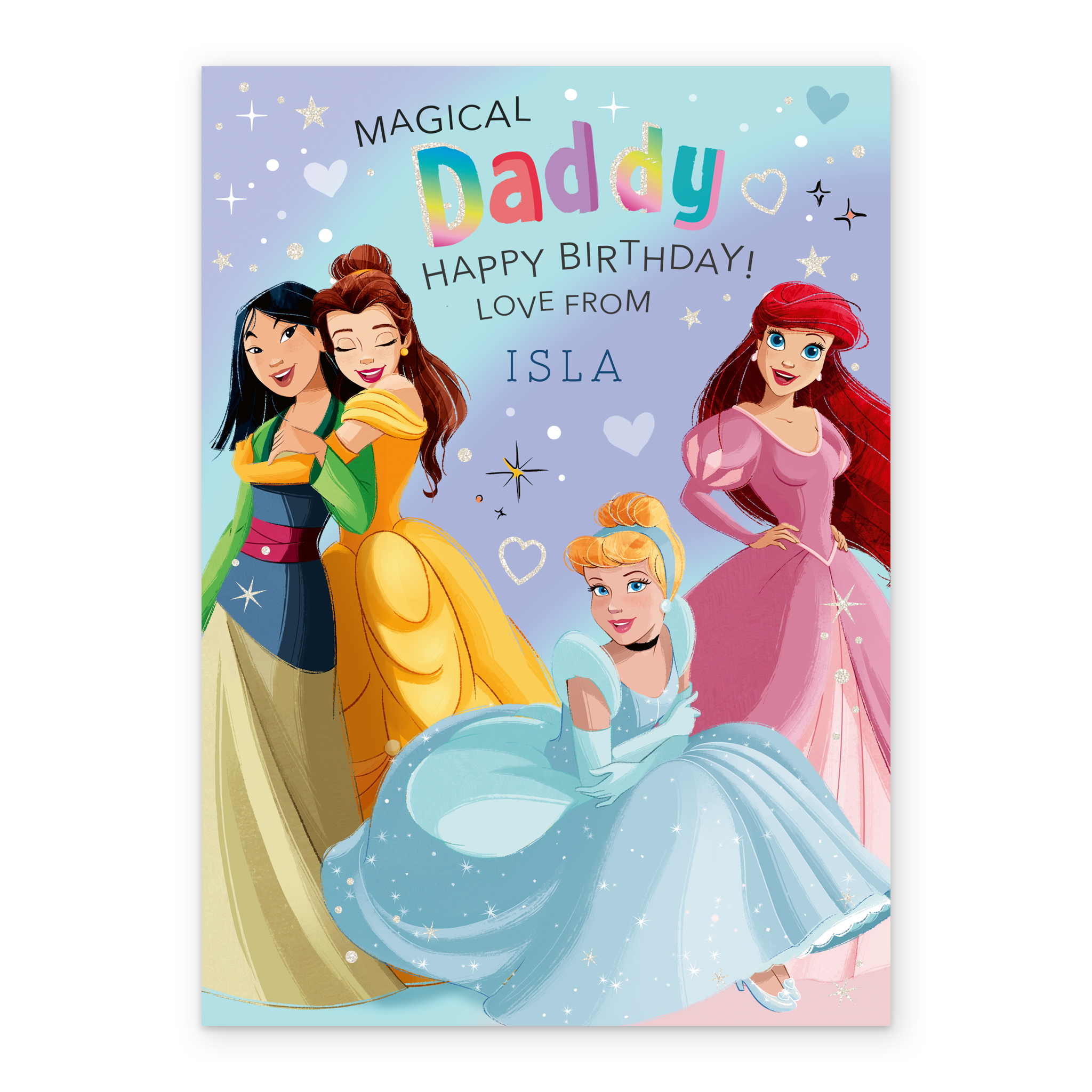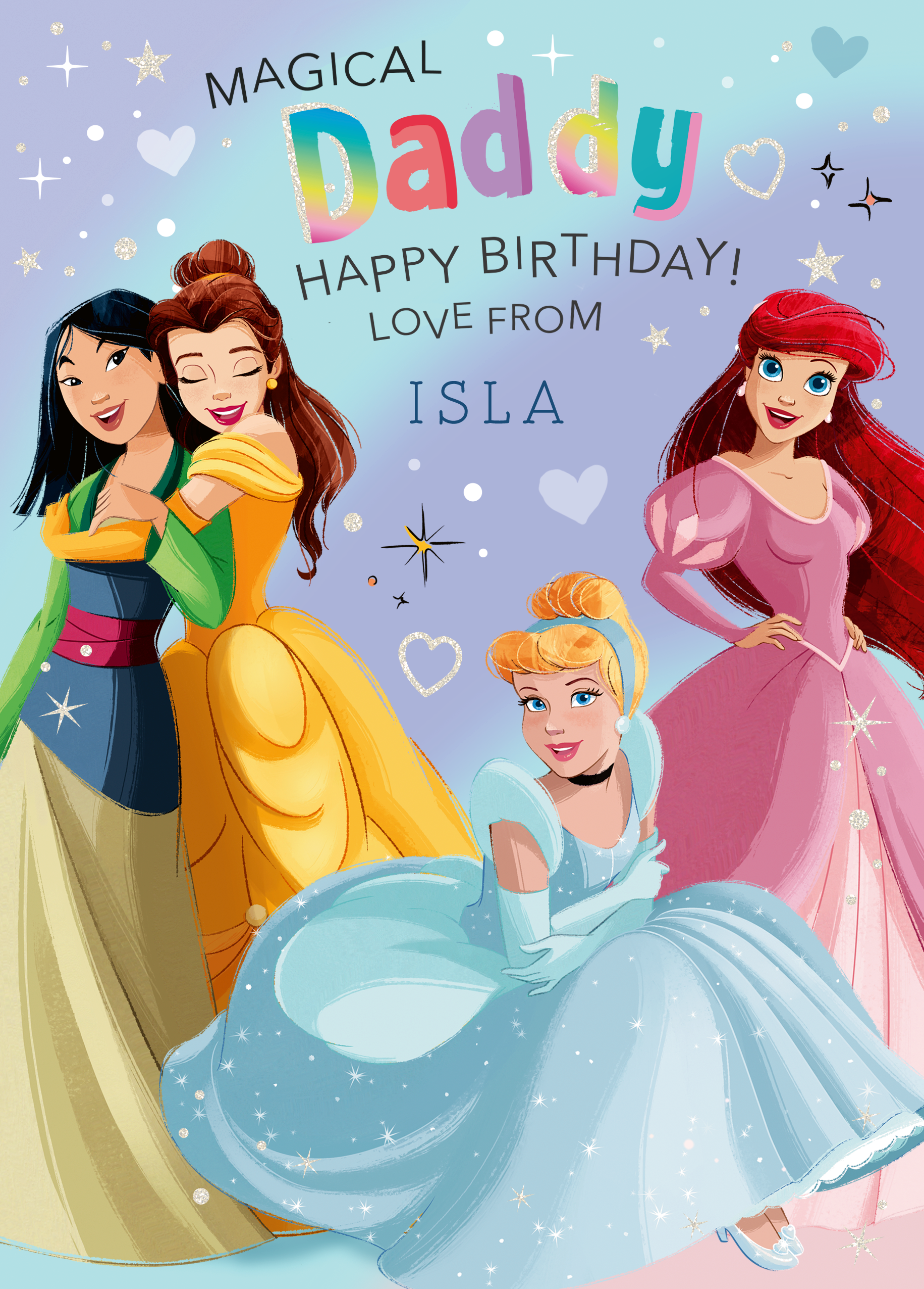 Printed on premium-quality board, this card features Disney princesses Mulan, Belle, Aurora and Ariel, on a cute blue background adorned with hearts and stars, with the message 'Magical Daddy Happy Birthday!', space to personalise a name, and comes complete with a co-ordinating white envelope.