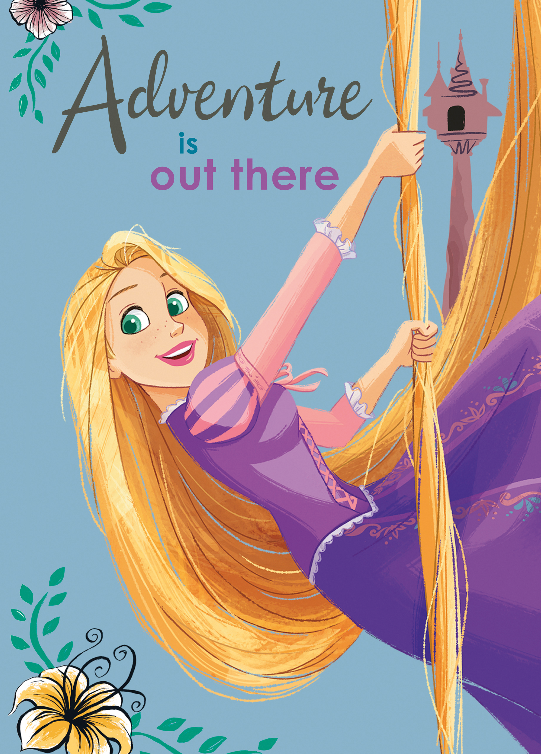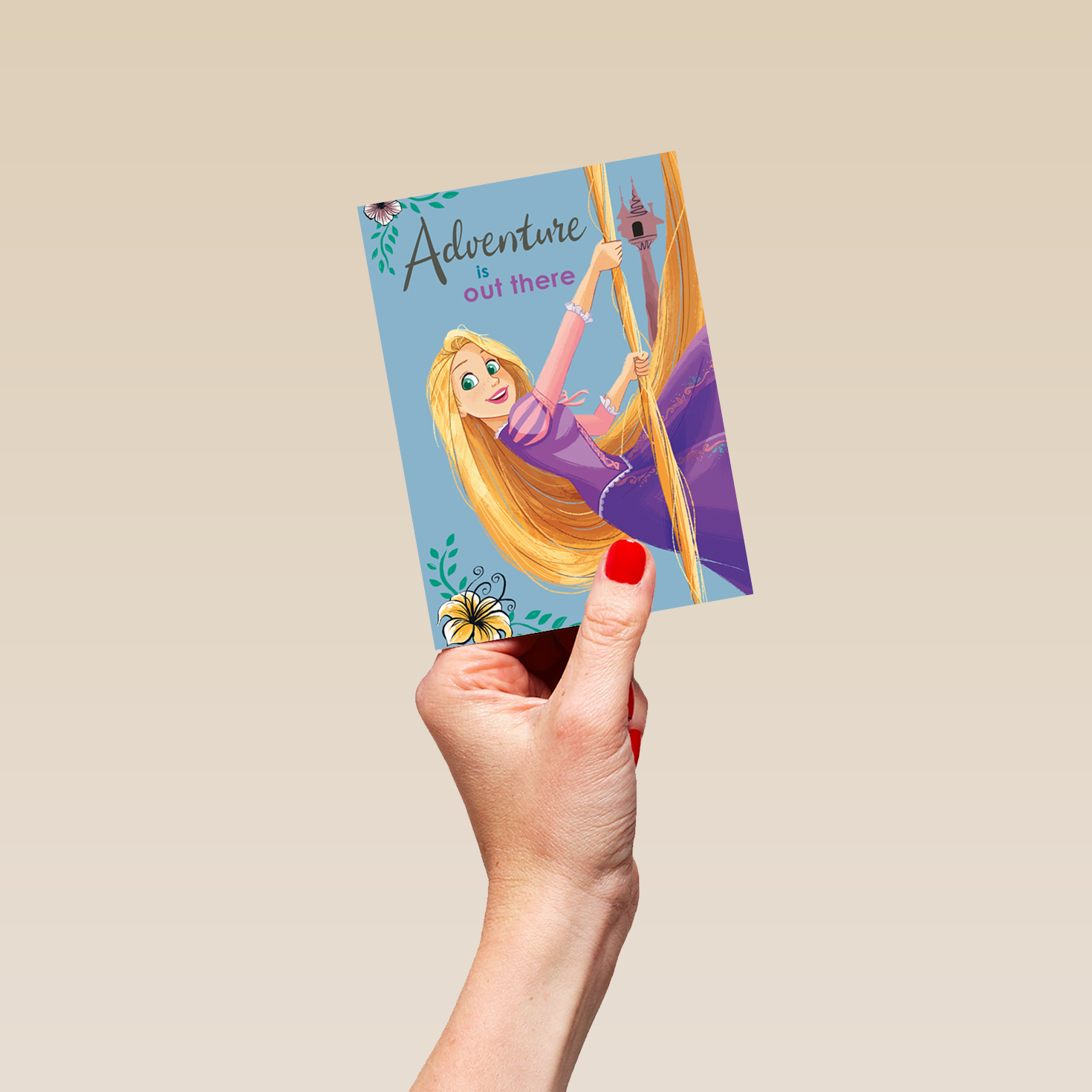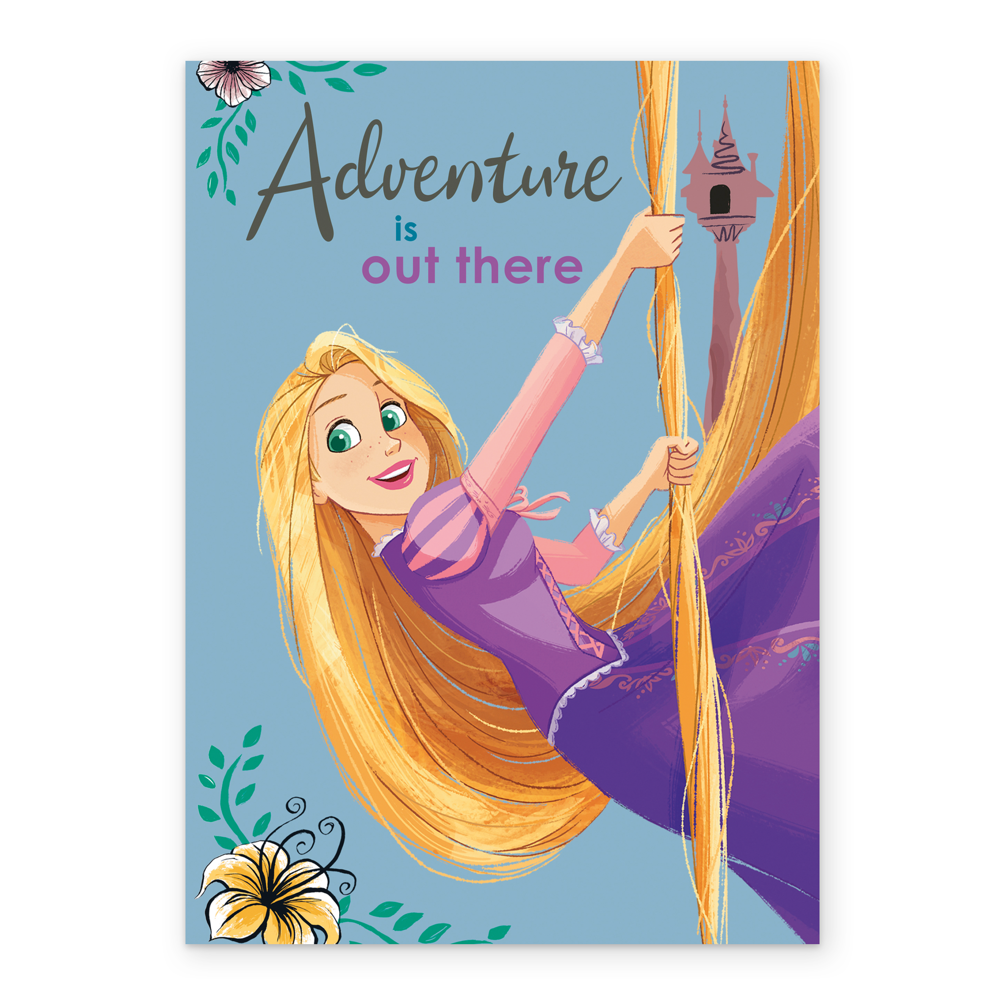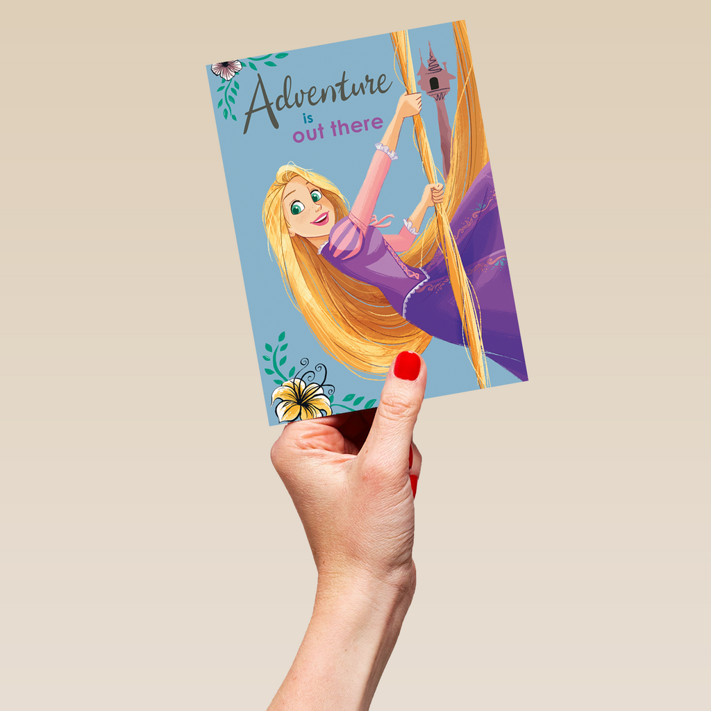 Printed on premium-quality board, this card features an adventurous Rapunzel climbing down her hair, on a light blue background with floral embellishments, with the message 'Adventure is out there', and comes complete with a co-ordinating white envelope.