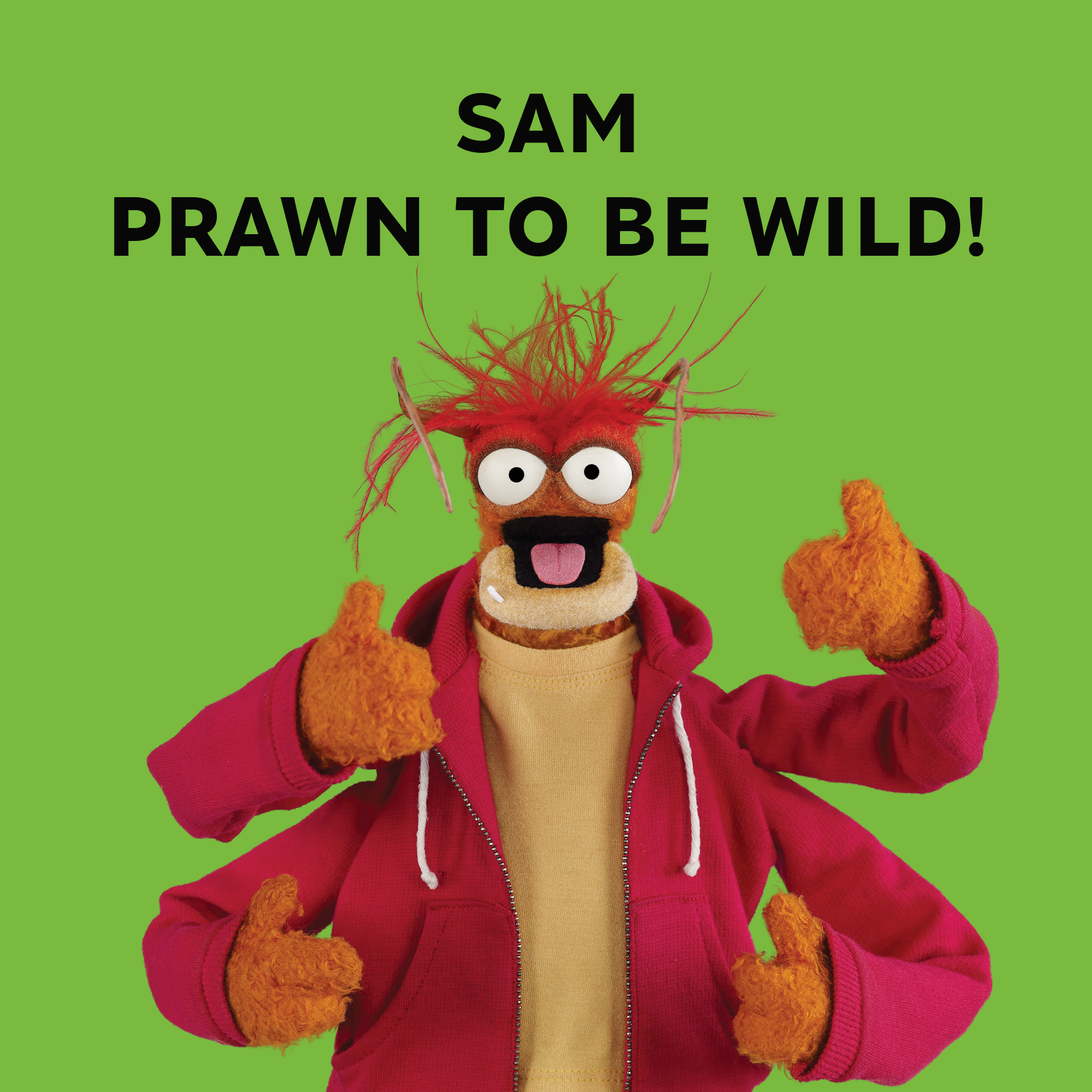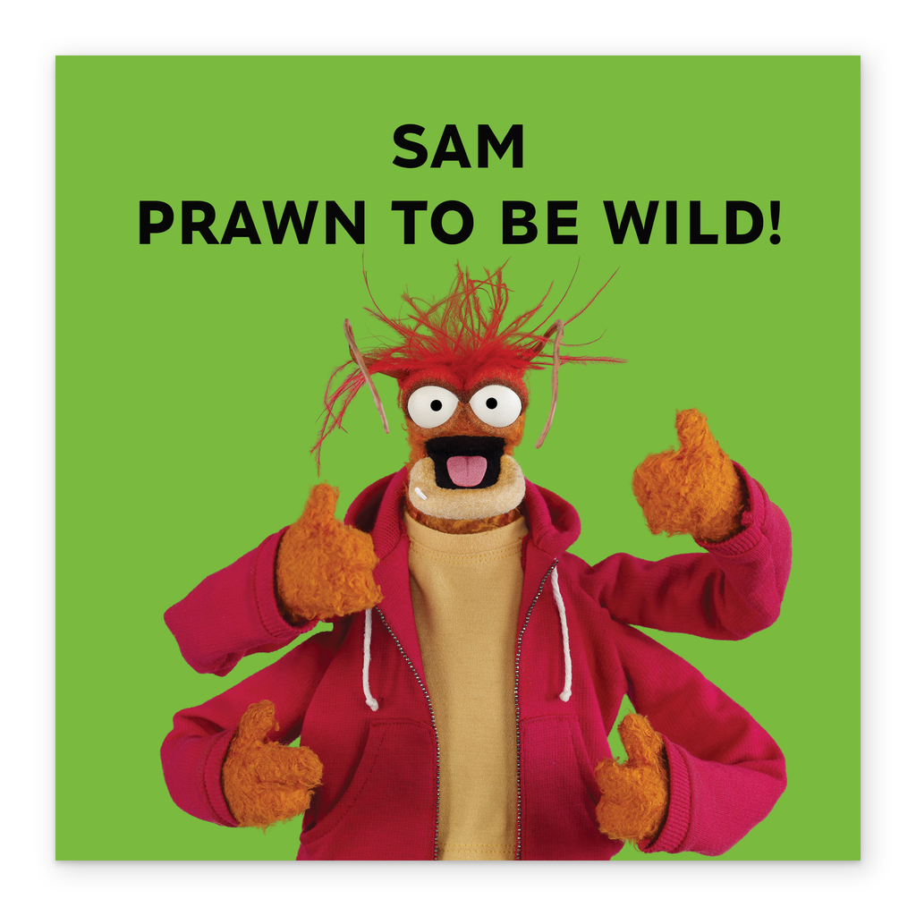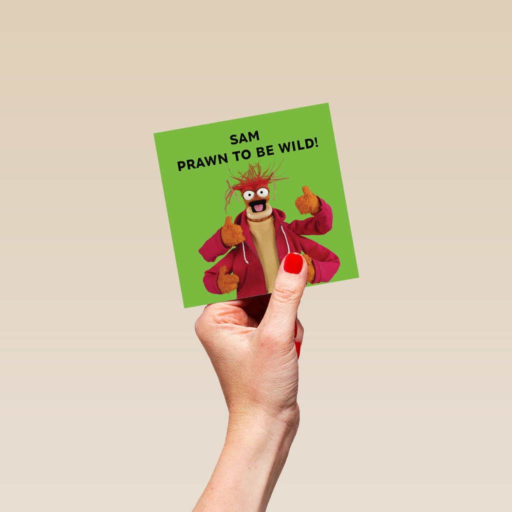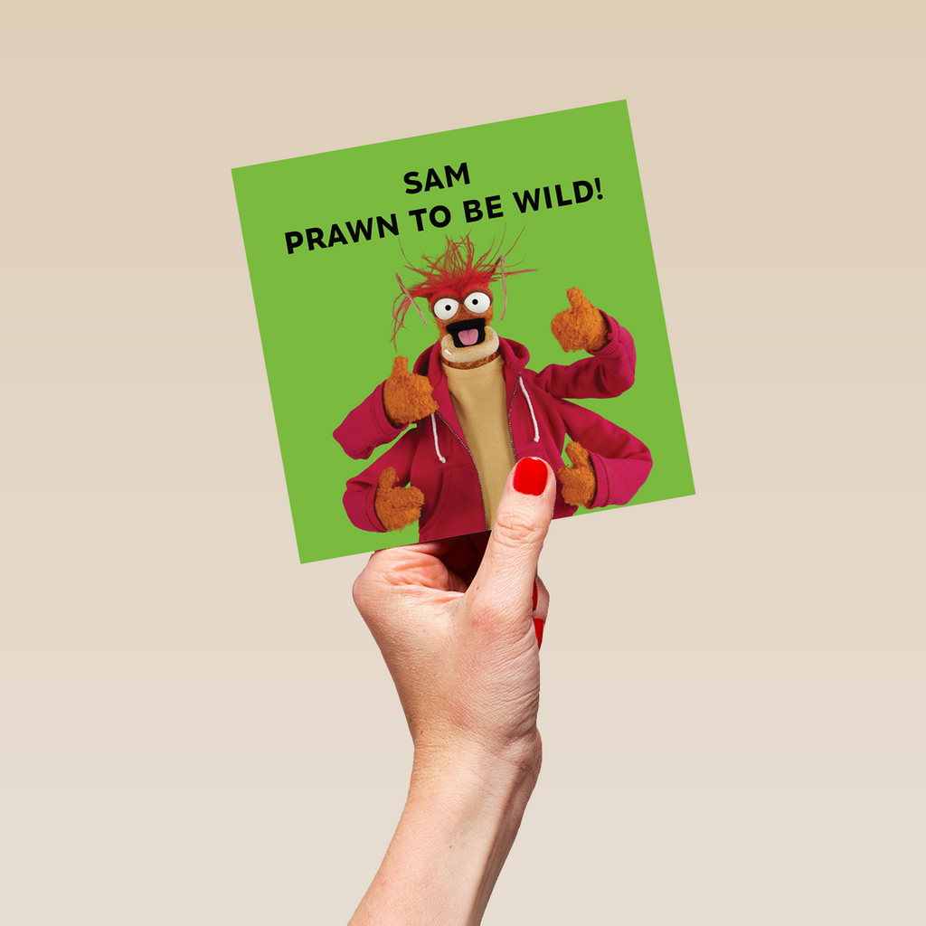 Printed on premium-quality board, this card features Pepe The King Prawn from The Muppets, with the message '[NAME] Prawn To Be Wild!', space to personalise a name, and comes complete with a co-ordinating white envelope.