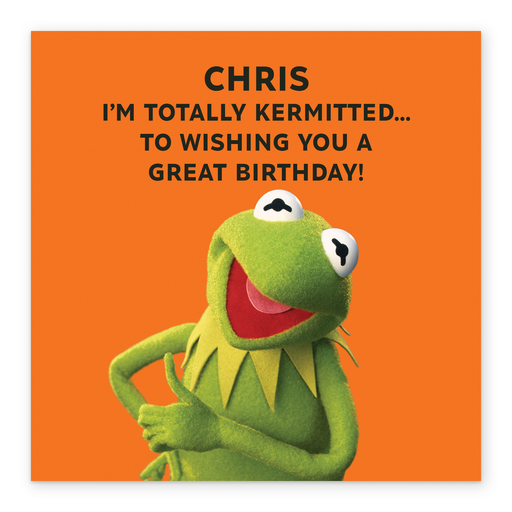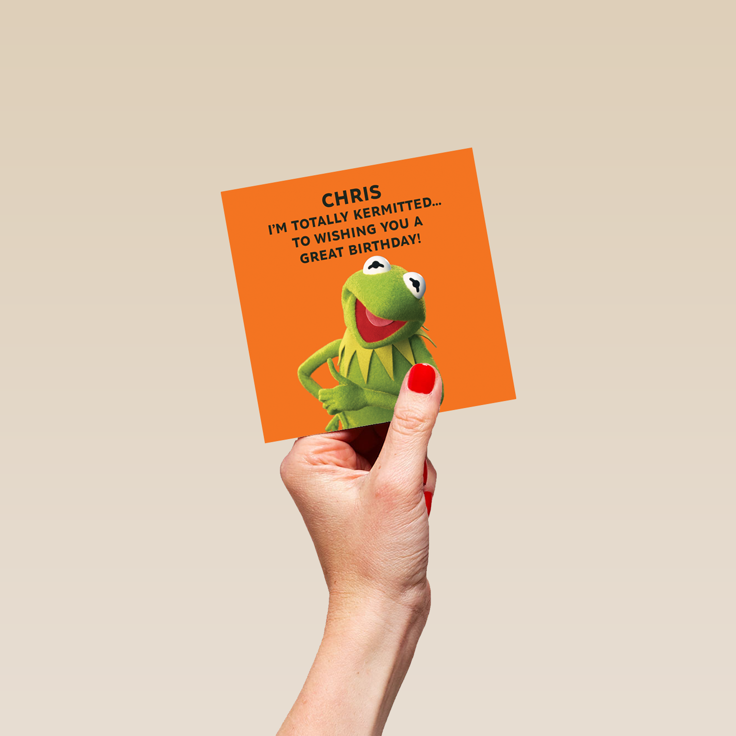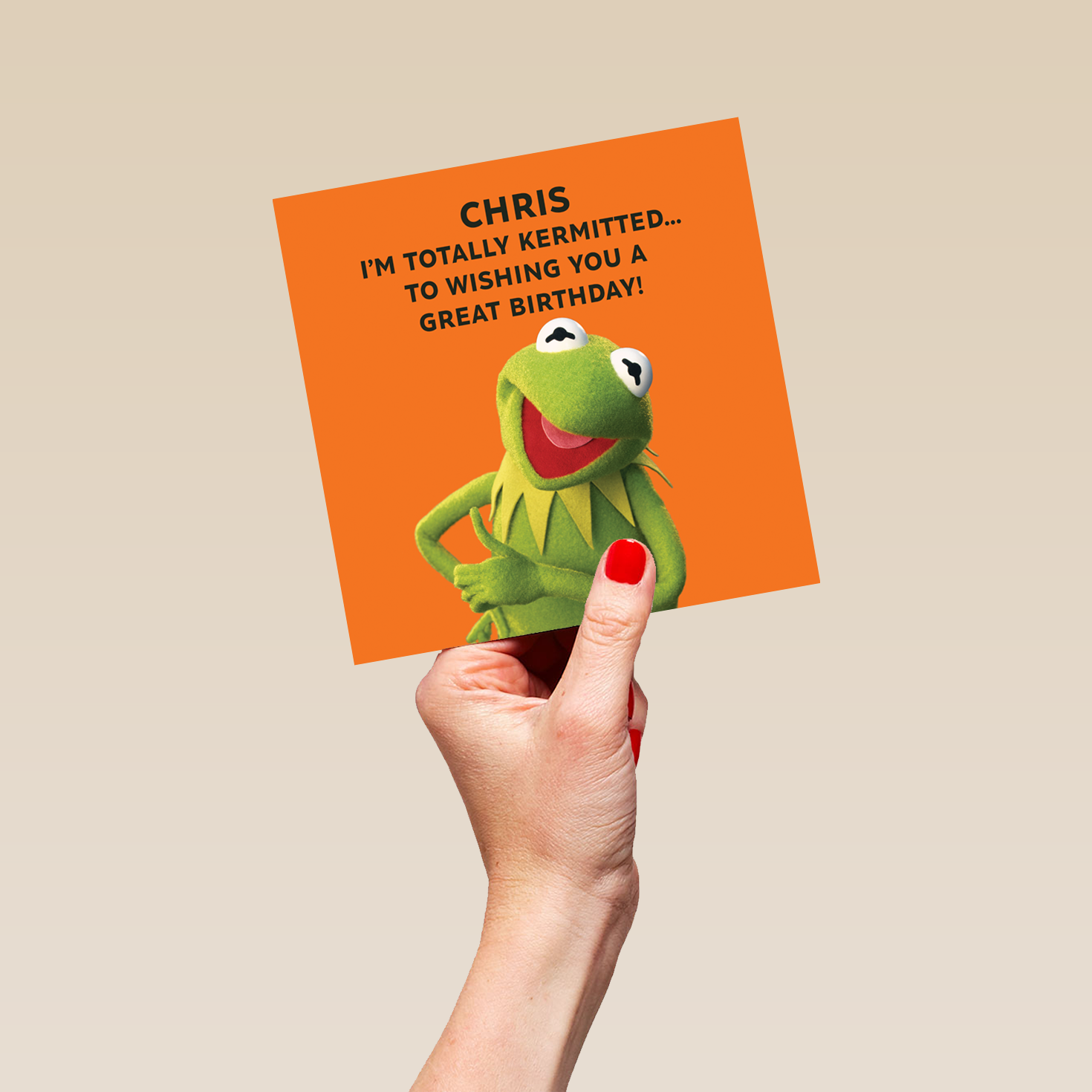 Printed on premium-quality board, this card features Kermit the Frog from The Muppets, with the message '[NAME] I'm Totally Kermitted… To Wishing You A Great Birthday!', space to personalise a name, and comes complete with a co-ordinating white envelope.
