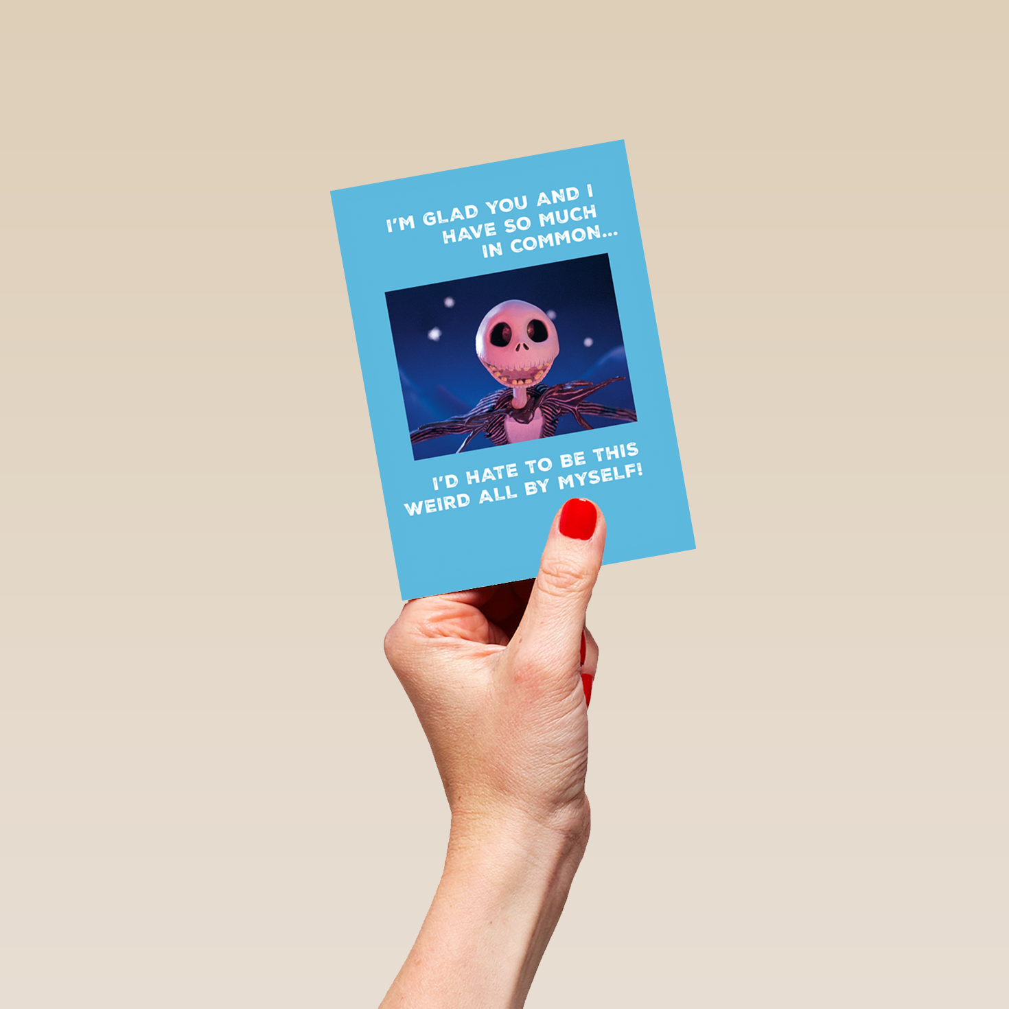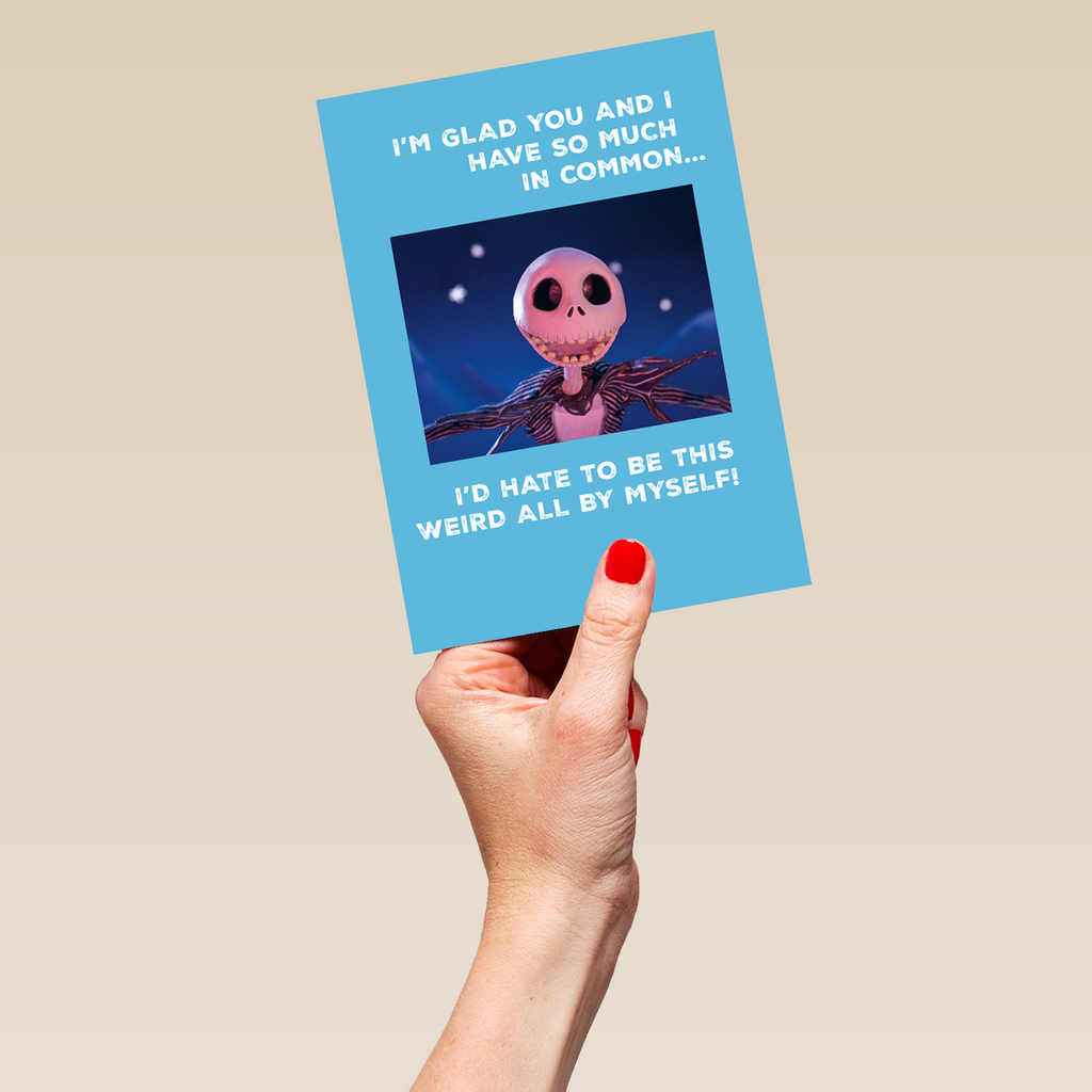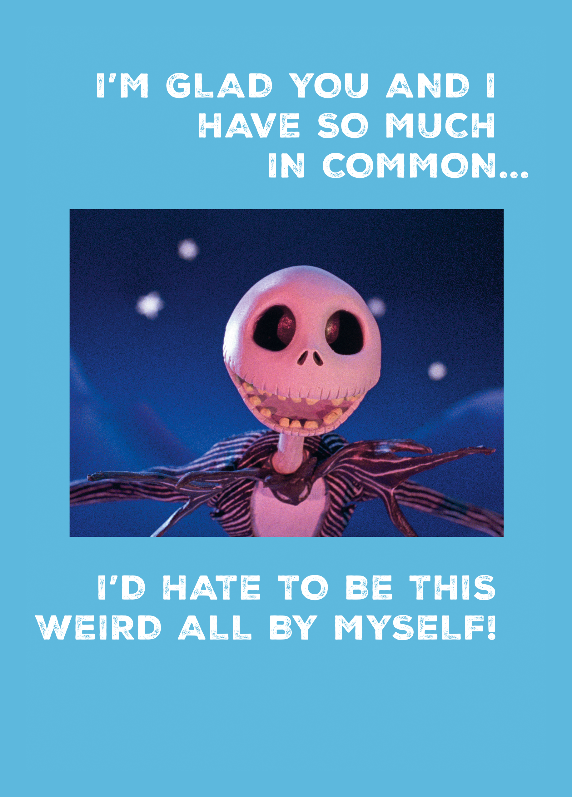 Printed on premium-quality board, this card features Jack Skellington from Tim Burton's The Nightmare Before Christmas, with the message 'I'm Glad You And I Have So Much In Common...I'd Hate To Be This Weird All By Myself!', and comes complete with a co-ordinating white envelope.