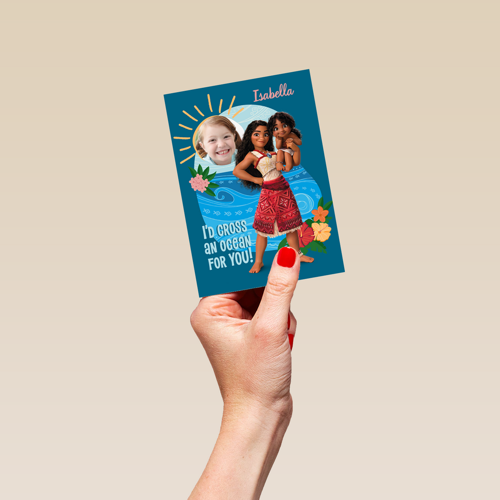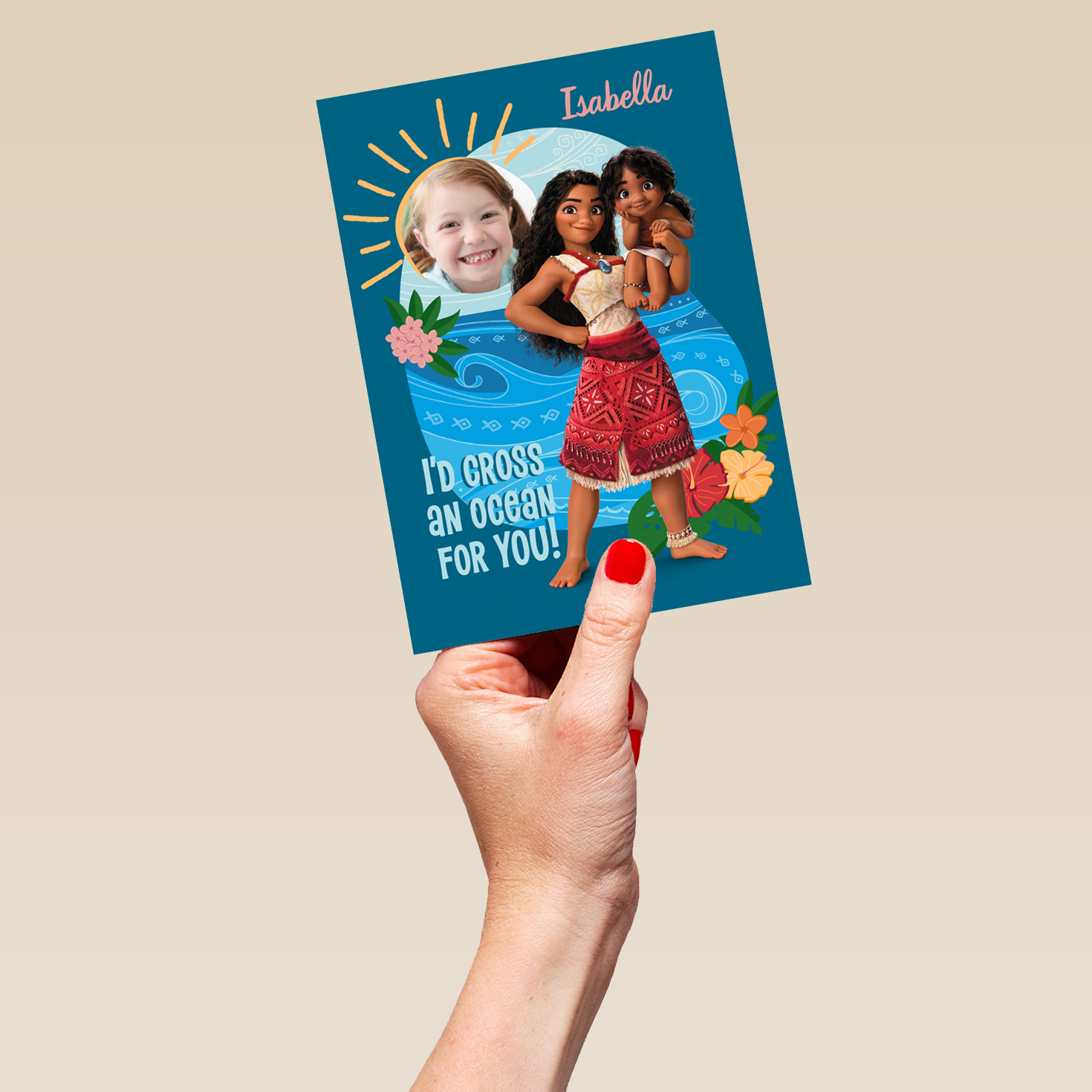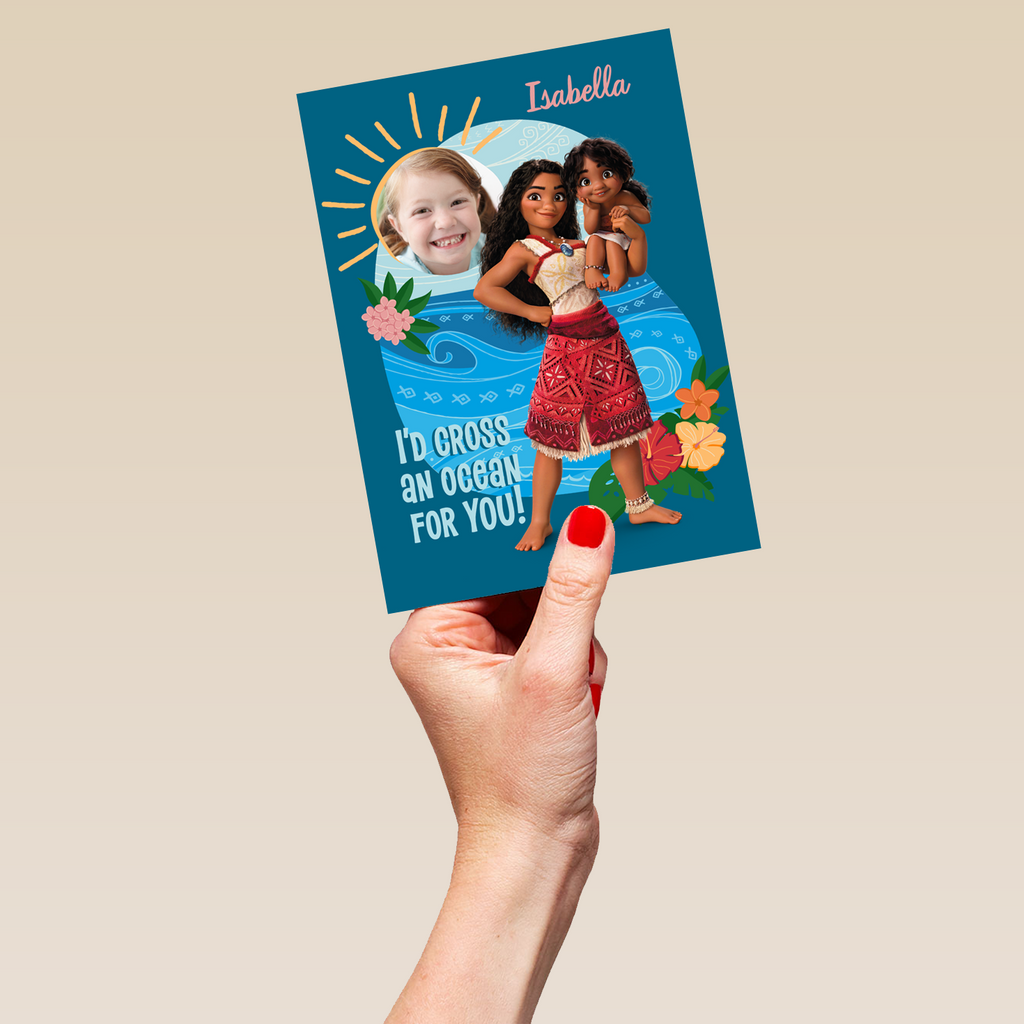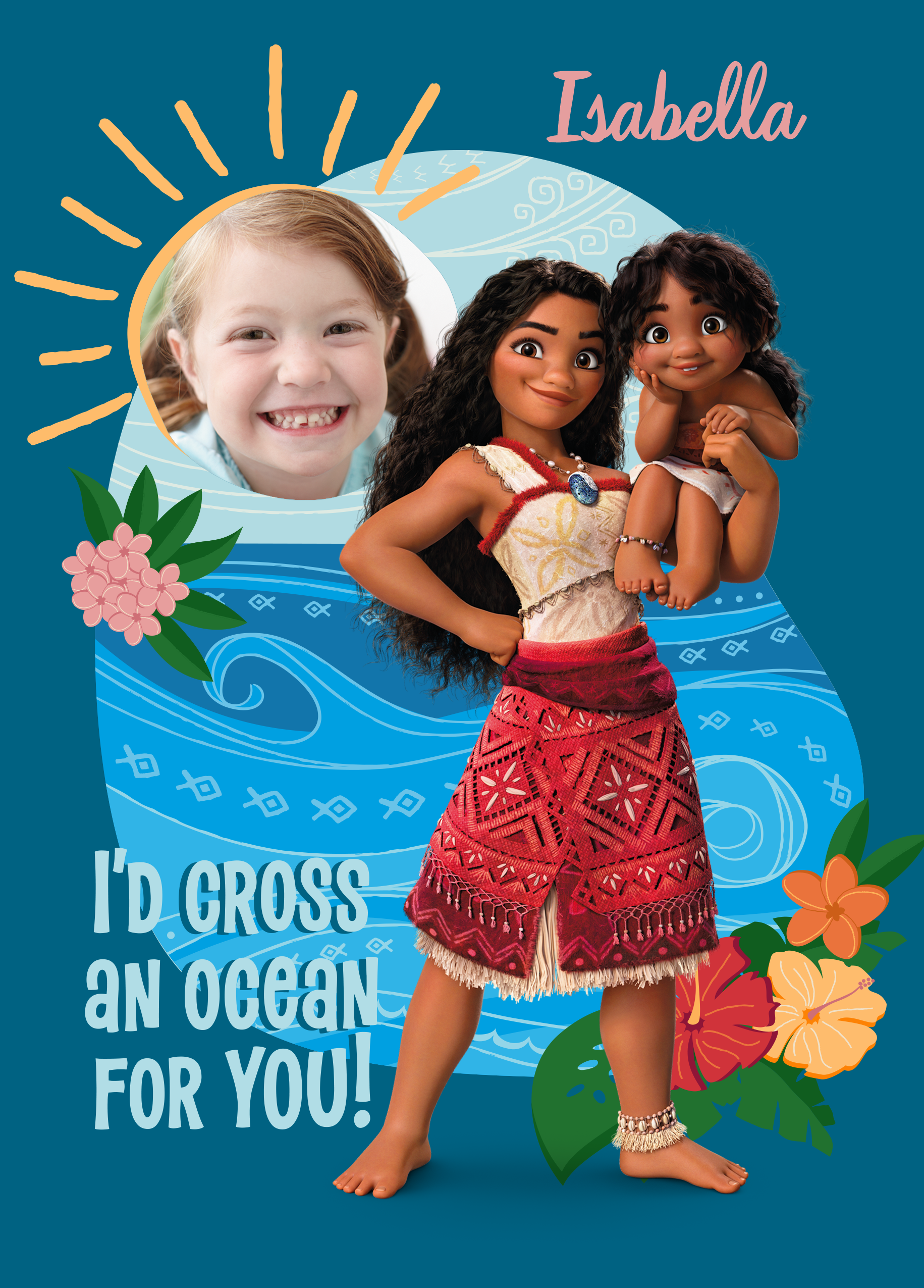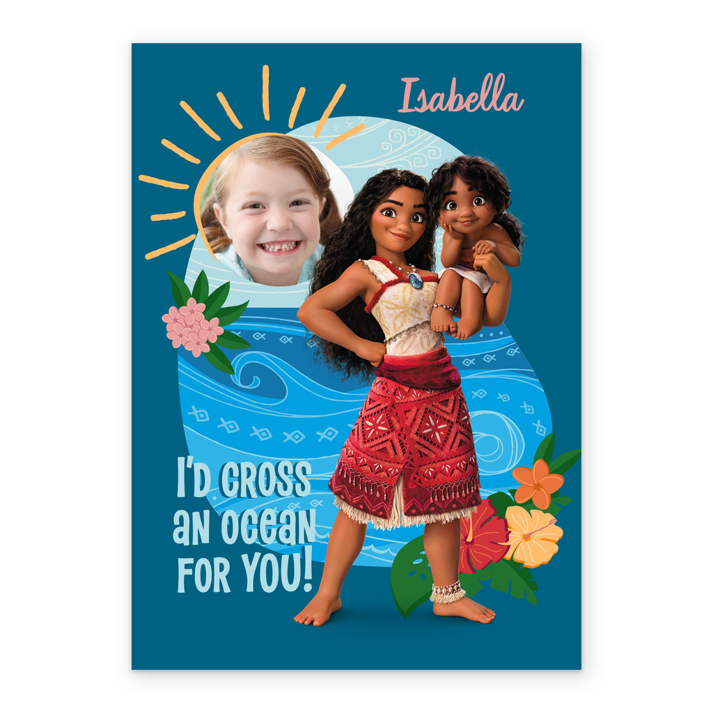 Printed on premium-quality board, this card features Moana and Simea, with the message 'I'd cross an ocean for you!', space to upload a photo and personalise a name, and comes complete with a co-ordinating white envelope.