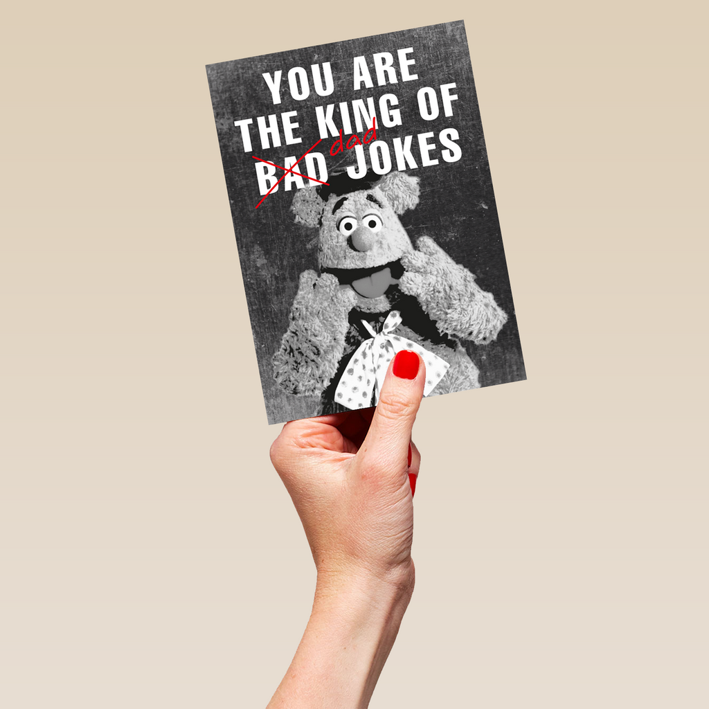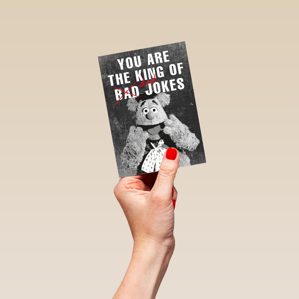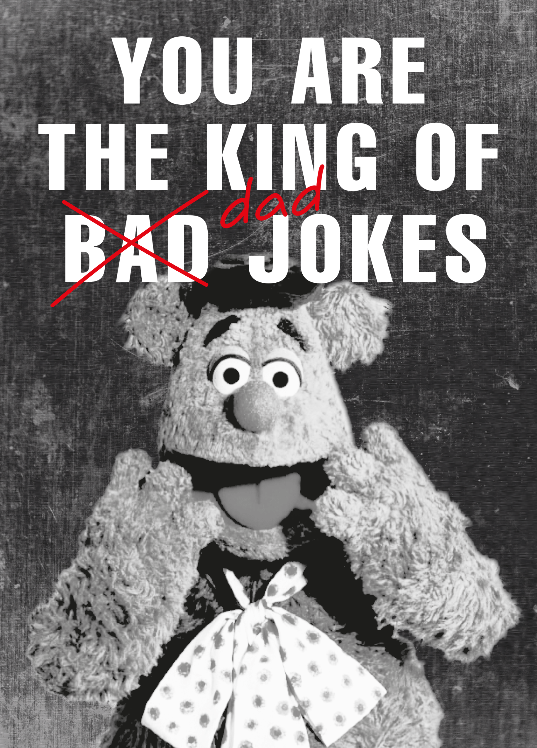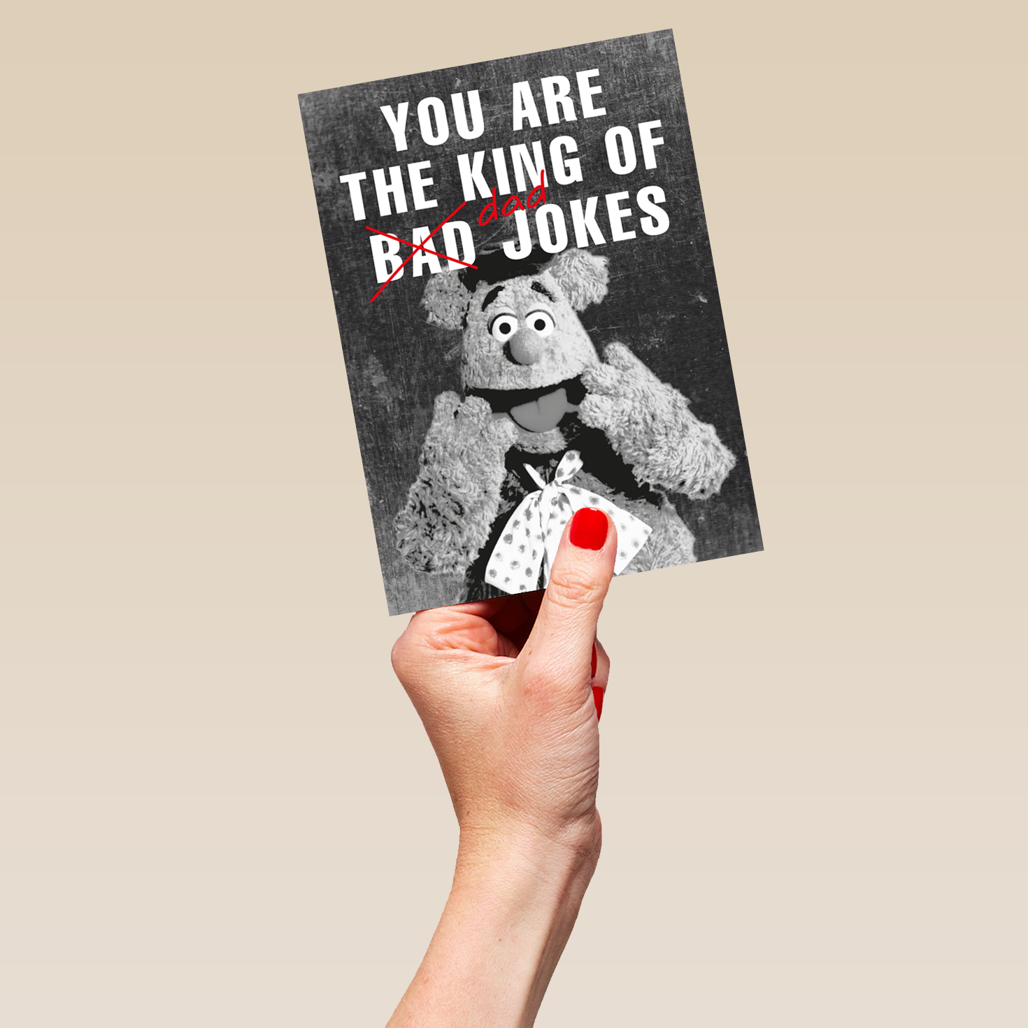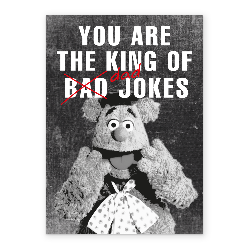 Printed on premium-quality board, this card features Fozzie Bear from The Muppets with a grey scale background, with the message 'You Are The King Of Bad Dad Jokes', and comes complete with a co-ordinating white envelope.