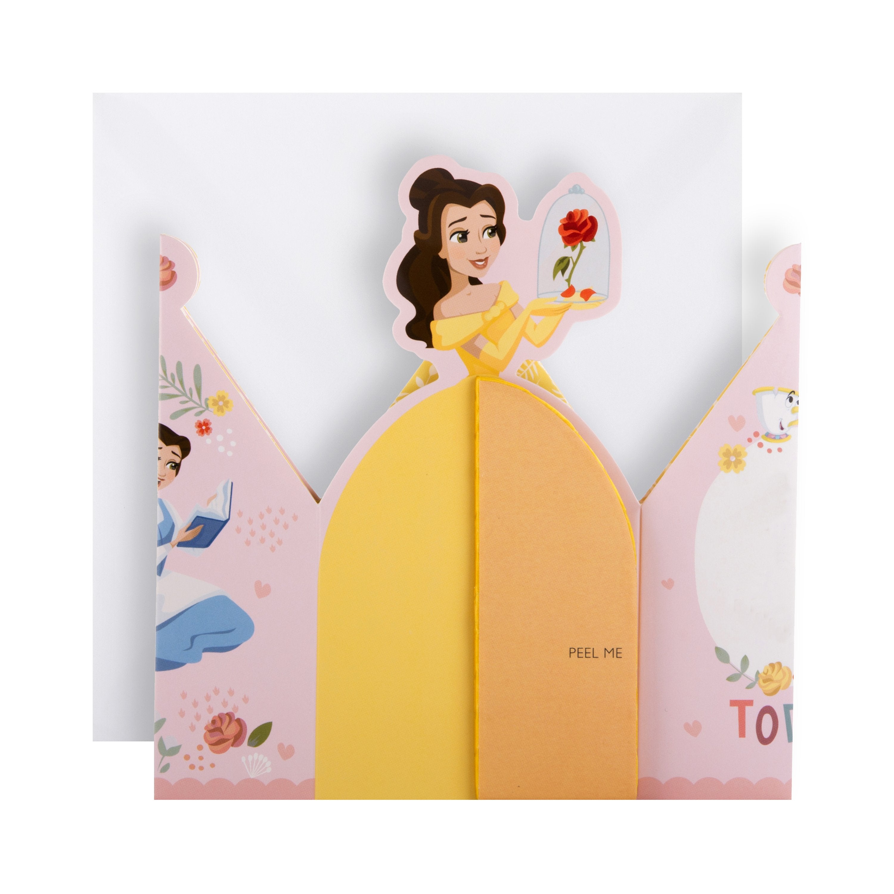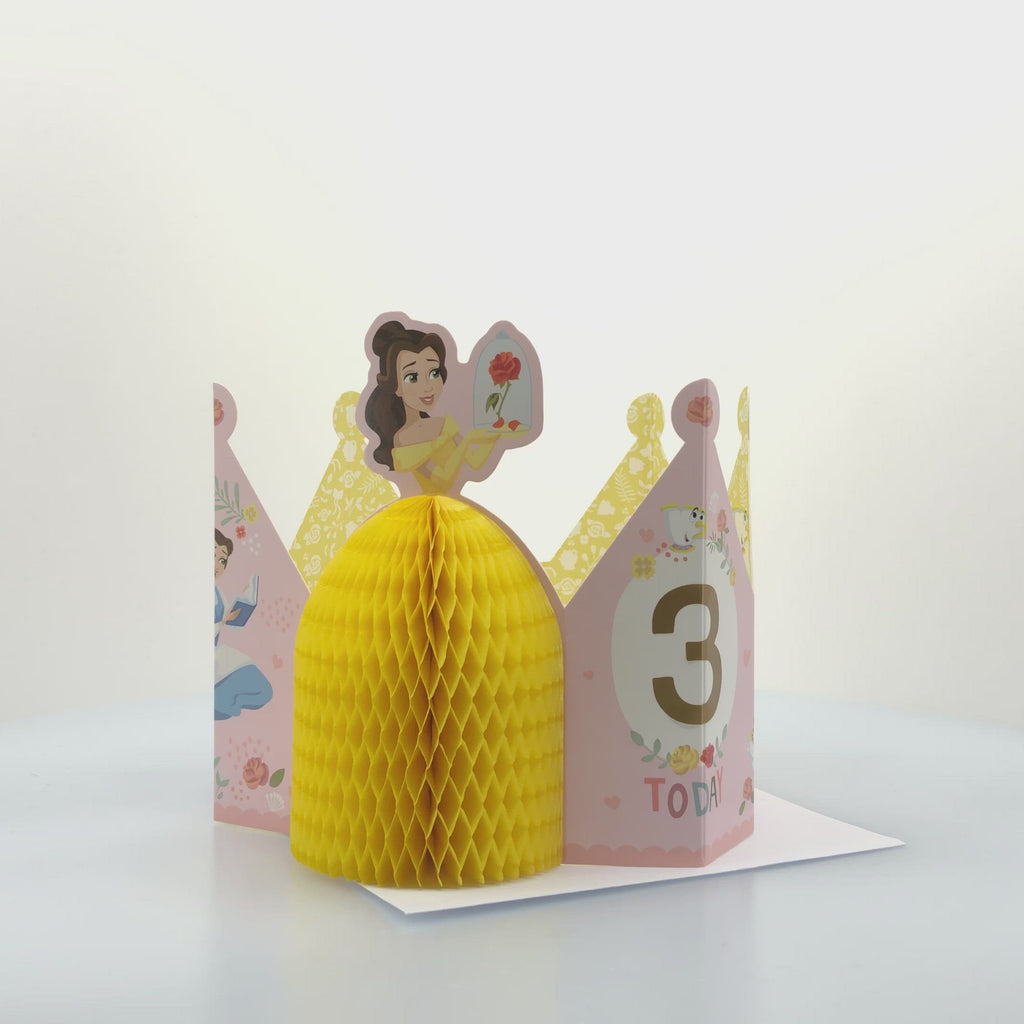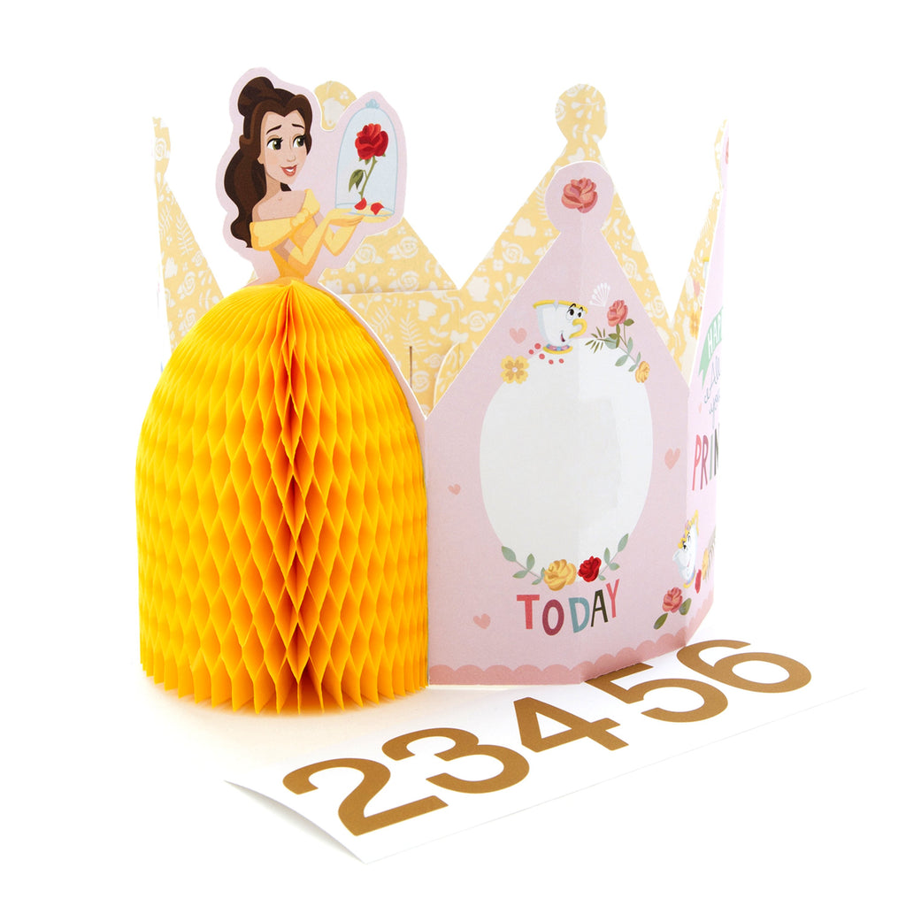 Printed on high-quality board, this card features a pop-up 3D design into a wearable crown, with Disney Princess Belle and other Beauty and the Beast characters, with age stickers from 2-6, a fold-out honeycomb element, and comes complete with a co-ordinating branded envelope.