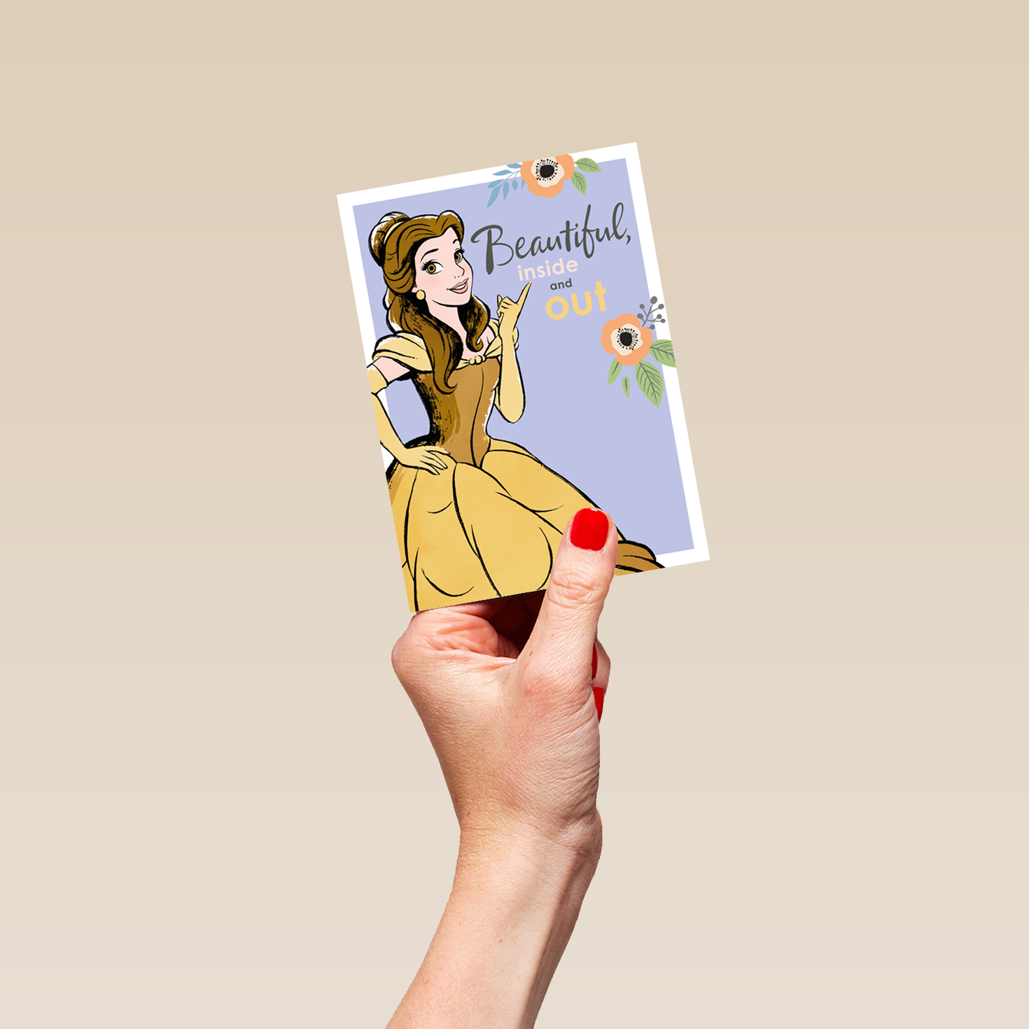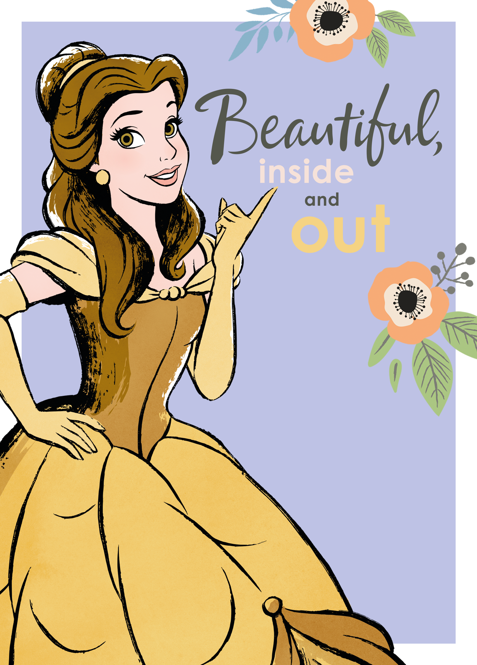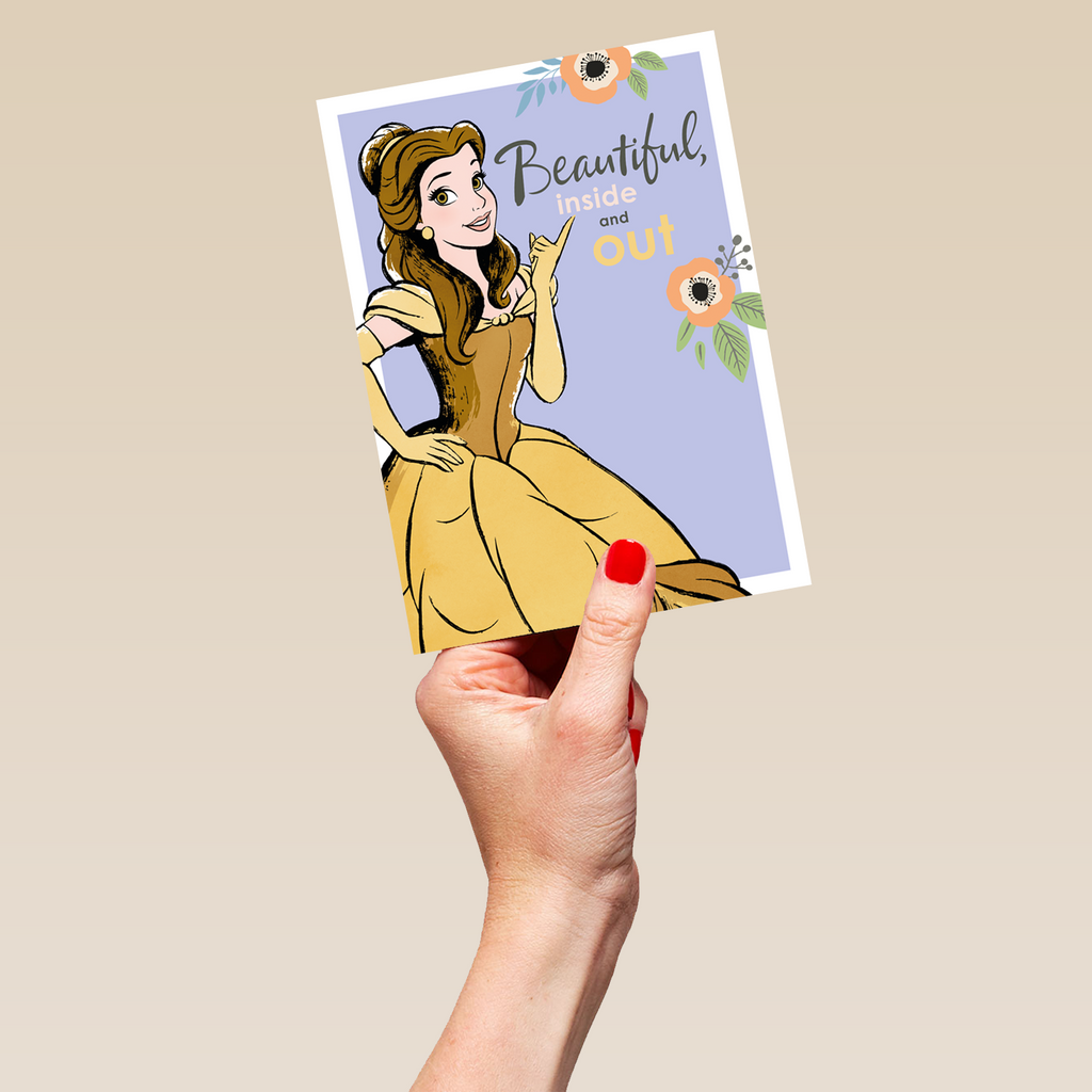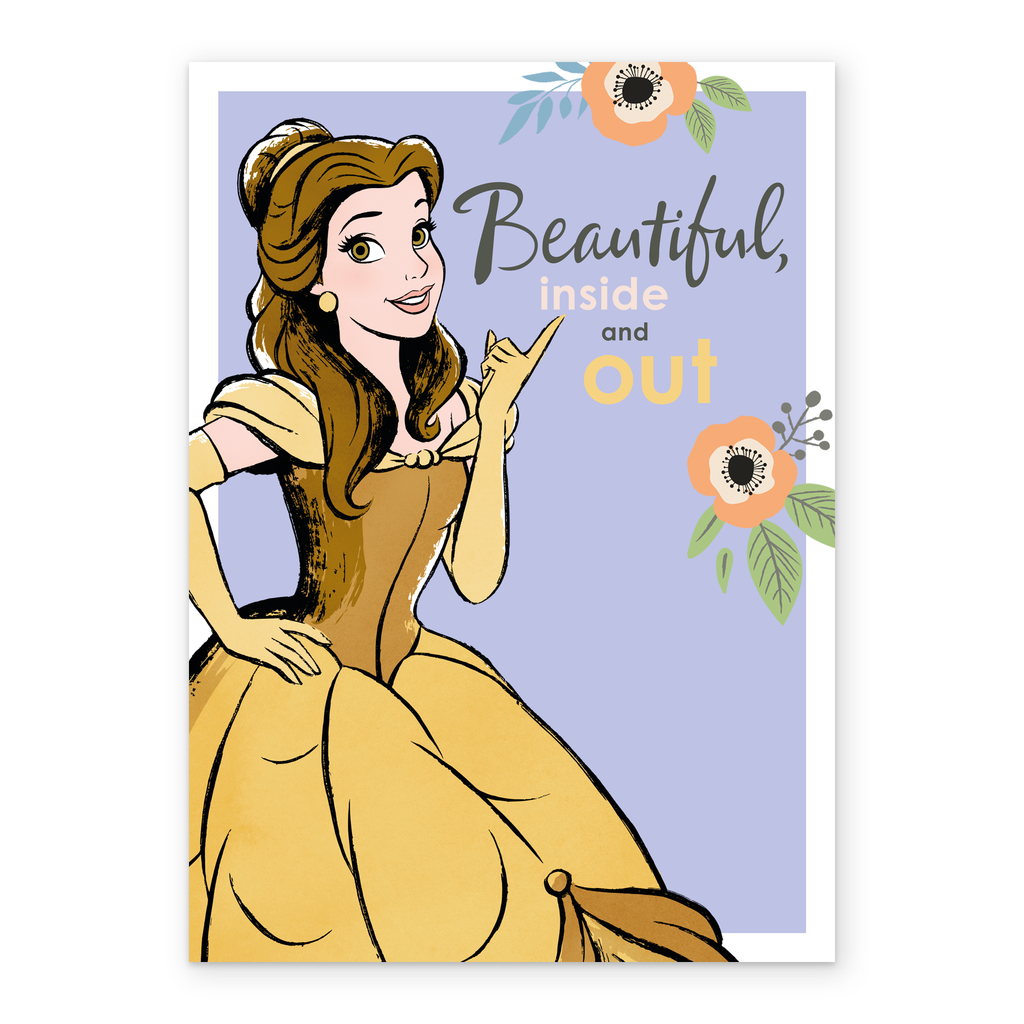 Printed on premium-quality board, this card features Belle, from Disney's Beauty and the Beast, wearing a beautiful yellow gown, on a floral decorated light blue background , with the message 'Beautiful inside and out', and comes complete with a co-ordinating white envelope.