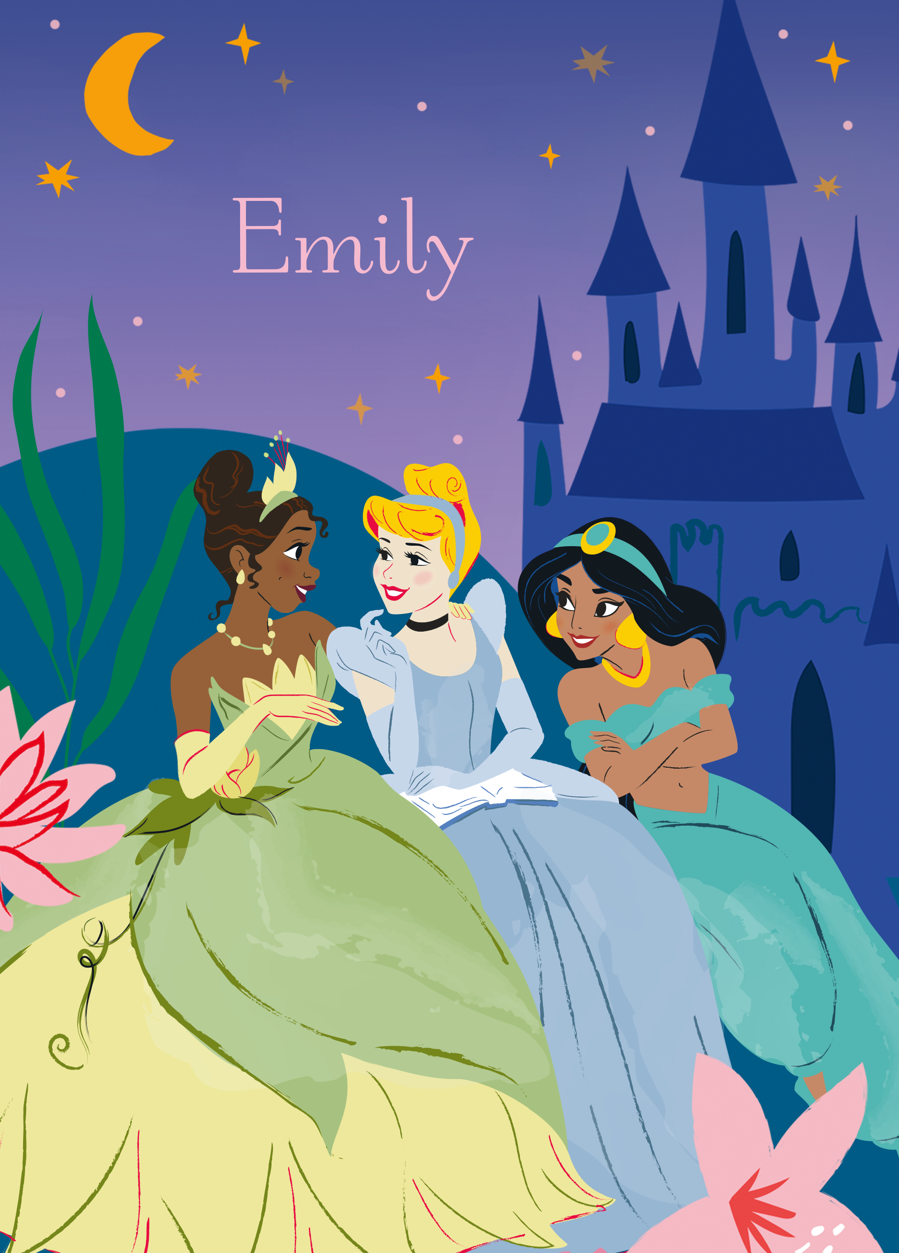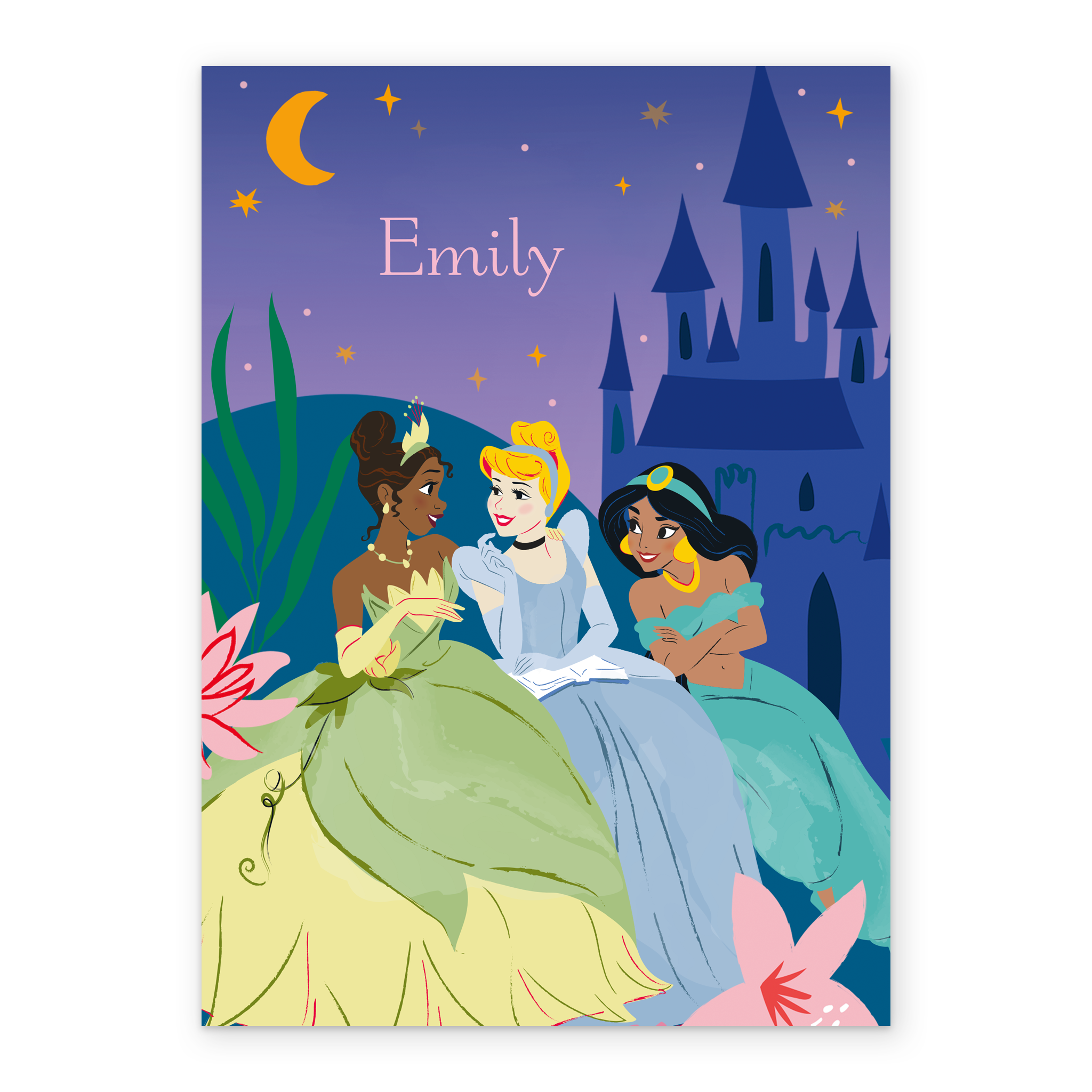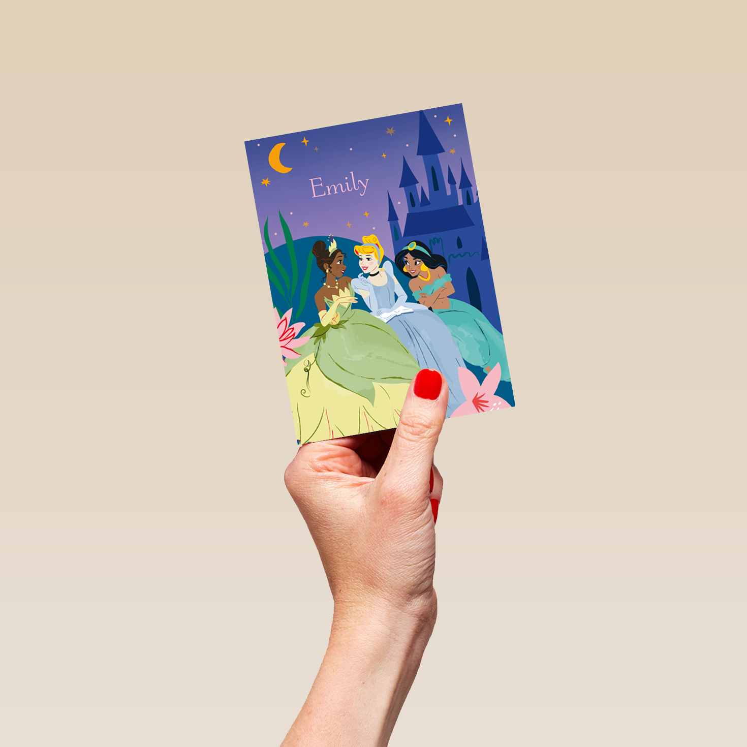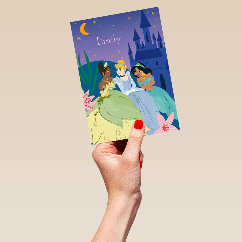 Printed on premium-quality board, this card features Disney Princesses sat in front of the castle, with Tiana from The Princess and the Frog, Cinderella and Jasmine from Aladdin, space to personalise a name, and comes complete with a co-ordinating white envelope.