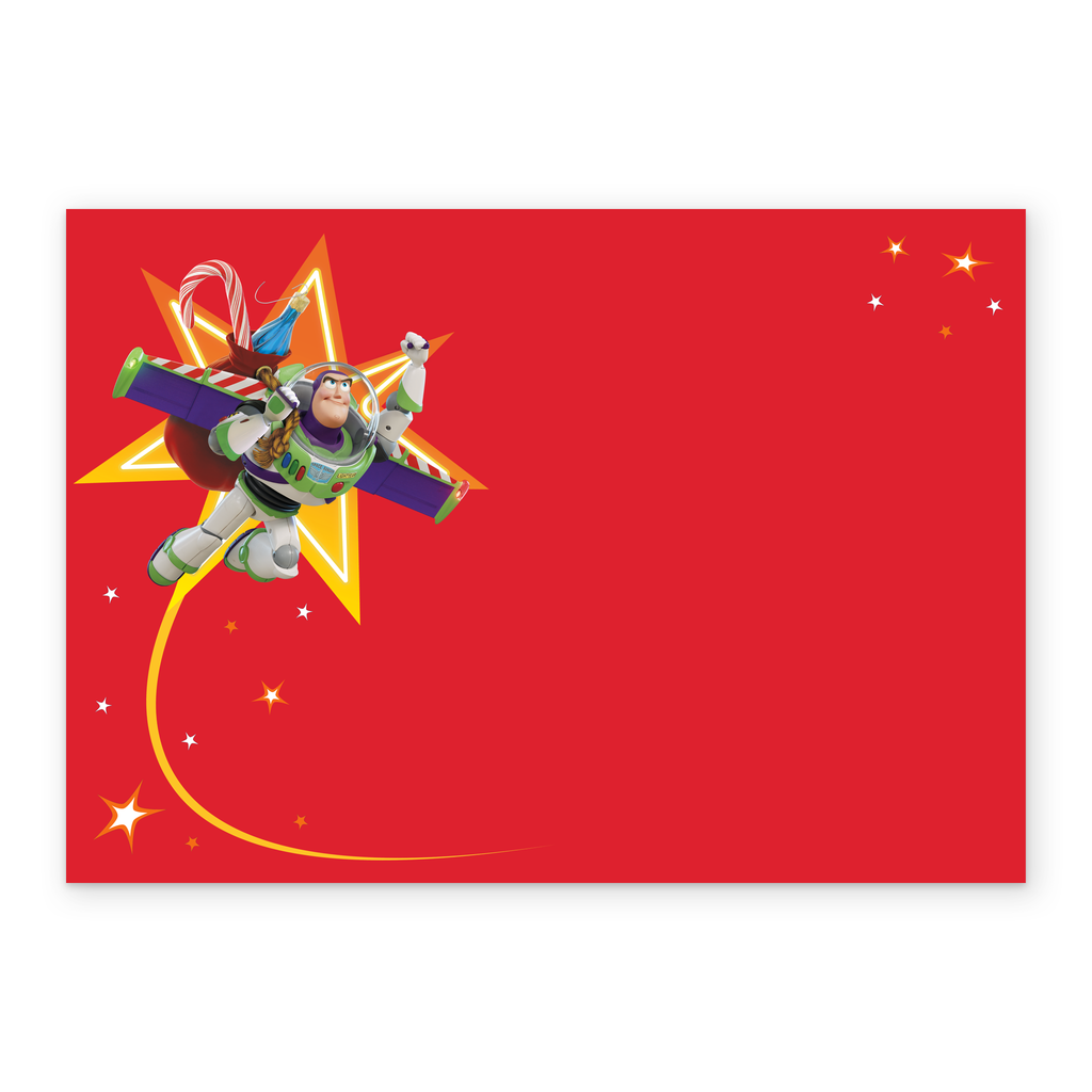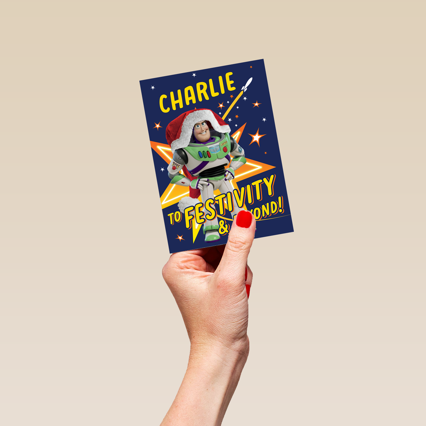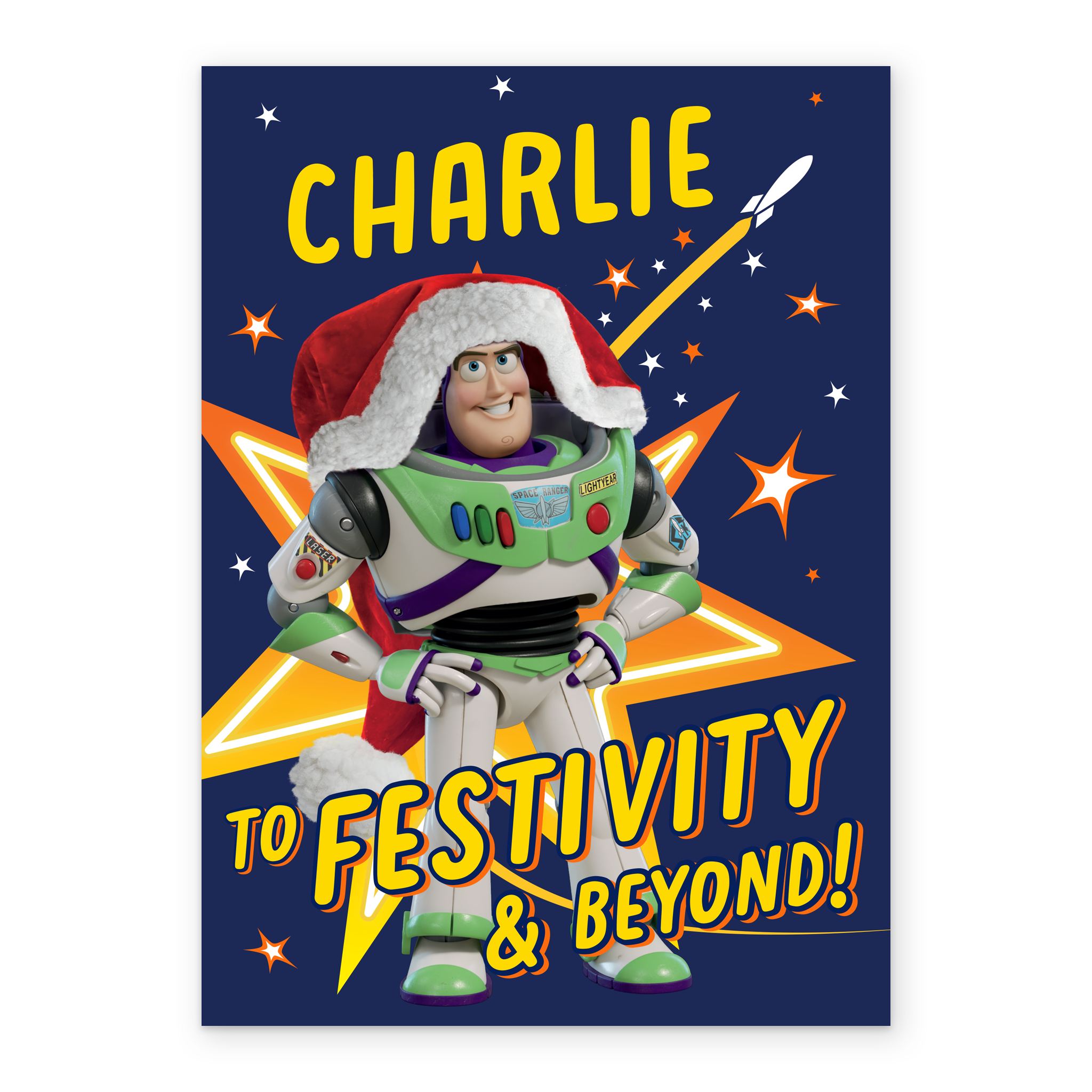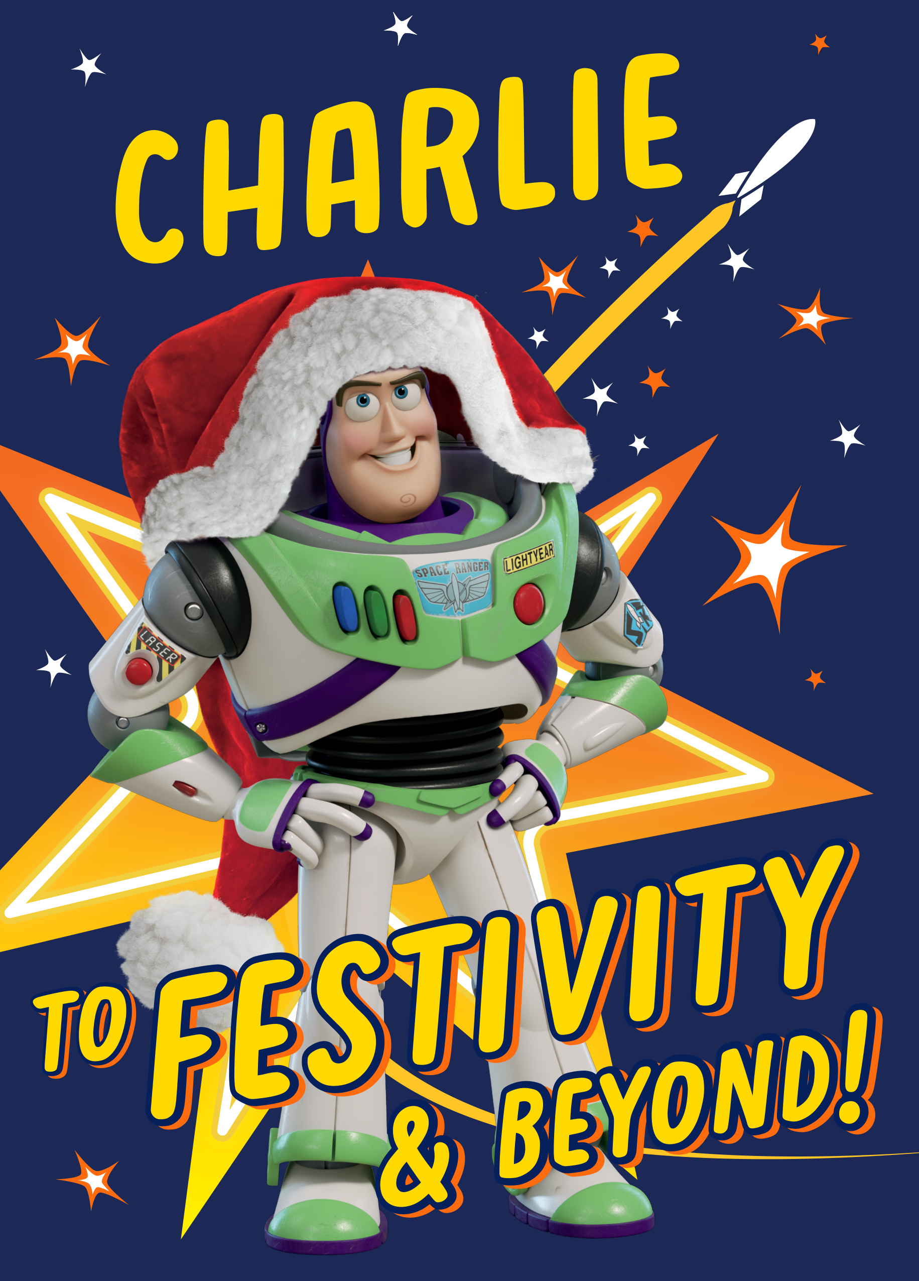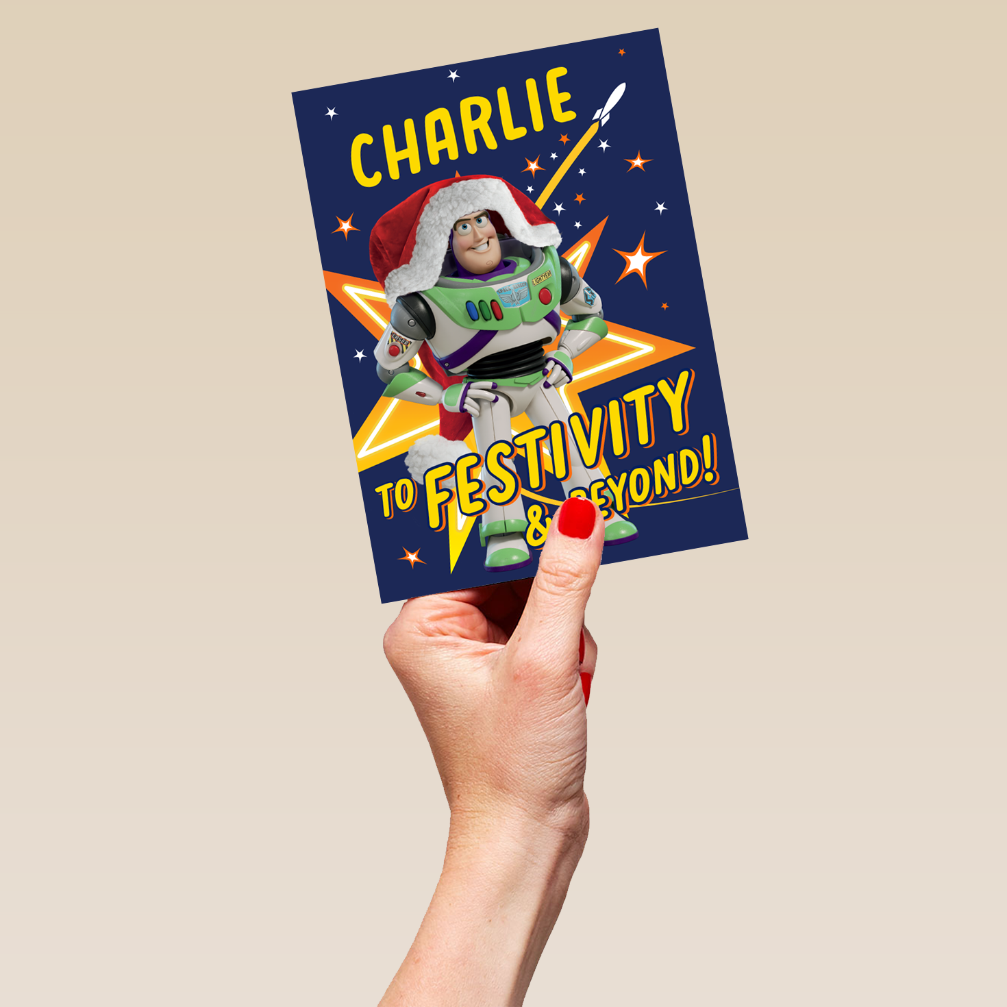 Printed on premium-quality board, this card features Buzz Lightyear wearing a Santa hat with a fun space-themed background, with the message 'To Festivity & Beyond!', space to personalise a name, and comes complete with a co-ordinating white envelope.