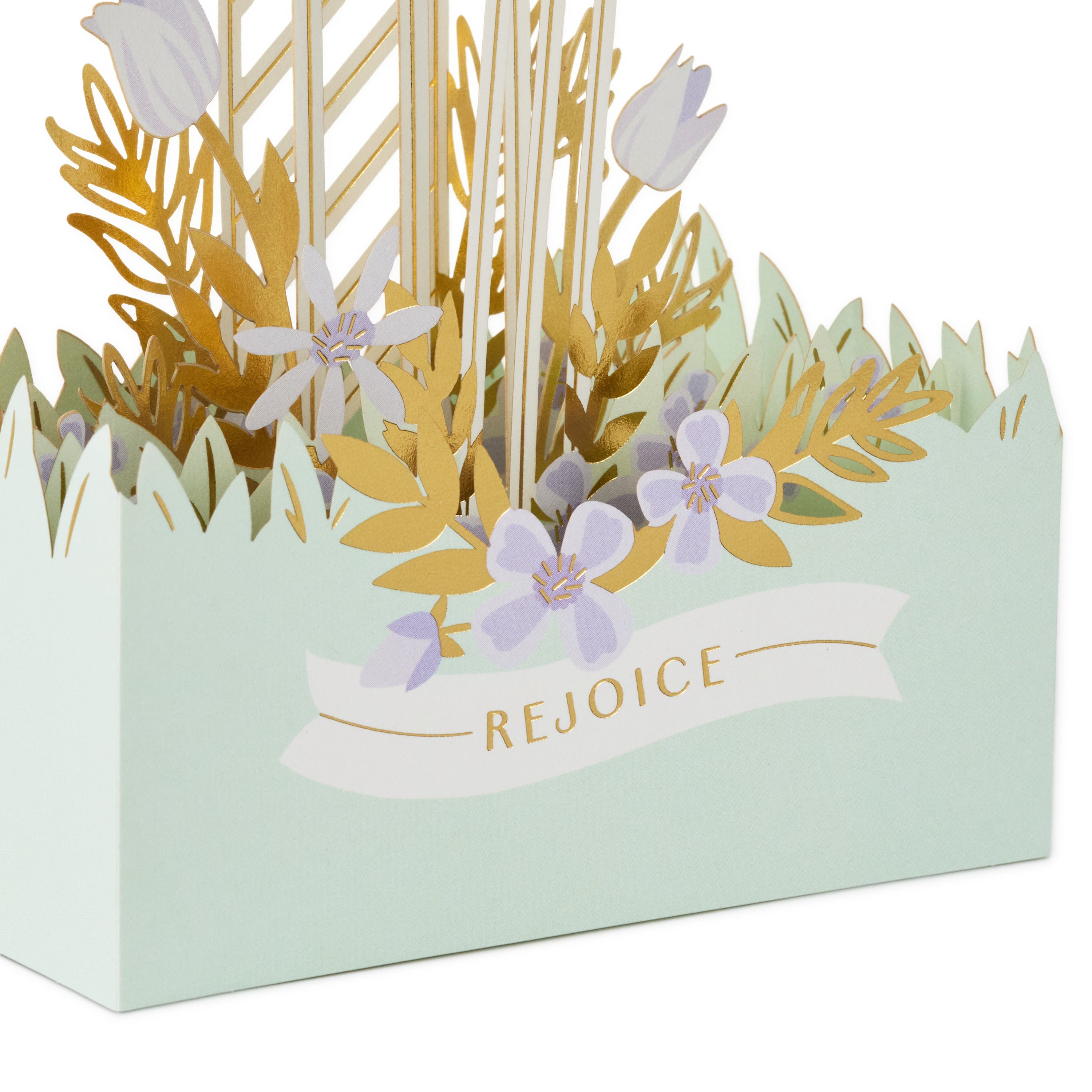 Rejoice in the blessings of Easter with this beautiful Paper Wonder pop-up card featuring a three-dimensional diorama of a white cross nestled in a serene meadow of purple flowers and shimmering gold leaves. A simple message of faith accompanies the intricate design, while the base includes space for your own personal message. Perfect for Easter, or other occasions like First Communion, Confirmation, Baptism and more, this beautiful card makes a lovely keepsake they will cherish for years to come.