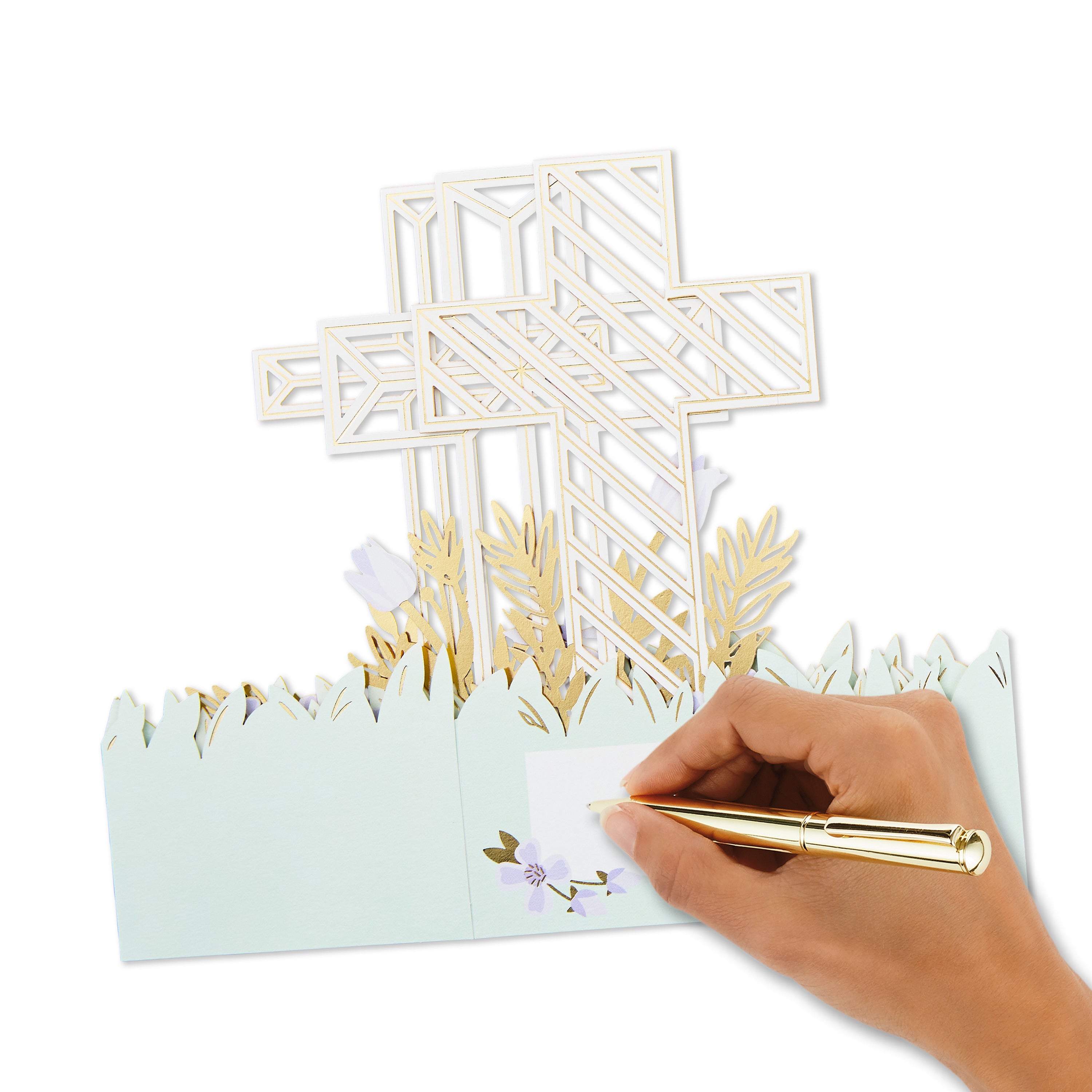 Printed on high quality board, with a simple, 'squeeze to pop-up' mechanism, this stunning card features an intricate die-cut, 3D cross design, with laser-cut details plus gold-foil highlights and lettering, and comes complete with a Hallmark branded white envelope.